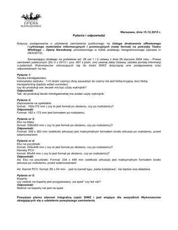 Warszawa, dnia 15.12.2015 r. Pytania i odpowiedzi Dotyczy postępowania o udzielenie zamówienia publicznego na Usługa drukowania offsetowego i cyfrowego materiałów informacyjnych i promocyjnych (mały format) na potrzeby Teatru Wielkiego – Opery Narodowej, prowadzonego w trybie przetargu nieograniczonego (sprawa nr 29/A/2015). Zamawiający działając na podstawie art. 38 ust 1 i 2 ustawy z dnia 29 stycznia 2004 roku - Prawo zamówień publicznych (Dz U z 2013 r. poz. 907 z późn. zm) zwanej dalej Ustawą, udziela poniżej informacji o pytaniach Wykonawców odnoszących się do treści SIWZ dotyczącej w/w postępowania oraz odpowiedziach na nie. Pytanie 1: Teczka introligatorska: kolorystyka zadruku : 1+0 (kolor czarny) chcę zauważyć że czarny nie jest farbą kryjącą, lecz farbą transparentną (będzie widać surowiec) czy do produkcji ww. teczek ma być użyty wykrojnik? Odpowiedź: Tak, do produkcji teczki introligatorskiej ma zostać użyty wykrojnik. Pytanie 2: Zaproszenie na spektakle: format : 162x172 mm ( czy to jest format po złożeniu, czy po rozłożeniu)? Odpowiedź: Format: 162 x 172 mm jest formatem po rozłożeniu. Pytanie nr 3: Etui na bilety format: 338x263 mm ( czy to jest format po złożeniu, czy po rozłożeniu)? Odpowiedź: Format: 338 x 263 mm (wielkość arkusza) jest maksymalnym formatem brutto arkusza po rozłożeniu, przed sztancowaniem Pytanie nr 4: Etui na pocztówki format: 234x448 mm ( czy to jest format po złożeniu, czy po rozłożeniu)? Karnety PCV format: 85x54 mm ( czy to jest format po złożeniu, czy po rozłożeniu)? Odpowiedź: Ad. Etui na pocztówki: Format: 234 x 448 mm (wielkość arkusza) jest maksymalnym formatem brutto arkusza po rozłożeniu, przed sztancowaniem Ad. Karnet PCV: format: 85 x 54 mm - jest to karnet typu „karta kredytowa”, nie będzie ona składana Pytanie nr 5: Koperty czy nadruk na koperty jest przygotowany „na spad” czy też nie? Odpowiedź: Nadruk na koperty nie jest na spad. Powyższe pismo stanowi integralną część SIWZ i jest wiążące dla wszystkich Wykonawców ubiegających się o udzielenie powyższego zamówienia.