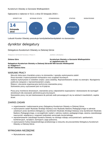 Kuratorium Oświaty w Gorzowie Wielkopolskim Ogłoszenie o naborze nr 5111 z dnia 03 listopada 2016 r. OFERTY DO WYMIAR ETATU STANOWISKA 1 1 14 listopada 2016 STATUS DODATKOWE archiwalny Lubuski Kurator Oświaty poszukuje kandydatów\kandydatek na stanowisko: dyrektor delegatury Delegatura Kuratorium Oświaty w Zielonej Górze MIEJSCE WYKONYWANIA PRACY: ADRES URZĘDU: Kuratorium Oświaty w Gorzowie Wielkopolskim ul. Jagiellończyka 10 Delegatura Kuratorium Oświaty w Zielonej Górze 66-400 Gorzów Wielkopolski ul. Podgórna 5 65-057 Zielona Góra Zielona Góra WARUNKI PRACY Warunki dotyczące charakteru pracy na stanowisku i sposobu wykonywania zadań: Praca biurowa z wykorzystaniem komputera oraz urządzeń biurowych. Zadania wykonywane w siedzibie urzędu i poza siedzibą. Reprezentowanie urzędu na zewnątrz. Wystąpienia publiczne związane z reprezentowaniem urzędu. Miejsce i otoczenie organizacyjno-techniczne stanowiska pracy Stanowisko pracy usytuowane jest na III piętrze. Praca przy monitorze ekranowym, stanowisko pracy odpowiednio wyposażone i dostosowane do wymagań określonych dla stanowisk administracyjno-biurowych. Stanowisko pracy nie jest dostosowane do potrzeb osób poruszających się na wózkach inwalidzkich, wąskie drzwi. ZAKRES ZADAŃ organizowanie i nadzorowanie pracy Delegatury Kuratorium Oświaty w Zielonej Górze, wykonywanie zadań Wydziału Strategii Edukacji oraz Wydziału Nadzoru Pedagogicznego w zakresie ustalonym przez dyrektora Delegatury z dyrektorem Wydziału Strategii Edukacji oraz dyrektorem Wydziału Nadzoru Pedagogicznego, w szczególności zadań z zakresu nadzoru pedagogicznego, awansu zawodowego nauczycieli, współpracy z organami jednostek samorządu terytorialnego, reprezentowanie Lubuskiego Kuratora Oświaty na różnego rodzaju uroczystościach, spotkaniach, konferencjach, naradach, komisjach z jego polecenia, wykonywanie funkcji bezpośredniego przełożonego w stosunku do pracowników Delegatury Kuratorium Oświaty w Zielonej Górze. WYMAGANIA NIEZBĘDNE Wykształcenie: wyższe Status nauczyciela lub nauczyciela akademickiego W przypadku nauczyciela: ukończenie studiów drugiego stopnia lub jednolitych studiów magisterskich, posiadanie co najmniej pięcioletniego stażu pracy pedagogicznej i: a) ukończone formy doskonalenia w zakresie administracji lub zarządzania lub b) co najmniej dwuletni staż pracy na stanowisku kierowniczym w szkole, placówce lub zakładzie kształcenia nauczycieli, lub c) co najmniej dwuletni staż pracy w urzędzie organu sprawującego nadzór pedagogiczny nad szkołami i placówkami lub w urzędzie organu prowadzącego szkoły lub placówki na stanowisku związanym z organizacją pracy szkół i placówek, W przypadku nauczyciela akademickiego: posiadanie co najmniej pięcioletniego stażu pracy w szkole wyższej i ukończone formy doskonalenia w zakresie administracji lub zarządzania Posiadanie obywatelstwa polskiego Korzystanie z pełni praw publicznych Nieskazanie prawomocnym wyrokiem za umyślne przestępstwo lub umyślne przestępstwo skarbowe WYMAGANIA DODATKOWE znajomość ustawy Karta Nauczyciela znajomość ustawy o systemie oświaty znajomość ustawy o służbie cywilnej znajomość ustawy Kodeks postępowania administracyjnego znajomość rozporządzenia w sprawie nadzoru pedagogicznego umiejętność kierowania ludźmi umiejętność podejmowania decyzji samodzielność, kreatywność, komunikatywność DOKUMENTY I OŚWIADCZENIA NIEZBĘDNE Życiorys/CV i list motywacyjny Kopie dokumentów potwierdzających spełnienie wymagania niezbędnego w zakresie wykształcenia Kopie dokumentów potwierdzających spełnienie wymagania niezbędnego w zakresie doświadczenia zawodowego / stażu pracy Kopia aktu nadania stopnia awansu zawodowego Oświadczenie o posiadaniu obywatelstwa polskiego albo kopia dokumentu potwierdzającego posiadanie polskiego obywatelstwa Oświadczenie o wyrażeniu zgody na przetwarzanie danych osobowych do celów naboru Oświadczenie o korzystaniu z pełni praw publicznych Oświadczenie o nieskazaniu prawomocnym wyrokiem za umyślne przestępstwo lub umyślne przestępstwo skarbowe TERMINY I MIEJSCE SKŁADANIA DOKUMENTÓW Dokumenty należy złożyć do: 14 listopada 2016 r. Decyduje data: stempla pocztowego / osobistego dostarczenia oferty do urzędu Miejsce składania dokumentów: Kuratorium Oświaty ul. Jagiellończyka 10 66-400 Gorzów Wielkopolski z dopiskiem "oferta zatrudnienia w służbie cywilnej na stanowisku dyrektor" INNE INFORMACJE: W miesiącu poprzedzającym datę upublicznienia ogłoszenia wskaźnik zatrudnienia osób niepełnosprawnych w urzędzie, w rozumieniu przepisów o rehabilitacji zawodowej i społecznej oraz zatrudnianiu osób niepełnosprawnych, wynosi co najmniej 6%. Dokumenty aplikacyjne powinny zawierać oświadczenia o treści wskazanej w ogłoszeniu, własnoręcznie podpisane i opatrzone aktualną datą, wzór oświadczenia jest do pobrania na stronie: http://goo.gl/xRS2ZG Oferty otrzymane po terminie (liczy się data stempla pocztowego) oraz niespełniające wymagań formalnych nie będą rozpatrywane. Pierwszym etapem rekrutacji będzie analiza formalna nadesłanych ofert. Informacje o osobach niezakwalifikowanych do następnego etapu rekrutacji oraz o osobach zakwalifikowanych do następnego etapu rekrutacji, a także informacje o terminie i formie następnego etapu naboru zostaną opublikowane w Biuletynie Informacji Publicznej Kuratorium Oświaty w Gorzowie Wielkopolskim. Oferty odrzucone zostaną komisyjnie zniszczone. Legenda Pierwszeństwo dla osób z niepełnosprawnościami Ogłoszenie z tym symbolem oznacza, że pierwszeństwo w zatrudnieniu mają osoby z niepełnosprawnościami, które spełniają wszystkie następujące warunki: • złożyły w terminie ofertę wraz z dokumentem potwierdzającym niepełnosprawność, • spełniają warunki wymienione w ogłoszeniu, • po rekrutacji znalazły się w gronie najlepszych kandydatów. Zast