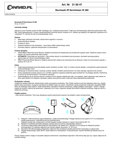 Art. Nr 31 00 47 Słuchawki IR Sennheiser IS 380 www.conrad.pl Słuchawki IR Sennheiser IS 380 Nr art. 31 00 47 Instrukcja obsługi Zakupiony przez Państwa system IS 380, składający się z nadajnika podczerwieni TI 380 oraz słuchawkowego odbiornika podczerwieni HDI 380, został zaprojektowany z myślą o bezprzewodowej transmisji danych w jakości Hi-Fi. Możesz go podłączyć do większości systemów Hi-Fi i zestawów TV i słuchać do woli nie przeszkadzając innym. Zawiera • Małą wagę, półotwarte słuchawki, ekstremalnie wygodne w noszeniu • Doskonałą jakość dźwięku • Prostotę w użyciu • Zasilanie bezpieczne dla środowiska – akumulatory NiMH wielokrotnego użytku • Kontrolery balansu i głośności bezpośrednio na słuchawkach Funkcje specjalne • Obwód ALC (“Automatic Level Control). Nadajnik automatycznie dopasowuje się do głośności sygnału audio. Zapewnia zawsze równy sygnał i tym samym gwarantuje stały przekaz. • AUTOMUTE (“Automatyczne wyciszane”). Gdy przekaz danych w słuchawkach jest przerwany, słuchawki wyciszają wyjście, wstrzymując tym samym przeszkadzający hałas. • TPS (“Transmitter Power Saving”). Nadajnik podczerwieni wyłącza się automatycznie po dłuższym czasie nie otrzymywania sygnału z systemu Hi-Fi lub TV. Zalety • Dzięki bezprzewodowej transmisji dźwięku jesteś niezależny od kabli. Tylko Ty możesz słuchać dźwięku i samodzielnie wybrać głośność nieprzeszkadzając innym! • Nawiązując do aktualnej wiedzy naukowej, przekaz dźwięku światłem podczerwonym nie niesie żadnego zagrożenia dla zdrowia. • Nowa częstotliwość przesyłu danych (2.3 i 2.8 Mhz) zapewnia najwyższą stabilność gdyż przedział ten nie podlega zjawisku interferencji ze strony tub fluorescencyjnych i kontrolerów cyfrowych. • Zasilanieodbywa się za pomocą wtyczki w zasilaczu.W ten sposób nadajnik jest mały i nie zawadza. Jeżeli zabierzesz swój zestaw na wieś, gdzie będzie inne napięcie w gniazdku, jedyną rzeczą którą musisz zrobić jest zakup odpowiedniej przejściówki. Środowisko i zdrowie Urządzenia zasilane bateriami wielokrotnego użytku są przyjazne środowisku. Ww. Źródło zasilania może być ładowane wiele razy. Zwykłe baterie wręcz przeciwnie, muszą być wyrzucane za każdym razem po zużyciu. Sennheiser używa przyjaznych środowisku akupaków NiMH które nie zawierają metali ciężkich. Jeżeli którykolwiek z akupaków zostanie uszkodzony, zostaje poddany recyklingowi – dealer u którego kupiłeś ten produkt, zabierze go spowrotem i wyposaży Cię w nowy, oryginalny akupak Sennheiser'a.(Metody recyklingu mogą się różnić w zależności od kraju). Pudełko zawiera... ...kilka różnych produktów. Twój nowy dźwiękowy system podczerwieni powinien się składać z pięciu komponentów: 1) 2) 3) 4) 5) Nadajnik TI 380 konwertuje sygnał dźwiękowy z wejścia słuchawkowego Twojego telewizora lub systemu Hi-Fi na niewidzalne światło podczerwone i rozprzestrzenia je po pomieszczeniu. Nadajnik posiada dwa zintegrowane schowki ładujące służące ładowaniu zużytych akumulatorów BA 151. Nadajnik (z podwójną jednostką ładującą) zasilany jest przy pomocy wtyczkowego zasilacza. Za pomocą załączonego kabla połączysz swój telewizor lub zestaw Hi-Fi. Wtyczka 3.5 mm pasuje do większości gniazd słuchawkowych. W zestawie załączony jest również adapter dla gniazd 1/4” (6.3 mm). Słuchawki HDI 380 posiadają zintegrowany odbiornik który przetwarza światło podczerwieni spowrotem w sygnał audio. Akupak wielokrotnego użytku BA151 zasila odbiornik w słuchawkach. Przed pierwszym użyciem MUSISZ go ładować przez 24 godziny. Proszę również zwrócić uwagę na wszystkie załączone dokumenty i specyfikacje regionalne. Dokumenty tego typu są z reguły załączone do instrukcji obsługi. Ustawianie nadajnika Ustaw nadajnik w pobliżu telewizora lub systemu hi-fi. Włączanie nadajnika aby podłączyć nadajnik TI 380 do gniazda (1) podłącz załączony kabel. Kabel ten następnie należy podłączyć do telewizora lub systemu hi-fi. Uwaga: Jeżeli Twój telewizor nie ma wejścia słuchawkowego, sygnał dźwiękowy może być odbierany również z gniazda SCART (wejście od magnetowidu). Odpowiedni adaptor można zamówić w firmie Sennheiser. Załączony zasilacz podłącz do gniazda (2) w nadajniku TI 380, następnie podłącz zasilacz do gniazda sieciowego. Kontroler poziomu w nadajniku Ustaw poziom głośności Twojego zestawu TV lub Hi-Fi na średni. Nadajnik TI 380 posiada wbudowany automatyczny kontroler modulacji który zapobiega nadmiernemu nagłośnieniu. Uruchamianie odbiornika Włóż akupak do schowka na baterie w odbiorniku słuchawek Zwróć szczególną uwagę na instrukcje przedstawione na poprzednich stronach tego podręcznika! Włączanie odbiornika słuchawek Użyj przycisku (3) aby włączyć odbiornik słuchawek. Poziom głośności możesz ustawić przyciskiem (4). Kontroler balansu (5) służy kompensacie różnic dźwięku między prawym a lewym kanałem. Ustawienia telewizora i zestawu Hi-Fi Proszę zwrócić uwagę na instrukcje obsługi Twojego zestawu Hi-Fi i/lub telewizora. Znajdziesz w nim informacje czy kontroler głośności dotyczy również wyjścia słuchawkowego, czy słuchawki posiadają osobny kontroler. W nowych telewizorach możesz reguować głośność wyjścia słuchawkowego niezależnie od głośników. W instrukcji znajdziesz również informacje jak wyłączyć głośniki. Wymiana osłon słuchawek Osłony uszu mogą być łatwo zdjęte ze słuchawek i wyczyszczone ciepłą wodą wymieszaną z odrobiną mydła. Jednakże od czasu do czasu, osłony na uszy powinny zostać wymienione z przyczyn higieny. Odpowiednie osłony można zamówić w sklepie Sennheisera. Wolne pole widzenia Światło podczerwone nadawane z nadajnika TI 380 emitowane jest w ten sam sposób co światło z normalnej żarówki. Ni