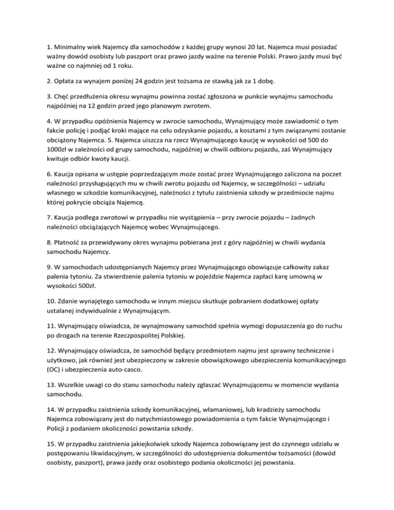 1. Minimalny wiek Najemcy dla samochodów z każdej grupy wynosi 20 lat. Najemca musi posiadać ważny dowód osobisty lub paszport oraz prawo jazdy ważne na terenie Polski. Prawo jazdy musi być ważne co najmniej od 1 roku. 2. Opłata za wynajem poniżej 24 godzin jest tożsama ze stawką jak za 1 dobę. 3. Chęć przedłużenia okresu wynajmu powinna zostać zgłoszona w punkcie wynajmu samochodu najpóźniej na 12 godzin przed jego planowym zwrotem. 4. W przypadku opóźnienia Najemcy w zwrocie samochodu, Wynajmujący może zawiadomić o tym fakcie policję i podjąć kroki mające na celu odzyskanie pojazdu, a kosztami z tym związanymi zostanie obciążony Najemca. 5. Najemca uiszcza na rzecz Wynajmującego kaucję w wysokości od 500 do 1000zł w zależności od grupy samochodu, najpóźniej w chwili odbioru pojazdu, zaś Wynajmujący kwituje odbiór kwoty kaucji. 6. Kaucja opisana w ustępie poprzedzającym może zostać przez Wynajmującego zaliczona na poczet należności przysługujących mu w chwili zwrotu pojazdu od Najemcy, w szczególności – udziału własnego w szkodzie komunikacyjnej, należności z tytułu zaistnienia szkody w przedmiocie najmu której pokrycie obciąża Najemcę. 7. Kaucja podlega zwrotowi w przypadku nie wystąpienia – przy zwrocie pojazdu – żadnych należności obciążających Najemcę wobec Wynajmującego. 8. Płatność za przewidywany okres wynajmu pobierana jest z góry najpóźniej w chwili wydania samochodu Najemcy. 9. W samochodach udostępnianych Najemcy przez Wynajmującego obowiązuje całkowity zakaz palenia tytoniu. Za stwierdzenie palenia tytoniu w pojeździe Najemca zapłaci karę umowną w wysokości 500zł. 10. Zdanie wynajętego samochodu w innym miejscu skutkuje pobraniem dodatkowej opłaty ustalanej indywidualnie z Wynajmującym. 11. Wynajmujący oświadcza, że wynajmowany samochód spełnia wymogi dopuszczenia go do ruchu po drogach na terenie Rzeczpospolitej Polskiej. 12. Wynajmujący oświadcza, że samochód będący przedmiotem najmu jest sprawny technicznie i użytkowo, jak również jest ubezpieczony w zakresie obowiązkowego ubezpieczenia komunikacyjnego (OC) i ubezpieczenia auto-casco. 13. Wszelkie uwagi co do stanu samochodu należy zgłaszać Wynajmującemu w momencie wydania samochodu. 14. W przypadku zaistnienia szkody komunikacyjnej, włamaniowej, lub kradzieży samochodu Najemca zobowiązany jest do natychmiastowego powiadomienia o tym fakcie Wynajmującego i Policji z podaniem okoliczności powstania szkody. 15. W przypadku zaistnienia jakiejkolwiek szkody Najemca zobowiązany jest do czynnego udziału w postępowaniu likwidacyjnym, w szczególności do udostępnienia dokumentów tożsamości (dowód osobisty, paszport), prawa jazdy oraz osobistego podania okoliczności jej powstania. 16. Odpowiedzialność finansowa Najemcy w razie wypadku (szkody komunikacyjnej) szkody parkingowej, kradzieży oraz szkód wyrządzonych wewnątrz pojazdu wiąże się z obowiązkowym udziałem własnym w wysokości od 500 do 2000zł w zależności od grupy samochodu. Najemca nie jest zwolniony z ponoszenia odpowiedzialności za szkody wyrządzone wewnątrz pojazdu . W razie konieczności udostępnienia danych kierującego na rzecz organów ścigania, Najemca zobowiązuje się do pokrycia wszystkich kosztów z tym związanych. 17. Najemca przyjmuje pełną odpowiedzialność za samochód od chwili jego przyjęcia do chwili jego zwrotu Wynajmującemu, w szczególności Najemca zobowiązuje się do pokrycia pełnych kosztów likwidacji szkody nie objętej ubezpieczeniem, a zwłaszcza szkody powstałej w okolicznościach: udostępnienia samochodu osobie nieuprawnionej, nietrzeźwości kierującego, palenia tytoniu w samochodzie, pozostawienia pojazdu niezabezpieczonego przed kradzieżą, zaistnienia kradzieży pojazdu z dokumentami lub kluczami, wyjazdu poza granice kraju bez uzyskania pisemnej zgody Wynajmującego, udziału wynajmowanym samochodem w samochodowych zawodach sportowych, oraz innych szkód wyłączonych z ubezpieczenia auto – casco (AC) na podstawie ogólnych warunków ubezpieczenia. 18. W przypadku gdyby samochód lub jego części zostały skradzione lub uległy uszkodzeniu w jakikolwiek sposób, z przyczyn leżących po stronie Najemcy lub osoby kierującej samochodem, Najemca obowiązany jest do łącznego spełnienia wymienionych obowiązków: zapłaty Wynajmującemu kwoty będącej sumą wartości wszystkich strat wynikających z tych zdarzeń, a w szczególności poniesionych przez Wynajmującego wydatków związanych z odzyskaniem lub naprawą samochodu lub zapłaty równowartości samochodu, pokrycia szkody wynikającej z utraty wartości samochodu, zapłaty Wynajmującemu równowartości utraty wpływów z wynajmu, stanowiącej iloczyn dni, w których Wynajmujący był pozbawiony możliwości korzystania z samochodu w ramach prowadzonej działalności i dziennej stawki z tytułu najmu samochodu. 19. W przypadku utraty kluczyków lub dokumentów samochodu Najemca zobowiązany jest do zapłaty Wynajmującemu wszystkich kosztów jakie wynajmujący poniesie w związku z ich utratą oraz zapłaci Wynajmującemu ekwiwalent za każdy dzień postoju samochodu spowodowany wyłączeniem pojazdu z możliwości wynajmu stanowiący iloczyn dni postoju oraz dziennej stawki wynajmu. 20. Zwrot pojazdu poza godzinami pracy biura nie zwalnia Najemcy z odpowiedzialności za wynajęty pojazd. Odpowiedzialność ta wygasa w chwili sprawdzenia pojazdu przez przedstawiciela. 21. Samochód wydawany jest Najemcy umyty oraz wyczyszczony wewnątrz.W przypadku zwrotu zabrudzonego pojazdu Najemca pokrywa koszty mycia samochodu w kwocie 60zł.22.W przypadku awarii wynajmowanego samochodu lub wypadku drogowego Wynajmujący dostarczy odpłatnie Najemcy samochód zastępczy w terminie do 24 godzin od momentu poinformowania Wynajmującego o tym fakcie. 23. Najemca zobowiązuje się do: korzystania z samochodu w sposób odpowiadający 