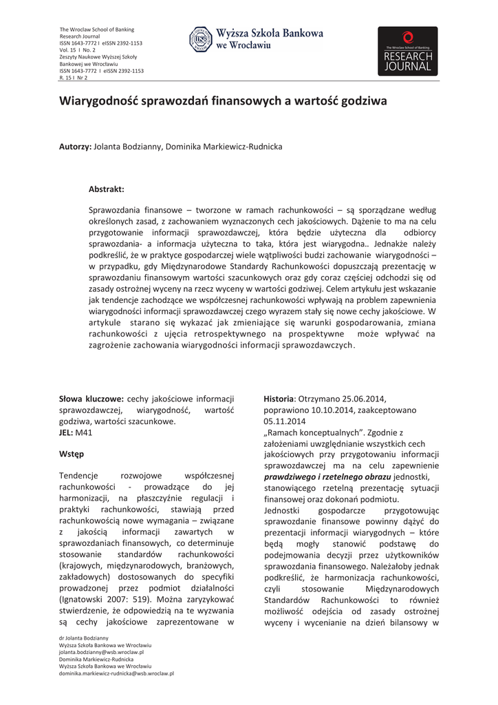 The Wroclaw School of Banking Research Journal ISSN 1643-7772 I Ğ/^^EϮϯϵϮͲϭϭϱϯ sŽů͘ϭϱ/EŽ͘Ϯ Zeszyty Naukowe Wyższej Szkoły Bankowej we Wrocławiu ISSN 1643-7772 I Ğ/^^EϮϯϵϮͲϭϭϱϯ Z͘ϭϱ/EƌϮ Wiarygodność sprawozdań finansowych a wartość godziwa Autorzy: Jolanta Bodzianny, Dominika Markiewicz-Rudnicka Abstrakt: Sprawozdania finansowe – tworzone w ramach rachunkowości – są sporządzane według określonych zasad, z zachowaniem wyznaczonych cech jakościowych. Dążenie to ma na celu przygotowanie informacji sprawozdawczej, która będzie użyteczna dla odbiorcy sprawozdania- a informacja użyteczna to taka, która jest wiarygodna.. Jednakże należy podkreślić, że w praktyce gospodarczej wiele wątpliwości budzi zachowanie wiarygodności – w przypadku, gdy Międzynarodowe Standardy Rachunkowości dopuszczają prezentację w sprawozdaniu finansowym wartości szacunkowych oraz gdy coraz częściej odchodzi się od zasady ostrożnej wyceny na rzecz wyceny w wartości godziwej. Celem artykułu jest wskazanie jak tendencje zachodzące we współczesnej rachunkowości wpływają na problem zapewnienia wiarygodności informacji sprawozdawczej czego wyrazem stały się nowe cechy jakościowe. W artykule starano się wykazać jak zmieniające się warunki gospodarowania, zmiana rachunkowości z ujęcia retrospektywnego na prospektywne może wpływać na zagrożenie zachowania wiarygodności informacji sprawozdawczych. Słowa kluczowe: cechy jakościowe informacji sprawozdawczej, wiarygodność, wartość godziwa, wartości szacunkowe. JEL: M41 Wstęp Tendencje rozwojowe współczesnej rachunkowości - prowadzące do jej harmonizacji, na płaszczyźnie regulacji i praktyki rachunkowości, stawiają przed rachunkowością nowe wymagania – związane z jakością informacji zawartych w sprawozdaniach finansowych, co determinuje stosowanie standardów rachunkowości (krajowych, międzynarodowych, branżowych, zakładowych) dostosowanych do specyfiki prowadzonej przez podmiot działalności (Ignatowski 2007: 519). Można zaryzykować stwierdzenie, że odpowiedzią na te wyzwania są cechy jakościowe zaprezentowane w Ěƌ:ŽůĂŶƚĂŽĚnjŝĂŶŶLJ tLJǏƐnjĂ^njŬŽųĂBĂŶŬŽǁĂǁĞtƌŽĐųĂǁŝƵ ũŽůĂŶtĂ͘ďŽĚnjŝĂŶŶLJΛǁƐď͘ǁƌŽĐůĂǁ͘Ɖů ŽŵŝŶŝŬĂDĂƌŬŝĞǁŝĐnjͲZƵĚŶŝĐŬĂ tLJǏƐnjĂ^njŬŽųĂBĂŶŬŽǁĂǁĞtƌŽĐųĂǁŝƵ ĚŽŵŝŶŝŬĂ͘ŵĂƌŬŝĞǁŝĐnjͲƌƵĚŶŝĐŬĂΛǁƐď͘ǁƌŽĐůĂǁ͘Ɖů ,ŝƐƚŽƌŝĂ͗KƚƌnjLJŵĂŶŽϮϱ͘Ϭϲ͘ϮϬϭϰ͕ ƉŽƉƌĂǁŝŽŶŽϭϬ͘ϭϬ͘ϮϬϭϰ͕njĂĂŬĐĞƉƚŽǁĂŶŽ Ϭϱ͘ϭϭ͘ϮϬϭϰ „Ramach konceptualnych”. Zgodnie z założeniami uwzględnianie wszystkich cech jakościowych przy przygotowaniu informacji sprawozdawczej ma na celu zapewnienie prawdziwego i rzetelnego obrazu jednostki, stanowiącego rzetelną prezentację sytuacji finansowej oraz dokonań podmiotu. Jednostki gospodarcze przygotowując sprawozdanie finansowe powinny dążyć do prezentacji informacji wiarygodnych – które będą mogły stanowić podstawę do podejmowania decyzji przez użytkowników sprawozdania finansowego. Należałoby jednak podkreślić, że harmonizacja rachunkowości, czyli stosowanie Międzynarodowych Standardów Rachunkowości to również możliwość odejścia od zasady ostrożnej wyceny i wycenianie na dzień bilansowy w The Wroclaw School of Banking Research Journal I ISSN 1643-7772 /Ğ/^^EϮϯϵϮͲϭϭϱϯI Vol. 15 I No. 2 opisywaną rzeczywistość (Kaczmarczyk 2008: 30-31). Natomiast jak podkreślają Hendriksen i van Breda „wyniki pomiaru są sprawdzalne, jeśli mogą być potwierdzone przez intersubiektywny konsensus wykwalifikowanych ekspertów […], sprawdzalność jest tym atrybutem informacji, który pozwala wykwalifikowanym osobom, działającymi niezależnie na podstawie tych samych dowodów, otrzymać zasadniczo zbliżone wyniki pomiaru bądź podobne wnioski” (Hendriksen, van Breda 2002:157). Neutralność zaś można interpretować jako wolność od stronniczości. Reasumując aby uznać informację za wiarygodną musi ona spełniać warunki wyznaczone przez Ramy konceptualne sporządzania i prezentacji sprawozdań finansowych, które zostały zaprezentowane w tabeli nr 1. wartościach godziwych. Jak pokazała praktyka gospodarcza zmiana rachunkowości z ujęcia retrospektywnego na prospektywne nie zawsze jest uzasadniona i może powodować, że sprawozdanie finansowe nie spełnia postulatu prawdziwego i rzetelnego obrazu. W wyniku pogłębiającego się kryzysu finansowego coraz częstsze są dyskusje pomiędzy praktykami i teoretykami rachunkowości nad zasadnością zastosowania wartości godziwej jako wyceny bilansowej. Niektórzy Autorzy dopatrują się w zasadach rachunkowości ukrytych przyczyn kryzysu finansowego(Helin 2012: 1). Wiarygodność jako cecha informacji sprawozdawczej jakościowa Wiarygodność to cecha, która budzi wiele kontrowersji. Jak zauważa Bronisław Micherda „w historycznym rozwoju rachunkowości obserwuje się nieustanną walkę w obronie wiarygodności, wobec coraz mocniej stawianych, a wynikających z rozwijających się szybko stosunków gospodarczych, postulatów uproszczeń” (Micherda 2003:466). Natomiast cytując za Angeliką Kaczmarczyk wiarygodność to: „zasługiwanie na zaufanie, pewność, rzetelność […] prawdziwość autentyczność i pewność”(Kaczmarczyk 2005: 245). Jak podkreślają Eldon Hendriksen i Michael van Breda wiarygodność jest nadrzędną cechą informacji nastawionych na proces decyzyjny i gwarantuje, że procesy te w rozsądnych granicach są wolne od błędów i stronniczości oraz wiernie przedstawiają to, co zamierzano przedstawić (Hendriksen, van Breda 2002:155). Ponadto wiarygodność to funkcja: wierności przedstawianych zjawisk, sprawdzalności i neutralności. Aby informacja była wiarygodna musi wiernie odzwierciedlać rzeczywistoś