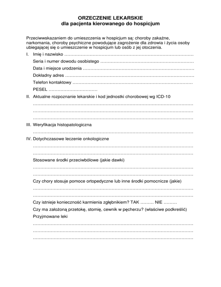 ORZECZENIE LEKARSKIE dla pacjenta kierowanego do hospicjum Przeciwwskazaniem do umieszczenia w hospicjum s : choroby zaka ne, narkomania, choroby psychiczne powoduj ce zagro enie dla zdrowia i ycia osoby ubiegaj cej si o umieszczenie w hospicjum lub osób z jej otoczenia. I. Imi i nazwisko …………………………………………………………………………… Seria i numer dowodu osobistego ……………………………………………………… Data i miejsce urodzenia ………………………………………………………………… Dokładny adres …………………………………………………………………………… Telefon kontaktowy ……………………………………………………………………… PESEL …………………………… II. Aktualne rozpoznanie lekarskie i kod jednostki chorobowej wg ICD-10 ……………………………………………………………………………………………… ……………………………………………………………………………………………… ……………………………………………………………………………………………… III. Weryfikacja histopatologiczna ……………………………………………………………………………………………… IV. Dotychczasowe leczenie onkologiczne ……………………………………………………………………………………………… ……………………………………………………………………………………………… Stosowane rodki przeciwbólowe (jakie dawki) ……………………………………………………………………………………………… ……………………………………………………………………………………………… Czy chory stosuje pomoce ortopedyczne lub inne rodki pomocnicze (jakie) ……………………………………………………………………………………………… ……………………………………………………………………………………………… Czy istnieje konieczno karmienia zgł bnikiem? TAK ……… NIE ……… Czy ma zało on przetok , stomi , cewnik w p cherzu? (wła ciwe podkre li ) Przyjmowane leki ……………………………………………………………………………………………… ……………………………………………………………………………………………… ……………………………………………………………………………………………… V. Wyniki aktualnego badania lekarskiego: a. wyniki bada rutynowych i dodatkowych, mog by uj te w karcie informacyjnej z placówki słu by zdrowia, któr nale y doł czy do niniejszego skierowania ………………………………………………………………………………………… ………………………………………………………………………………………… b. stan obecny oraz terapia proponowana przez lekarza kieruj cego ………………………………………………………………………………………… ………………………………………………………………………………………… ………………………………………………………………………………………… ………………………………………………………………………………………… c. choroby współistniej ce ………………………………………………………………………………………… ………………………………………………………………………………………… gru lica tak / nie narkomania tak / nie choroby psychiczne tak / nie choroby zaka ne tak / nie VI. W przypadku osoby ubezwłasnowolnionej lub chorej, bez mo liwo ci nawi zania kontaktu, nale y poda nazwisko i imi osoby udzielaj cej wywiadu i ewentualnie stopie pokrewie stwa z badanym. ……………………………………………………………………………………………… ……………………………………………………………………………………………… VII. Nieodł cznym warunkiem niniejszego skierowania do hospicjum jest o wiadczenie podpisane przez rodzin lub osob opiekuj c si chorym, oraz deklaracja wyboru hospicjum i dowód ubezpieczenia zdrowotnego. …………………………………… …………………………………… Miejscowo Podpis i piecz i data lekarza kieruj cego …………………………………… Piecz Zakładu Słu by Zdrowia