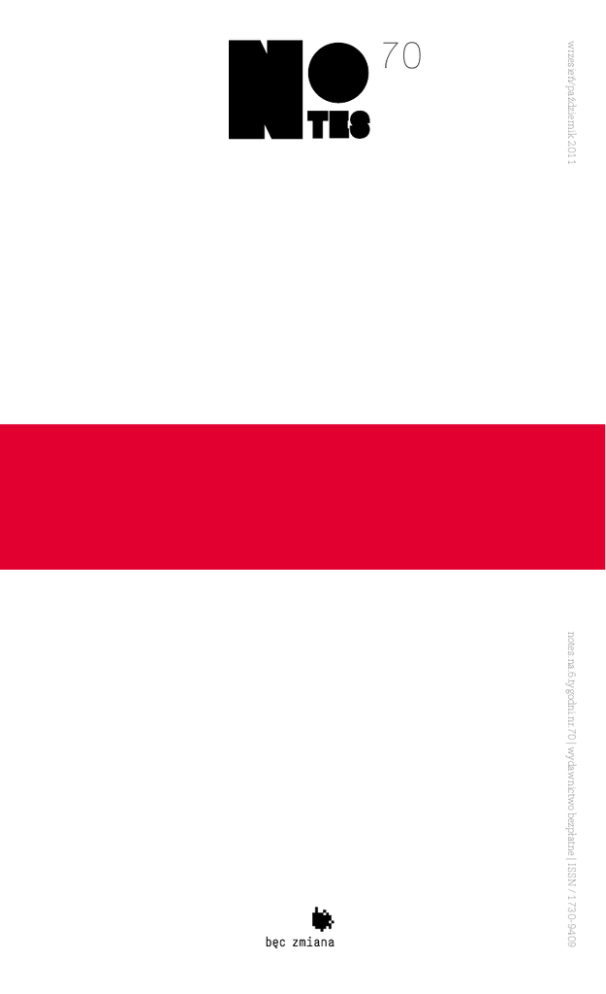 notes.na.6.tygodni.nr.70 | wydawnictwo bezpłatne | ISSN / 1730-9409 1 notes 70 / 09–10.2011 / orientuj się wrzesień/październik 2011 70 na.6.tygodni. ORIENTUJ SIĘ! 7 – 88 ZMIANA MY-RZĄD Protestujący Europejczycy domagają się partycypacji w procesach demokratycznych, współdecydowania o kształcie państwa oraz radykalnych zmian w systemie ekonomicznym. Model demokracji przedstawicielskiej zapada się na naszych oczach. Czy jedyną drogą jest społeczeństwo obywatelskie, które samodzielnie decyduje o przyszłości swojego regionu i państwa? O polskich pomysłach na zwiększenie partycypacji i problemach, jakie z tego mogą wynikać – z Alkiem Tarkowskim, współautorem projektu Otwartego rządu, rozmawia Bogna Świątkowska 9 – 88 PRAKTYKI ARTYSTYCZNE FABRYKANT Interesuje mnie taki prosty eksperyment psychologiczny, czy kiedy schowam się w galerii, będąc elementem ekspozycji i leżąc nieruchomo w kostiumie i ktoś wejdzie do takiej sali, to czy będzie czuł emanację psychiczną? Czy fakt, że ktoś jest w tym wnętrzu, wpłynie na jego postrzeganie całości? Pociągające jest móc podejrzeć reakcję widzów na swoje prace – z Janem Mioduszewskim, twórcą, właścicielem i jedynym pracownikiem Fabryki Mebli, rozmawiają Magda Roszkowska i Arek Gruszczyński 90 – 99 PRAKTYKI KURATORSKIE PROJEKTY WYBRANE Dobrze opracowane wystawy, na których zestawia się obok siebie różne postawy i doświadczenia, są ciągle silniejsze niż popularne obecnie duże wydarzenia festiwalowo-targowe, które przybliżają temat szerokiej publiczności, ale tak naprawdę brakuje w nich wyraźnych komunikatów, pogłębionej refleksji – mówi kurator wystawy Projekty wybrane Romuald Demidenko w rozmowie z Magdaleną Ziębą 100 – 111 Organizator 70 | wrzesień | październik 2011 PRAKTYKI ARTYSTYCZNE LUDZIE „NIKT” KOMENTUJĄ ŚWIAT Jej prace są dowodem wrażliwości na zjawiska społeczne, mimo że nie powstają jako sztuka zaangażowana, komentująca, krytyczna. Tworzy, wykorzystując najprostsze materiały: słomę, sznurek, obiekty znalezione. Jest wymieniana za granicą wśród najciekawszych artystów jej pokolenia, w Polsce nieczęsto miała okazję wystawiać. Z artystką Agnieszką Kalinowską, tuż przed otwarciem jej wystawy Wygasłe neony, rozmawiają Arek Gruszczyński i Bogna Świątkowska 112 –123 partycypacja MY – RZĄD Protestujący Europejczycy domagają się partycypacji w procesach demokratycznych, współdecydowania o kształcie państwa oraz radykalnych zmian w systemie ekonomicznym. Model demokracji przedstawicielskiej zapada się na naszych oczach. Czy jedyną drogą jest społeczeństwo obywatelskie, które samodzielnie decyduje o przyszłości swojego regionu i państwa? O polskich pomysłach na zwiększenie partycypacji i problemach, jakie z tego mogą wynikać – z Alkiem Tarkowskim, współautorem projektu Otwartego rządu, rozmawia Bogna Świątkowska 124 –135 EKONOMIA KULTURY. POSTAWY ALTERNATYWA JAKO PLAN B Myśmy żadnej rzeczy w historii Wyspy nie zrobili na zasadzie urealnionego rachunku ekonomicznego, ponieważ tak się nie da. I każda z osób, która zna się na ekonomii czy marketingu, mówi, że to się nie uda. A ktokolwiek widział, jak Wyspa działa, to mówił, że to niemożliwe. A jak widzimy – jest możliwe – z Anetą Szyłak, współzałożycielką i dyrektorką Instytutu Sztuki Wyspa i wiceprezeską Fundacji Wyspa Progress 136 – 149 FA-ART W NOTESIE.NA.6.TYGODNI TEORETYCZNY ZAWRÓT GŁOWY 150 –159 GDZIE BYWA NOTES 160 Patroni 2 notes 70 / 09–10.2011 / orientuj się notes 70 / 09–10.2011 / orientuj się 3 WYDAWCA: Fundacja Nowej Kultury Bęc Zmiana SZEFOWA FNKBZ: Bogna Świątkowska [email protected] ADRES REDAKCJI: ul. Mokotowska 65/7, 00-533 Warszawa, t: +48 22 625 51 24, +48 22 827 64 62, m: +48 516 802 843, e: [email protected] BĘC: Drążek (Ostre Koło), Arek Gruszczyński, Magda Roszkowska, Ewa Paradowska (Bęc Sklep Wielobranżowy), Paulina Witek, Paulina Jeziorek, Szymon Żydek, Ewa Dyszlewicz. Departament Publikacji: Ela Petruk, Paulina Sieniuć TEKSTY: Arek Gruszczyński, Magda Roszkowska (Orientuj się!), Pani Bogna (Redaktor), Magdalena Zięba oraz gościnnie „FA-art” Orientuj się: Informacje i ilustracje pochodzą z materiałów prasowych promujących wydarzenia kulturalne; drukujemy je dzięki uprzejmości artystów, kuratorów, galerii, instytucji oraz organizacji [kulturalnych]. Projekt: Laszuk, Hegman RADA FNKBZ: Maksymilian Cegielski, Kuba Bałdyga, Przemek Bogdanowicz, Kamil Dąbrowa, Paweł Dunin-Wąsowicz, Grzegorz Dyduch i Marcin Świetlicki, Łukasz Gorczyca, Robert Majkut, Ewa Moisan, Sławomir Pietrzak, Jacek Poremba, Kuba Wojewódzki Korekta: Hegman Znak FNKBZ: Małgorzata Gurowska [email protected] JAK OTRZYMAĆ NOTES: Zasil Bęca (ING BŚ 02 1050 1038 1000 0023 3025 8183 z dopiskiem „Na rozwój FNKBZ”) darowizną minimum 11 PLN, prześlij nam o tym wiadomość na adres [email protected], podaj adres, pod jaki mamy wysłać wybrany przez ciebie numer nn6t, a my wyślemy ci go pocztą priorytetową natychmiast. Większe wpłaty przyjmiemy entuzjastycznie! WYCZERPANIA: Uprzejmie informujemy, że nakład numeru 1, 2, 4, 7, 8, 9, 15, 20, 24_26, 27, 28, 29, 37, 41, 44, 45, 48, 49, 50, 51, 54, 55, 56, 57, 58, 60, 61, 62, 63, 64, 65, 66, 67, 68 został przez was wyczerpany. Bardzo nas to cieszy. Dziękujemy! na.6.tygodni. 29.08 pon 30.08 wt 31.08 śr 1.09 czw 2.09 pt 3.09 sob 4.09 nd 5.09 pon 6.09 wt 7.09 śr 8.09 czw 9.09 pt 10.09 sob 11.09 nd 12.09 pon 13.09 wt 14.09 śr 15.09 czw 16.09 pt 17.09 sob 18.09 nd 19.09 pon 20.09 wt 21.09 śr 22.09 czw 23.09 pt 24.09 sob 25.09 nd 26.09 pon 27.09 wt 28.09 śr 29.09 czw 30.09 pt 1.10 sob 2.10 nd 3.10 pon 4.10 wt 5.10 śr 6.10 czw 7.10 pt 8.10 sob 9.10 nd www.funbec.eu Bęc Sklep Wielobranżowy: łomo aparaty, książki, dizajn Warszawa, Mokotowska 65, pon.–pt. 13.00–20.00 www.funbec.eu/sklep / +48 665 090 367 Informacje, za
