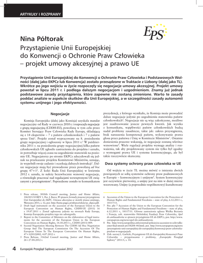 ARTYKUŁY I ROZPRAWY Nina Półtorak Przystąpienie Unii Europejskiej do Konwencji o Ochronie Praw Człowieka – projekt umowy akcesyjnej a prawo UE Przystąpienie Unii Europejskiej do Konwencji o Ochronie Praw Człowieka i Podstawowych Wolności (dalej jako EKPCz lub Konwencja) zostało przesądzone w Traktacie z Lizbony (dalej jako TL). Wkrótce po jego wejściu w życie rozpoczęły się negocjacje umowy akcesyjnej. Projekt umowy powstał w lipcu 2011 r. i podlega dalszym negocjacjom i uzgodnieniom. Znamy już jednak podstawowe zasady przystąpienia, które zapewne nie zostaną zmienione. Warto te zasady poddać analizie w aspekcie skutków dla Unii Europejskiej, a w szczególności zasady autonomii systemu unijnego i jego efektywności. Negocjacje Komisja Europejska (dalej jako Komisja) uzyskała mandat negocjacyjny od Rady w czerwcu 2010 r. i rozpoczęła negocjacje z grupą negocjacyjną (CDDH-EU), powołaną w tym celu przez Komitet Sterujący Praw Człowieka Rady Europy, składającą się z 14 ekspertów – 7 z państw członkowskich i 7 z państw spoza Unii1. Projekt został wypracowany na 8. posiedzeniu grupy negocjacyjnej i ogłoszony w lipcu 2011 r.2 W październiku 2011 r. na posiedzeniu grupy negocjacyjnej kilka państw członkowskich UE zgłosiło zastrzeżenia do projektu i uznało, że potrzebuje więcej czasu na uzgodnienie stanowisk na poziomie UE. Negocjatorzy po stronie EKPCz zdecydowali się jednak na przekazanie projektu Komitetowi Ministrów, uznając, że wypełnili swoje zadanie i oczekują dalszych instrukcji3. Dalsze negocjacje mają być prowadzone przez powołaną ad hoc grupę 47+14. Z kolei Rada Unii Europejskiej w kwietniu 2012 r. uznała, że należy bezzwłocznie wznowić negocjacje, a równolegle pracować nad regulacjami wewnętrznymi UE związanymi z przystąpieniem5. Poprzedzone zostało to komunikatem 1 Press release, 3018th Council meeting, Justice and Home Affairs, 10630/1/10 REV 1. Por. J. Barcz, W sprawie formuły prawnej przystąpienia Unii Europejskiej do EKPC. Umowa akcesyjna w świetle prawa unijnego, Warszawa 2011, s. 12, por. http://home.pages.at/mbarcz/teksty/ue_ekpcz.pdf. 2 Draft legal instrument on the accession of the European Union to the European Convention on Human Rights, CDDH-UE (2011) 16 z 19.07.2011 r. Został ogłoszony jedynie na stronach Rady Europy, Komisja Europejska projektu tego nie udostępniła. 3 Report to the Committee of Ministers on the elaboration of legal instruments for the accession of the European Union to the European Convention on Human Rights, 14.10.2011 r., CDDH (2011) 009. 4 Second Negotiation Meeting Between The CDDH Ad Hoc Negotiation Group And The European Commission On The Accession Of The European Union To The European Convention On Human Rights, 47+1(2012)002, 4.07.2012 r. 5 Press Release, 3162nd Council meeting, Justice and Home Affairs, 26 i 27.04.2012 r. 4 Europejski Przegląd Sądowy wrzesień 2012 prezydencji, z którego wynikało, że Komisja może prowadzić dalsze negocjacje jedynie po uzgodnieniu stanowiska państw członkowskich6. Negocjacje nie są więc zakończone, możliwe jest zaadresowanie jeszcze pewnych kwestii. Jak wynika z komunikatu, wątpliwości państw członkowskich budzą nadal problemy zasadnicze, takie jak: zakres przystąpienia, brak naruszenia kompetencji państw, wykonywanie prawa głosu przez państwa i Unię w Komitecie Ministrów7. Ostatnie doniesienia prasowe wskazują, że negocjacje zostaną wkrótce wznowione8. Wiele regulacji projektu wymaga analizy i rozważenia, tak aby projektowany system nie tylko był zgodny z wymogami prawa UE i systemu konwencyjnego, ale był także rzeczywiście skuteczny. Dwa systemy ochrony praw człowieka w UE Od wejścia w życie TL można mówić o istnieniu dwóch powiązanych ze sobą systemów ochrony praw podstawowych w Europie – konwencyjnym i unijnym9. System konwencyjny jest oczywiście pierwotny, a unijny jest na nim w dużej mierze wzorowany. Unijny (a poprzednio wspólnotowy) kształtowany 6 Accession of the Union to the European Convention for the Protection of Human Rights and Fundamental Freedoms – state of play, 6.12.2011 r., 18117/11. 7 Por. pkt 7 Accession of the Union to the European Convention for the Protection of Human Rights and Fundamental Freedoms – state of play, 6.12.2011 r., 18117/11. Główne zastrzeżenia zgłasza Wielka Brytania i Francja, zob. stanowisko Helsińskiej Fundacji Praw Człowieka, Apel do ambasadorów w sprawie przystąpienia UE do EKPCz, por. http://www. europapraw.org/news/apel-do-ambasadorow. 8 Por. http://www.europolitics.info/external-policies/eu-accession-to-echr-talksenter-final-stretch-art338208–44.html; por. http://www.europapraw.org/news /przystapienie-unii-europejskiej-do-europejskiej-konwencji-praw-czlowiekaprzelom-w-negocjacjach. 9 Zob. szerzej L. Garlicki, Przystąpienie UE do Europejskiej Konwencji Praw Człowieka – przygotowania i problemy, „Europejski Przegląd Sądowy” 2011/1, s. 14. ARTYKUŁY I ROZPRAWY był od dawna, pierwotnie przez orzecznictwo Trybunału Sprawiedliwości (dalej jako TS) z lat 70. XX w.10, a następie zmiany legislacyjne. W aktach prawa Wspólnoty Europejskiej prawa podstawowe pojawiły się najpierw w preambule do Jednolitego Aktu Europejskiego, a później w art. 6 (art. F) Traktatu o Unii Europejskiej z 1992 r. stanowiącym, że Unia szanuje prawa podstawowe zagwarantowane w Konwencji. Kwintesencją tych zmian było przyznanie Karcie Praw Podstawowych (dalej jako KPP) mocy równej traktatom, co nastąpiło w TL obowiązującym od 1.12.2009 r. Połączenie tych dwóch już obecnie powiązanych systemów nastąpić ma poprzez przystąpienie UE do EKPCz. Idea przystąpienia UE (a wcześniej WE) do EKPCz nie jest oczywiście nowa11. Komisja zaproponowała Radzie po raz pierwszy formalne przystąpienie do EKPCz w „Memorandum w sprawie przystąpienia Wspólnot Europejskich do Konwencji o ochronie praw człowieka i podstawowych wolności