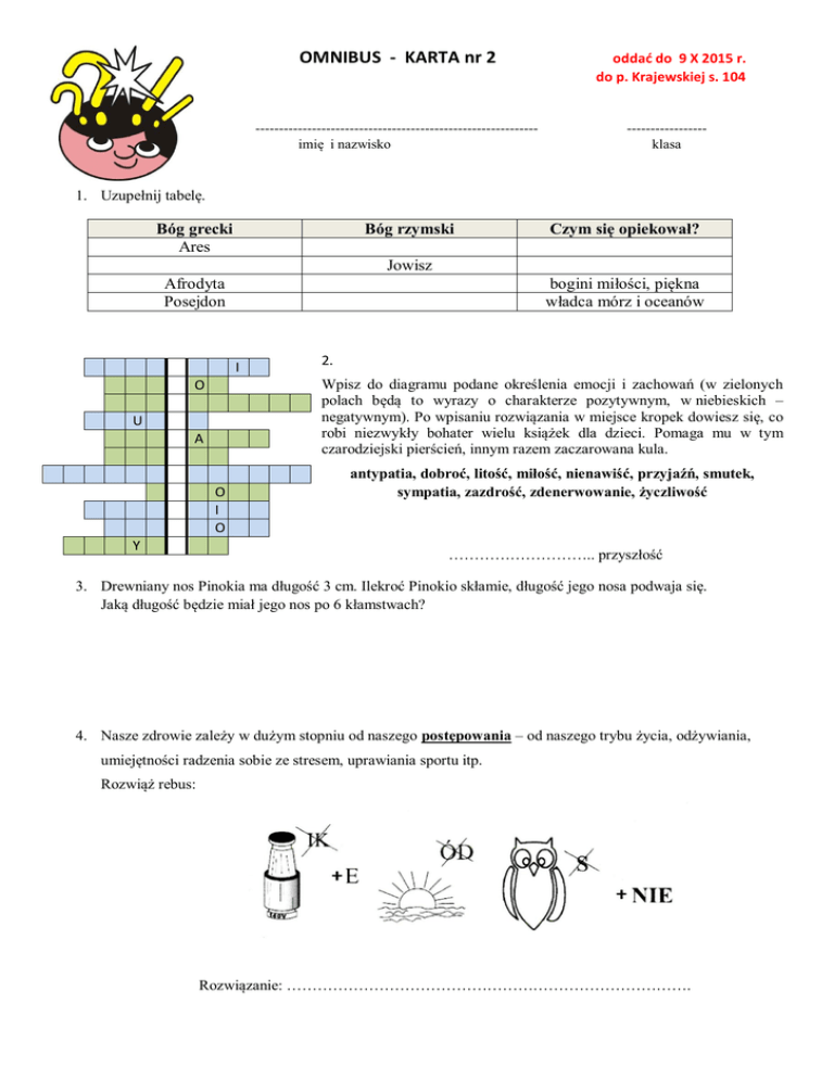 OMNIBUS - KARTA nr 2 oddać do 9 X 2015 r. do p. Krajewskiej s. 104 ------------------------------------------------------------ ----------------- imię i nazwisko klasa 1. Uzupełnij tabelę. Bóg grecki Ares Bóg rzymski Czym się opiekował? Jowisz bogini miłości, piękna władca mórz i oceanów Afrodyta Posejdon I Wpisz do diagramu podane określenia emocji i zachowań (w zielonych polach będą to wyrazy o charakterze pozytywnym, w niebieskich – negatywnym). Po wpisaniu rozwiązania w miejsce kropek dowiesz się, co robi niezwykły bohater wielu książek dla dzieci. Pomaga mu w tym czarodziejski pierścień, innym razem zaczarowana kula. O U A O I O Y 2. antypatia, dobroć, litość, miłość, nienawiść, przyjaźń, smutek, sympatia, zazdrość, zdenerwowanie, życzliwość ……………………….. przyszłość 3. Drewniany nos Pinokia ma długość 3 cm. Ilekroć Pinokio skłamie, długość jego nosa podwaja się. Jaką długość będzie miał jego nos po 6 kłamstwach? 4. Nasze zdrowie zależy w dużym stopniu od naszego postępowania – od naszego trybu życia, odżywiania, umiejętności radzenia sobie ze stresem, uprawiania sportu itp. Rozwiąż rebus: Rozwiązanie: ……………………………………………………………………. 5. Uzupełnij tabelę:. Skala liczbowa Podziałka liniowa Skala mianowana 1 cm – ……………… cm 1 : 20 000 000 1 cm – ………….…… m 1 cm – ……………… km 1 cm – ……………… cm 1 cm – 60 m 1 cm – ……………… km 1 cm – ……………… cm 1 cm – ………….…… m 1 cm – ……………… km 0 5 10 15 20 km