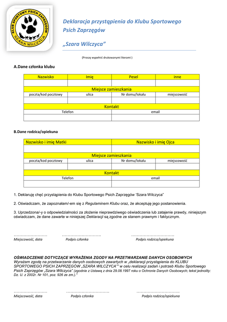 Deklaracja przystąpienia do Klubu Sportowego Psich Zaprzęgów „Szara Wilczyca” (Proszę wypełnić drukowanymi literami ) A.Dane członka klubu Nazwisko Imię poczta/kod pocztowy ulica Pesel inne Miejsce zamieszkania Nr domu/lokalu miejscowość Kontakt Telefon email B.Dane rodzica/opiekuna Nazwisko i imię Matki Nazwisko wisko i imię Ojca Miejsce zamieszkania poczta/kod pocztowy ulica Nr domu/lokalu miejscowość Kontakt Telefon email 1. Deklaruję chęć przystąpienia do Klubu Sportowego Psich Zaprzęgów ‘Szara Wilczyca” em się z Regulaminem Klubu oraz, że akceptuję jego postanowienia. 2. Oświadczam, że zapoznałam/-em oświadczenia lub zatajenie prawdy, niniejszym 3. Uprzedzona/-yy o odpowiedzialności za złożenie nieprawdziwego oświadczenia oświadczam, że dane zawarte w niniejszej Deklaracji są zgodne ze stanem prawnym i faktycznym. …………………… Miejscowość, data ……………… ………………………. Podpis członka …………………………. Podpis rodzica/opiekuna OŚWIADCZENIE DOTYCZĄCE WYRAŻENIA ZGODY NA PRZETWARZANIE DANYCH OSOBOWYCH Wyrażam zgodę na przetwarzanie danych osobowych zawartych w „deklaracji przystąpienia do KLUBU SPORTOWEGO PSICH ZAPRZĘGÓW „SZARA WILCZYCA”” w celu realizacji zadań i potrzeb Klubu Sportowego Psich Zaprzęgów „Szara Wilczyca” (zgodnie z Ustawą z dnia 29.08.1997 roku o Ochronie Danych Osobowych; tekst jednolity: Dz. U. z 2002r. Nr 101, poz. 926 ze zm.)." …………………… Miejscowość, data …………………………. Podpis członka …………………………. Podpis rodzica/opiekuna Podpis