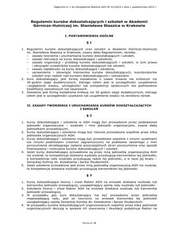 Załącznik nr 1 do Zarządzenia Rektora AGH Nr 41/2015 z dnia 1 października 2015 r. Regulamin kursów dokształcających i szkoleń w Akademii Górniczo-Hutniczej im. Stanisława Staszica w Krakowie I. POSTANOWIENIA OGÓLNE §1 1. Regulamin kursów dokształcających oraz szkoleń w Akademii Górniczo-Hutniczej im. Stanisława Staszica w Krakowie, zwany dalej Regulaminem, określa: ‒ zasady tworzenia i uruchamiania kursów dokształcających i szkoleń, ‒ zasady rekrutacji na kursy dokształcające i szkolenia, ‒ zasady organizacji i przebieg kursów dokształcających i szkoleń, w tym prawa i obowiązki uczestników kursów dokształcających lub szkoleń, ‒ zasady odpłatności za kursy dokształcające i szkolenia, ‒ uprawnienia i obowiązki kierownika kursów dokształcających, koordynatorów szkoleń oraz nadzór nad kursami dokształcającymi i szkoleniami. 2. Kurs dokształcający jest formą kształcenia o czasie trwania nie krótszym niż 30 godzin zajęć dydaktycznych, którego celem jest w szczególności uzupełnienie i pogłębienie wiedzy, umiejętności lub kompetencji społecznych lub podniesienie kwalifikacji zawodowych lub naukowych. 3. Szkolenie jest formą kształcenia krótszą niż 30 godzin zajęć dydaktycznych, którego celem jest w szczególności uzyskanie lub uzupełnienie wiedzy na określony temat. II. ZASADY TWORZENIA I URUCHAMIANIA KURSÓW DOKSZTAŁCAJĄCYCH I SZKOLEŃ §2 1. Kursy dokształcające i szkolenia w AGH mogą być prowadzone przez podstawowe jednostki organizacyjne – wydziały i inne jednostki organizacyjne, zwane dalej jednostkami prowadzącymi. 2. Kursy dokształcające i szkolenia mogą być również prowadzone wspólnie przez kilka jednostek organizacyjnych AGH. 3. Kursy dokształcające i szkolenia mogą być prowadzone wspólnie z innymi uczelniami lub innymi podmiotami (również zagranicznymi) na podstawie zawartego z nimi porozumienia określającego zadania poszczególnych stron porozumienia oraz sposób finansowania i rozliczania kursów dokształcających i szkoleń. 4. Jeżeli kursy dokształcające prowadzone są przez inną jednostkę organizacyjną AGH niż wydział, to kompetencje dziekana wydziału przysługują kierownikowi tej jednostki, a kompetencje rady wydziału przysługują radzie tej jednostki, a w razie jej braku – Senackiej Komisji ds. Kształcenia i Spraw Studenckich. 5. Jeżeli szkolenie prowadzone jest przez inną jednostkę organizacyjną AGH niż wydział, to kompetencje dziekana wydziału przysługują kierownikowi tej jednostki. §3 1. Kursy dokształcające tworzy i znosi Rektor AGH na wniosek dziekana wydziału lub kierownika jednostki prowadzącej, uwzględniający opinię rady wydziału lub jednostki. 2. Szkolenia tworzy i znosi Rektor AGH na wniosek dziekana wydziału lub kierownika jednostki prowadzącej. 3. W przypadku gdy kurs dokształcający ma być prowadzony przez jednostkę nieposiadającą rady, jest on tworzony na wniosek kierownika tej jednostki uwzględniający opinię Senackiej Komisji ds. Kształcenia i Spraw Studenckich. 4. W przypadku kursów dokształcających organizowanych wspólnie przez kilka jednostek organizacyjnych decyzję w sprawie ich utworzenia i likwidacji podejmuje Rektor na Strona 1 z 6 Załącznik nr 1 do Zarządzenia Rektora AGH Nr 41/2015 z dnia 1 października 2015 r. wniosek wszystkich zainteresowanych dziekanów/kierowników jednostek prowadzących, uwzględniając opinię rad tych jednostek lub Senackiej Komisji ds. Kształcenia i Spraw Studenckich. 5. W przypadku szkoleń organizowanych wspólnie przez kilka jednostek organizacyjnych decyzję w sprawie ich utworzenia i likwidacji podejmuje Rektor na wniosek wszystkich zainteresowanych dziekanów/kierowników jednostek prowadzących. 6. Ilekroć w niniejszym Regulaminie jest mowa o kierowniku jednostki prowadzącej należy przez to rozumieć również dziekana. §4 1. Do wniosku o utworzenie kursu dokształcającego przygotowanego na formularzu, stanowiącym załącznik nr 1 do Regulaminu, należy dołączyć: 1) uchwałę rady jednostki lub jednostek organizacyjnych prowadzących w sprawie opinii o utworzeniu kursu dokształcającego lub opinię Senackiej Komisji ds. Kształcenia i Spraw Studenckich; 2) plan i program kursu dokształcającego zgodny z wytycznymi Senatu; 3) imienny wykaz osób prowadzących zajęcia na kursie dokształcającym; 4) kalkulację kosztów kursu dokształcającego; 5) wniosek do JM Rektora AGH o ustalenie wysokości opłaty uczestnika za kurs dokształcający. 2. Do wniosku o utworzenie szkolenia przygotowanego na formularzu stanowiącym załącznik nr 2 do Regulaminu, należy dołączyć: 1) plan i program szkolenia; 2) imię i nazwisko osoby prowadzącej szkolenie lub imienny wykaz pracowników prowadzących zajęcia; 3) kalkulację kosztów szkolenia; 4) pisemny wniosek do JM Rektora AGH o ustalenie wysokości opłaty uczestnika szkolenia. 3. Wniosek o utworzenie kursu dokształcającego lub szkolenia oraz uruchomienie kolejnej ich edycji należy złożyć do Prorektora ds. Kształcenia. §5 1. Uruchomienie każdej kolejnej edycji kursu dokształcającego lub szkolenia wymaga zgody Rektora. 2. Wniosek o uruchomienie kolejnej edycji kursu dokształcającego lub szkolenia, sporządzony na formularzu stanowiącym odpowiednio załącznik 1 lub 2 do Regulaminu, przedkłada Prorektorowi ds. Kształcenia kierownik jednostki prowadzącej przed planowanym terminem rozpoczęcia zajęć. 3. Do wniosku o uruchomienie kolejnej edycji kursu dokształcającego należy dołączyć dokumenty wymienione w § 4 ust. 1, z zastrzeżeniem ust. 4. 4. Uruchomienie kolejnej edycji kursu dokształcającego nie wymaga uchwały rady jednostki prowadzącej lub opinii Senackiej Komisji ds. Kształcenia i Spraw Studenckich, o których mowa w § 4 ust. 1 pkt 1, jeśli nie wprowadzono istotnych zmian w planie i programie kursu dokształcającego. 5. Do wniosku o uruchomienie kolejnej edycji szkol