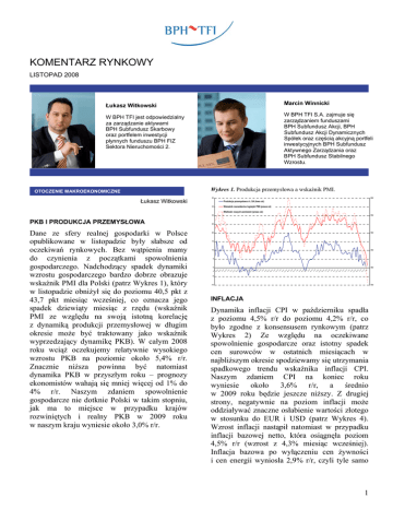 KOMENTARZ RYNKOWY LISTOPAD 2008 Łukasz Witkowski Marcin Winnicki W BPH TFI jest odpowiedzialny za zarządzanie aktywami BPH Subfundusz Skarbowy oraz portfelem inwestycji płynnych funduszu BPH FIZ Sektora Nieruchomości 2. W BPH TFI S.A. zajmuje się zarządzaniem funduszami BPH Subfundusz Akcji, BPH Subfundusz Akcji Dynamicznych Spółek oraz częścią akcyjną portfeli inwestycyjnych BPH Subfundusz Aktywnego Zarządzania oraz BPH Subfundusz Stabilnego Wzrostu. Wykres 1. Produkcja przemysłowa a wskaźnik PMI. OTOCZENIE MAKROEKONOMICZNE Łukasz Witkowski 40 60,0 Produkcja przemysłowa r/r, SA (lewa oś) Wskaźnik menedżerów logistyki PMI (prawa oś) 35 Wielkość nowych zamówień (prawa oś) 30 20 50,0 15 10 45,0 5 0 0 -0 a r- s ty 00 aj00 lip -0 0 w rz -0 0 lis -0 0 s ty -0 1 m a r01 m aj01 lip -0 1 w rz -0 1 lis -0 1 s ty -0 2 m a r02 m aj02 lip -0 2 w rz -0 2 lis -0 2 s ty -0 3 m a r03 m aj03 lip -0 3 w rz -0 3 lis -0 3 s ty -0 4 m a r04 m aj04 lip -0 4 w rz -0 4 lis -0 4 s ty -0 5 m a r05 m aj05 lip -0 5 w rz -0 5 lis -0 5 s ty -0 6 m a r06 m aj06 lip -0 6 w rz -0 6 lis -0 6 s ty -0 7 m a r07 m aj07 lip -0 7 w rz -0 7 lis -0 7 s ty -0 8 m a r08 m aj08 lip -0 8 w rz -0 8 lis -0 8 40,0 m Dane ze sfery realnej gospodarki w Polsce opublikowane w listopadzie były słabsze od oczekiwań rynkowych. Bez wątpienia mamy do czynienia z początkami spowolnienia gospodarczego. Nadchodzący spadek dynamiki wzrostu gospodarczego bardzo dobrze obrazuje wskaźnik PMI dla Polski (patrz Wykres 1), który w listopadzie obniżył się do poziomu 40,5 pkt z 43,7 pkt miesiąc wcześniej, co oznacza jego spadek dziewiąty miesiąc z rzędu (wskaźnik PMI ze względu na swoją istotną korelację z dynamiką produkcji przemysłowej w długim okresie może być traktowany jako wskaźnik wyprzedzający dynamikę PKB). W całym 2008 roku wciąż oczekujemy relatywnie wysokiego wzrostu PKB na poziomie około 5,4% r/r. Znacznie niższa powinna być natomiast dynamika PKB w przyszłym roku – prognozy ekonomistów wahają się mniej więcej od 1% do 4% r/r. Naszym zdaniem spowolnienie gospodarcze nie dotknie Polski w takim stopniu, jak ma to miejsce w przypadku krajów rozwiniętych i realny PKB w 2009 roku w naszym kraju wyniesie około 3,0% r/r. 55,0 25 m PKB I PRODUKCJA PRZEMYSŁOWA -5 -10 35,0 INFLACJA Dynamika inflacji CPI w październiku spadła z poziomu 4,5% r/r do poziomu 4,2% r/r, co było zgodne z konsensusem rynkowym (patrz Wykres 2) Ze względu na oczekiwane spowolnienie gospodarcze oraz istotny spadek cen surowców w ostatnich miesiącach w najbliższym okresie spodziewamy się utrzymania spadkowego trendu wskaźnika inflacji CPI. Naszym zdaniem CPI na koniec roku wyniesie około 3,6% r/r, a średnio w 2009 roku będzie jeszcze niższy. Z drugiej strony, negatywnie na poziom inflacji może oddziaływać znaczne osłabienie wartości złotego w stosunku do EUR i USD (patrz Wykres 4). Wzrost inflacji nastąpił natomiast w przypadku inflacji bazowej netto, która osiągnęła poziom 4,5% r/r (wzrost z 4,3% miesiąc wcześniej). Inflacja bazowa po wyłączeniu cen żywności i cen energii wyniosła 2,9% r/r, czyli tyle samo 1 co w poprzednim miesiącu. Pozostałe miary inflacji bazowej spadły w porównaniu do wartości odnotowanych w miesiącu wrześniu. Wykres 3. Rynek pracy w Polsce. 16% 16% Zatrudnienie, r/r Wykres 2. Inflacja a cel inflacyjny NBP. Realna dynamika funduszu płac, r/r (3-miesięczna średnia ruchoma) 12% 12% Realna dynamika płac, r/r (3-miesięczna średnia ruchoma) 12 12 Inflacja CPI r/r Inflacja PPI r/r Górna granica celu inflacyjnego Cel inflacyjny NBP 11 11 10 8% 8% 4% 4% 0% 0% 10 Inflacja netto 8 7 7 6 6 5 5 4 4 3 3 2 2 1 1 0 0 ma s ty -0 0 r- 0 0 ma j-0 0 lip -0 0 w rz -0 0 lis -0 0 s ty -0 1 m ar01 ma j-0 1 lip -0 1 w rz -0 1 lis -0 1 s ty -0 2 ma r- 0 2 m aj02 lip -0 2 w rz -0 2 lis -0 2 s ty -0 3 m ar03 ma j-0 3 lip -0 3 w rz -0 3 lis -0 3 s ty -0 4 m ar04 m aj04 lip -0 4 w rz -0 4 lis -0 4 s ty -0 5 m ar05 ma j-0 5 lip -0 5 w rz -0 5 lis -0 5 s ty -0 6 m ar06 m aj06 lip -0 6 w rz -0 6 lis -0 6 s ty -0 7 ma r- 0 7 ma j-0 7 lip -0 7 w rz -0 7 lis -0 7 s ty -0 8 m ar08 m aj08 lip -0 8 w rz -0 8 lis -0 8 9 8 -1 Źródło: Dane GUS i NPB. RYNEK PRACY W ostatnich miesiącach obserwujemy odwrócenie się pozytywnego trendu na rynku pracy (patrz Wykres 3). Dynamika płac w sektorze przedsiębiorstw za październik wyniosła 9,8% r/r (wobec wzrostu o 10,9% r/r miesiąc wcześniej) i była nieznacznie powyżej rynkowych oczekiwań na poziomie 9,5% r/r. Sukcesywnie obniża się również dynamika zatrudnienia, która w październiku była najsłabsza od dwóch lat i wyniosła 3,6% r/r. Słabnie także dynamika nominalnego i realnego funduszu płac (3-miesięczna średnia ruchoma spadła w październiku czwarty miesiąc z rzędu), który oznacza mniejszy dochód rozporządzalny dla gospodarstw domowych, a co za tym idzie osłabienie popytu wewnętrznego. Oczekujemy, że w całym 2008 roku dynamika płac będzie jeszcze dwucyfrowa i wyniesie około 10,2% r/r. W przyszłym roku oczekujemy dalszego pogorszenia sytuacji na rynku pracy. -1 s ty -9 ma 9 r-9 ma 9 j-9 9 lip -9 w rz 9 -9 9 lis -9 9 s ty -0 ma 0 r-0 ma 0 j-0 0 lip -0 w rz 0 -0 0 lis -0 0 s ty -0 ma 1 r-0 ma 1 j-0 1 lip -0 w rz 1 -0 1 lis -01 s ty -0 ma 2 r-0 ma 2 j-0 2 lip -0 w rz 2 -0 2 lis -02 s ty -0 ma 3 r-0 ma 3 j-0 3 lip -0 w rz 3 -0 3 lis -0 3 s ty -0 ma 4 r-0 ma 4 j-0 4 lip -0 w rz 4 -0 4 lis -0 4 s ty -0 ma 5 r-0 ma 5 j-0 5 lip -0 w rz 5 -0 5 lis -0 5 s ty -0 ma 6 r-0 ma 6 j-0 6 lip -0 w rz 6 -0 6 lis -0 6 s ty -0 ma 7 r-0 ma 7 j-0 7 lip -0 w rz 7 -0 7 lis -07 s ty -0 ma 8 r-0 ma 8 j-0 8 lip -0 w rz 8 -0 8 lis -0 8 Dolna granica celu inflacyjnego 9 -4% -4% -8% -8% Źródło: Obliczenia własne na podstawie danych GUS. FINANSE PUBLICZNE Sytuacja finansów publicznych na chwilę obecną jest bardzo dobra. Ministerstwo Finansów poinformowało, że saldo budżetu państwa po listopadzie 2008 roku zamknie się de