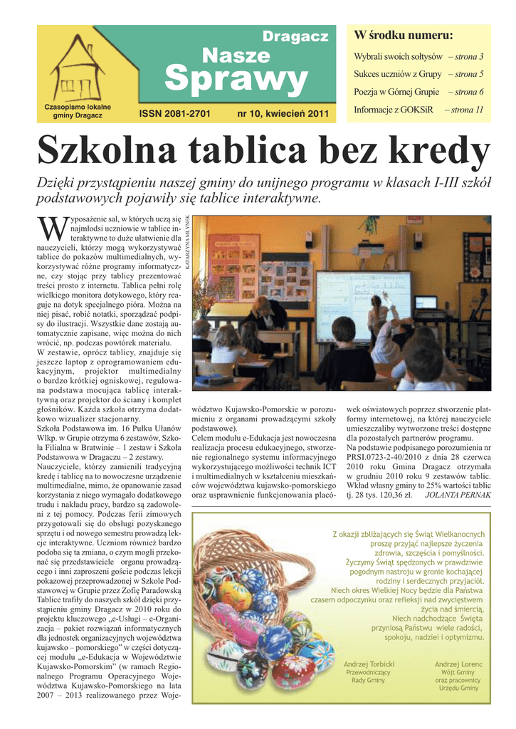 W środku numeru: Wybrali swoich sołtysów – strona 3 Sukces uczniów z Grupy – strona 5 Poezja w Górnej Grupie – strona 6 Szkolna tablica bez kredy Czasopismo lokalne gminy Dragacz ISSN 2081-2701 nr 10, kwiecień 2011 Informacje z GOKSiR – strona 11 Dzięki przystąpieniu naszej gminy do unijnego programu w klasach I-III szkół podstawowych pojawiły się tablice interaktywne. W KATARZYNA MŁYNEK yposażenie sal, w których uczą się najmłodsi uczniowie w tablice interaktywne to duże ułatwienie dla nauczycieli, którzy mogą wykorzystywać tablice do pokazów multimedialnych, wykorzystywać różne programy informatyczne, czy stojąc przy tablicy prezentować treści prosto z internetu. Tablica pełni rolę wielkiego monitora dotykowego, który reaguje na dotyk specjalnego pióra. Można na niej pisać, robić notatki, sporządzać podpisy do ilustracji. Wszystkie dane zostają automatycznie zapisane, więc można do nich wrócić, np. podczas powtórek materiału. W zestawie, oprócz tablicy, znajduje się jeszcze laptop z oprogramowaniem edukacyjnym, projektor multimedialny o bardzo krótkiej ogniskowej, regulowana podstawa mocująca tablicę interaktywną oraz projektor do ściany i komplet głośników. Każda szkoła otrzyma dodatkowo wizualizer stacjonarny. Szkoła Podstawowa im. 16 Pułku Ułanów Wlkp. w Grupie otrzyma 6 zestawów, Szkoła Filialna w Bratwinie – 1 zestaw i Szkoła Podstawowa w Dragaczu – 2 zestawy. Nauczyciele, którzy zamienili tradycyjną kredę i tablicę na to nowoczesne urządzenie multimedialne, mimo, że opanowanie zasad korzystania z niego wymagało dodatkowego trudu i nakładu pracy, bardzo są zadowoleni z tej pomocy. Podczas ferii zimowych przygotowali się do obsługi pozyskanego sprzętu i od nowego semestru prowadzą lekcje interaktywne. Uczniom również bardzo podoba się ta zmiana, o czym mogli przekonać się przedstawiciele organu prowadzącego i inni zaproszeni goście podczas lekcji pokazowej przeprowadzonej w Szkole Podstawowej w Grupie przez Zofię Paradowską Tablice trafiły do naszych szkół dzięki przystąpieniu gminy Dragacz w 2010 roku do projektu kluczowego „e-Usługi – e-Organizacja – pakiet rozwiązań informatycznych dla jednostek organizacyjnych województwa kujawsko – pomorskiego” w części dotyczącej modułu „e-Edukacja w Województwie Kujawsko-Pomorskim” (w ramach Regionalnego Programu Operacyjnego Województwa Kujawsko-Pomorskiego na lata 2007 – 2013 realizowanego przez Woje- wództwo Kujawsko-Pomorskie w porozumieniu z organami prowadzącymi szkoły podstawowe). Celem modułu e-Edukacja jest nowoczesna realizacja procesu edukacyjnego, stworzenie regionalnego systemu informacyjnego wykorzystującego możliwości technik ICT i multimedialnych w kształceniu mieszkańców województwa kujawsko-pomorskiego oraz usprawnienie funkcjonowania placó- wek oświatowych poprzez stworzenie platformy internetowej, na której nauczyciele umieszczaliby wytworzone treści dostępne dla pozostałych partnerów programu. Na podstawie podpisanego porozumienia nr PRSI.0723-2-40/2010 z dnia 28 czerwca 2010 roku Gmina Dragacz otrzymała w grudniu 2010 roku 9 zestawów tablic. Wkład własny gminy to 25% wartości tablic tj. 28 tys. 120,36 zł. JOLANTA PERNAK Nasze Sprawy Dragacz Aktualności Turniej wiedzy pożarniczej 2 Prawie czterdziestu uczniów wzięło udział eliminacjach gminnych Ogólnopolskiego Turnieju Wiedzy Pożarniczej „Młodzież Zapobiega Pożarom”. W NADESŁANE cześniej przeprowadzone były eliminacje w poszczególnych szkołach i jednostkach OSP. Do gminnego etapu dostało się 39 młodych mieszkańców naszej gminy. Wszyscy, którzy spotkali się 31 marca w sali posiedzeń Urzędu Gminy w Dragaczu podzieleni zostali na trzy grupy wiekowe. Po dokonaniu oceny prac pisemnych zakwalifikowano do finału niżej wymienionych uczestników: I grupa wiekowa (szkoły podstawowe): Kaliszewski Kacper, Ekman Jolanta, Trochowski Adrian, Babiarz Wiktoria (wszyscy – Szkoła Podstawowa w Dragaczu), Brzezińska Sandra (OSP Fletnowo). II grupa wiekowa (gimnazja): Plich Karolina i Młynek Julia (OSP Górna Grupa), Ginter Izabela i Niewadzi Paulina (OSP Fletnowo), Zielińska Katarzyna (Gimnazjum Michale). III grupa wiekowa (szkoły ponadgimnazjalne): Helt Rafał i Zwolicki Maciej (OSP Górna Grupa), Lewandowska Marta (OSP Fletnowo), Michalski Tomasz i Michalski Wojciech (OSP Wielkie Zajączkowo). W wyniku rozgrywek finałowych – dogrywki, kolejność zajętych miejsc przedstawia się następująco: I grupa wiekowa (szkoły podstawowe): 1. Kaliszewski Kacper (SP Dragacz) 2. Ekman Jolanta (SP Dragacz) 3. Trochowski Adrian (SP Dragacz). II grupa wiekowa (gimnazja): 1. Plich Karolina – OSP Górna Grupa 2. Młynek Julia – OSP Górna Grupa 3. Ginter Izabela – OSP Fletnowo III grupa wiekowa (szkoły ponadgimnazjalne): 1. Helt Rafał – OSP Górna Grupa 2. Zwolicki Maciej – OSP Górna Grupa 3. Michalski Tomasz – OSP Wielkie Zajączkowo Osoby, które zajęły I i II miejsca w poszczególnych grupach wiekowych zakwalifikowały się jako reprezentanci naszej gminy na Turnieju Powiatowym, który odbył się w Drzycimiu 07 kwietnia. Nasi uczniowie zajęli tam dobre lokaty: I miejsce zajął Maciej Zwolicki, III – Rafał Helt – w kategorii szkół ponadgimnazjalnych oraz III miejsce Karolina Plich w kategorii gimnazjum. Na Wojewódzki Turniej Wiedzy Pożarniczej zakwalifikował się Maciej Zwolicki. Za zajęcie od I do III miejsca organizator zapewnił uczestnikom turnieju nagrody i dyplomy, dla wszystkich uczestników słodki poczęstunek i nagrody pocieszenia Chemia może być ciekawa ARCHIWUM SZKOŁY Wycieczka na pokazy chemiczne do Torunia miała miejsce 9 marca. Uczestniczyło w niej 30 uczniów Gimnazjum im. Feliksa Kikulskiego w Michalu oraz trzech opiekunów: Agnieszka Dolna, Magdalena Sikorska i Krystian Krawański. Od kilku lat Koło Chemików organizuje pokazy chemiczne podczas Dni Promocj