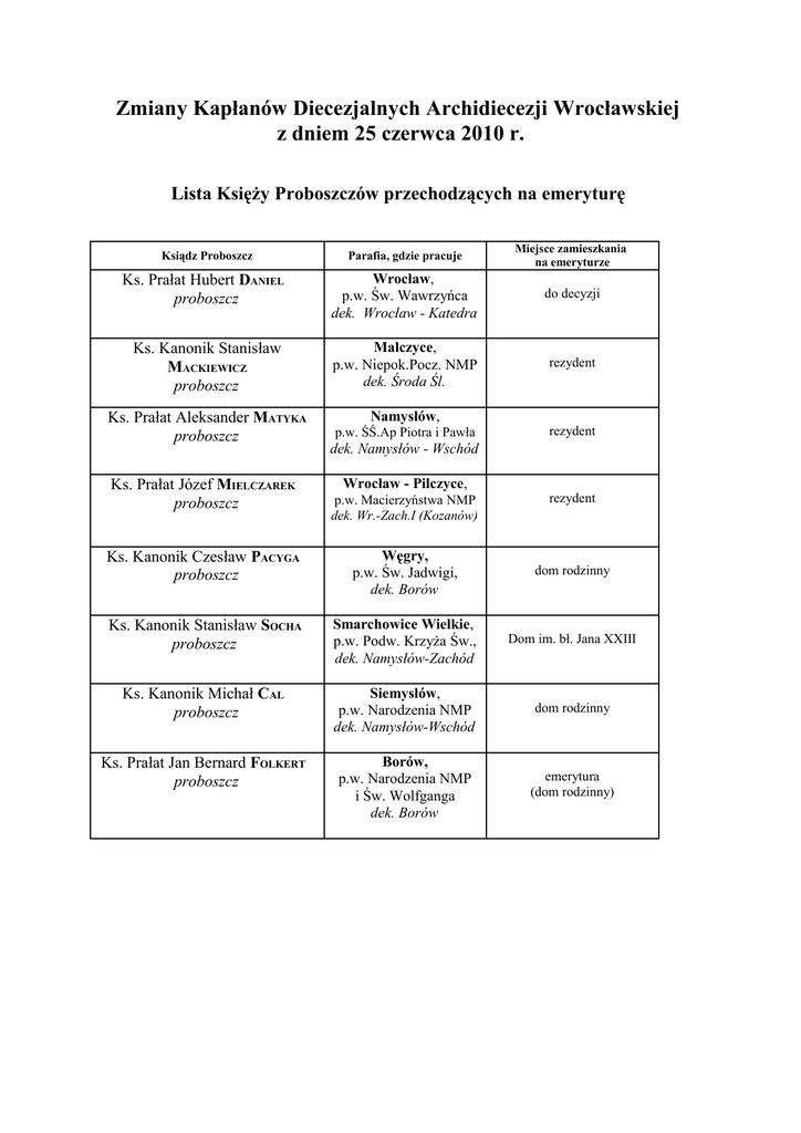 Zmiany Kapłanów Diecezjalnych Archidiecezji Wrocławskiej z dniem 25 czerwca 2010 r. Lista Księży Proboszczów przechodzących na emeryturę Parafia, gdzie pracuje Miejsce zamieszkania na emeryturze Ks. Prałat Hubert DANIEL proboszcz Wrocław, p.w. Św. Wawrzyńca dek. Wrocław - Katedra do decyzji Ks. Kanonik Stanisław MACKIEWICZ proboszcz Malczyce, p.w. Niepok.Pocz. NMP dek. Środa Śl. rezydent Ks. Prałat Aleksander MATYKA proboszcz p.w. ŚŚ.Ap Piotra i Pawła Ksiądz Proboszcz Ks. Prałat Józef MIELCZAREK proboszcz Namysłów, rezydent dek. Namysłów - Wschód Wrocław - Pilczyce, p.w. Macierzyństwa NMP dek. Wr.-Zach.I (Kozanów) rezydent Ks. Kanonik Czesław PACYGA proboszcz Węgry, p.w. Św. Jadwigi, dek. Borów dom rodzinny Ks. Kanonik Stanisław SOCHA proboszcz Smarchowice Wielkie, p.w. Podw. Krzyża Św., dek. Namysłów-Zachód Dom im. bł. Jana XXIII Ks. Kanonik Michał CAL proboszcz Siemysłów, p.w. Narodzenia NMP dek. Namysłów-Wschód dom rodzinny Ks. Prałat Jan Bernard FOLKERT proboszcz Borów, p.w. Narodzenia NMP i Św. Wolfganga dek. Borów emerytura (dom rodzinny) ZMIANY KSIĘŻY PROBOSZCZÓW Ksiądz Proboszcz Parafia, gdzie pracuje Parafia, którą obejmuje Ks. Kanonik mgr Bolesław BOCZAN proboszcz Woskowice Małe, p.w. Św. Wawrzyńca dek. Namysłów-Wschód Węgry, p.w. Św. Jadwigi, dek. Borów Ks. Prałat mgr lic. Jan KISZ proboszcz Strzelin, p.w. Podw. Krzyża Św. dek. Strzelin Kamieniec Wrocł., Ks. Prałat mgr Kazimierz PIĄTEK proboszcz Jordanów Śl., p.w. Św. Stan. Bpa i M. dek. Borów Ks. Prałat mgr Bolesław SYLWESTRZAK proboszcz Kamieniec Wrocł., Ks. mgr Przemysław PALUCH proboszcz Ks. mgr Zbigniew SOWIŃSKI proboszcz Ks. Kanonik mgr Henryk JACAK proboszcz Ks. mgr Andrzej PORĘBNY proboszcz Ks. mgr lic. Jan BASZAK proboszcz Ks. Wojciech MIŚKOWIEC proboszcz Ks. mgr Paweł STYPA proboszcz p.w. Miłosierdzia Bożego dek. Wrocław- Północ II (Sępolno) p.w. Miłosierdzia Bożego dek. Wrocław- Północ II (Sępolno) Urlop zdrowotny Malczyce, p.w. Niepok.Pocz. NMP dek. Środa Śl. Michalice, Smarchowice Wielkie, p.w. Św. Michała Arch., dek. Namysłów-Zachód p.w. Podw. Krzyża Św., dek. Namysłów-Zachód Wilczków, Borów, p.w. Narodzenia NMP i Św. Wolfganga dek. Borów p.w. NMP Różańcowej, dek. Środa Śl. Wierzbno, p.w. Św. Mikołaja, dek. Oława Boleścin, p.w. Miłosierdzia Bożego, dek. Trzebnica Namysłów, p.w. ŚŚ.Ap Piotra i Pawła dek. Namysłów - Wschód Strzelin, p.w. Podw. Krzyża Św. dek. Strzelin Osetno, Wierzbno, p.w. Św. Michała Arch., dek. Góra – Zachód p.w. Św. Mikołaja, dek. Oława Szymonków, Jordanów Śl., p.w. Narodzenia NMP, p.w. Św. Stan. Bpa i M. dek. Namysłów-Wschód dek. Borów Dobra, Szymonków, p.w. Narodzenia NMP, p.w. NMP z Góry Karmel, dek. Oleśnica-Zachód dek. Namysłów-Wschód Nominacje na Księży Proboszczów Ksiądz Wikariusz Ks. mgr Leszek URBAN wikariusz Parafia, gdzie pracuje Wrocław, p.w. Ducha Świętego, dek. Wrocław-Południe Ks. mgr lic. Piotr BAŁTAROWICZ wikariusz Ks. mgr lic. Tomasz CZABATOR wikariusz Ks. mgr Grzegorz LASZCZYŃSKI wikariusz Ks. mgr Jarosław WITOSZYŃSKI wikariusz Ks. Marian WOLSKI wikariusz Brzeg, p.w. Św. Mikołaja, dek. Brzeg-Południe Parafia, którą obejmuje Boleścin, p.w. Miłosierdzia Bożego, dek. Trzebnica Siemysłów, p.w. Narodzenia NMP dek. Namysłów-Wschód Wrocław-Zakrzów, Osetno, p.w. Św. Jana Ap., p.w. Św. Michała Arch., dek. Góra – Zachód dek. Wr.-Północ III (Psie Pole) Wrocław-Kozanów, Michalice, p.w. Św. Jadwigi, p.w. Św. Michała Arch., dek. Namysłów-Zachód dek. Wr.-Zach.I (Kozanów) Malczyce, Wilczków, p.w. Niepok.Pocz.NMP, dek. Środa Śl p.w. NMP Różańcowej, dek. Środa Śl. Borów, Woskowice Małe, p.w. Św. Wawrzyńca p.w. Narodzenia NMP i Św. Wolfganga, dek. Namysłów-Wschód dek. Borów Dobra, Ks. mgr Dariusz FILOZOF Jordanów Śl., p.w. NMP z Góry Karmel, wikariusz p.w. Św. Stan. Bpa i M. dek. Borów dek. Oleśnica-Zachód Ks. Kanonik mgr Krzysztof Wrocław-Nowy Dwór, Wrocław-Nowy Dwór, p.w. Opatrzności Bożej p.w. Opatrzności Bożej HAJDUN dek. Wr.-Zach.I (Kozanów) dek. Wr.-Zach.I (Kozanów) administrator proboszcz Ks. mgr Andrzej SYCZ administrator Brzeg Dolny, Brzeg Dolny, p.w. NMP z Góry Karmel dek. Brzeg Dolny p.w. NMP z Góry Karmel dek. Brzeg Dolny proboszcz Ks. Kanonik mgr Ryszard SKOCZ dyrektor wikariusz Dom Księży Emerytów - im. Jana XXIII we Wrocławiu Wrocław, p.w. NMP na Piasku dek. Wrocław-Katedra Wrocław - Pilczyce, p.w. Macierzyństwa NMP dek. Wr.-Zach.I (Kozanów) proboszcz Ks. mgr lic. Zbigniew ORDA Wrocław, Dyrektor Domu Księży Emerytów wikariusz p.w. Św. Jana Chrzc., im. Jana XXIII we Wrocławiu dek. Wrocław-Katedra Ks. Kanonik mgr Tomasz Caritas Archidiecezji BURGHARDT Wrocławskiej dyrektor Ks. Kanonik mgr Janusz Wrocław, JASTRZĘBSKI p.w. Św. Henryka rezydent dek. Wrocław-Południe Ks. mgr lic. Grzegorz STÓJ wikariusz p.w. NMP Matki Pocieszenia, Ks. mgr Grzegorz KOPIJ wikariusz Wrocław, p.w. Św. Jana Chrzc., urlop zdrowotny Dyrektor Caritas Archidiecezji Wrocławskiej Oława, dek. Oława dek. Wrocław-Katedra Brzeg, PMK we Francji Archidiecezja Lwowska Ks. mgr Patryk GOŁUBCÓW wikariusz p.w. Św. Mikołaja, Ks. mgr Mariusz DĘBSKI wikariusz p.w. Św.Ap. Piotra i Pawła, Ks. Kanonik mgr lic. Zbigniew WRÓBEL kapelan ZOL Sióstr Boromeuszek Wrocław - Ks. mgr Klaudiusz WOLLEK wikariusz Wrocław, p.w. Ducha Świętego Diecezja Świdnicka dek. Brzeg-Południe Trzebnica, dek. Trzebnica dek. Wrocław-Południe Ks. mgr Klaudiusz WOLLEK Asystent kościelny Pracowników PKP Rzym studia Asystent kościelny Pracowników Kolei Państwowych Wrocław, p.w. Ducha Świętego dek. Wrocław-Południe Misje Argentyna - Zmiany Wikariuszowskie Ksiądz Wikariusz Parafia, gdzie pracuje Parafia, którą obejmuje Ks. mgr Szymon ZAUFAL wikariusz Wrocław-Maślice, p.w. Św. Agnieszki, Wrocław-Psie Pole, dek. Wrocław-Zach.I (Kozanów) Ks. dr Wojciech GRYGLEWICZ w