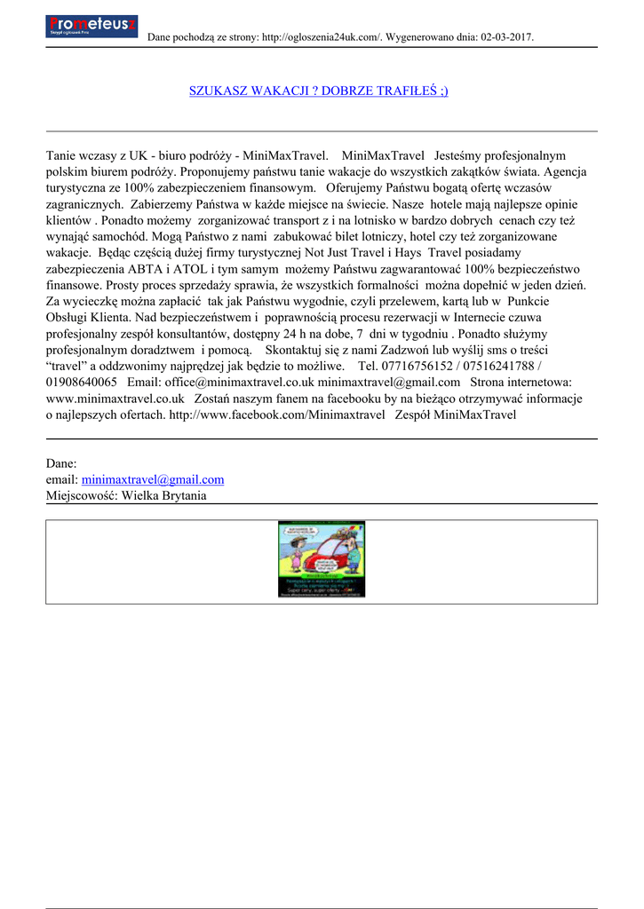 Dane pochodzą ze strony: http://ogloszenia24uk.com/. Wygenerowano dnia: 02-03-2017. SZUKASZ WAKACJI ? DOBRZE TRAFIŁEŚ ;) Tanie wczasy z UK - biuro podróży - MiniMaxTravel. MiniMaxTravel Jesteśmy profesjonalnym polskim biurem podróży. Proponujemy państwu tanie wakacje do wszystkich zakątków świata. Agencja turystyczna ze 100% zabezpieczeniem finansowym. Oferujemy Państwu bogatą ofertę wczasów zagranicznych. Zabierzemy Państwa w każde miejsce na świecie. Nasze hotele mają najlepsze opinie klientów . Ponadto możemy zorganizować transport z i na lotnisko w bardzo dobrych cenach czy też wynająć samochód. Mogą Państwo z nami zabukować bilet lotniczy, hotel czy też zorganizowane wakacje. Będąc częścią dużej firmy turystycznej Not Just Travel i Hays Travel posiadamy zabezpieczenia ABTA i ATOL i tym samym możemy Państwu zagwarantować 100% bezpieczeństwo finansowe. Prosty proces sprzedaży sprawia, że wszystkich formalności można dopełnić w jeden dzień. Za wycieczkę można zapłacić tak jak Państwu wygodnie, czyli przelewem, kartą lub w Punkcie Obsługi Klienta. Nad bezpieczeństwem i poprawnością procesu rezerwacji w Internecie czuwa profesjonalny zespół konsultantów, dostępny 24 h na dobe, 7 dni w tygodniu . Ponadto służymy profesjonalnym doradztwem i pomocą. Skontaktuj się z nami Zadzwoń lub wyślij sms o treści “travel” a oddzwonimy najprędzej jak będzie to możliwe. Tel. 07716756152 / 07516241788 / 01908640065 Email: [email protected] [email protected] Strona internetowa: www.minimaxtravel.co.uk Zostań naszym fanem na facebooku by na bieżąco otrzymywać informacje o najlepszych ofertach. http://www.facebook.com/Minimaxtravel Zespół MiniMaxTravel Dane: email: [email protected] Miejscowość: Wielka Brytania