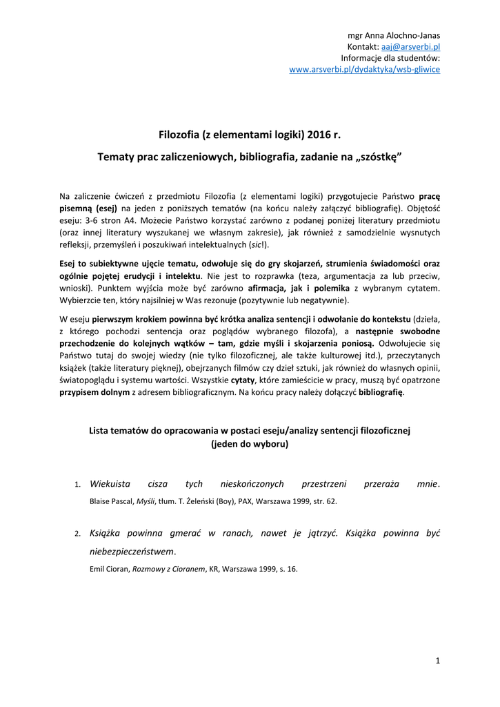 mgr Anna Alochno-Janas Kontakt: [email protected] Informacje dla studentów: www.arsverbi.pl/dydaktyka/wsb-gliwice Filozofia (z elementami logiki) 2016 r. Tematy prac zaliczeniowych, bibliografia, zadanie na „szóstkę” Na zaliczenie ćwiczeń z przedmiotu Filozofia (z elementami logiki) przygotujecie Państwo pracę pisemną (esej) na jeden z poniższych tematów (na końcu należy załączyć bibliografię). Objętość eseju: 3-6 stron A4. Możecie Państwo korzystać zarówno z podanej poniżej literatury przedmiotu (oraz innej literatury wyszukanej we własnym zakresie), jak również z samodzielnie wysnutych refleksji, przemyśleń i poszukiwań intelektualnych (sic!). Esej to subiektywne ujęcie tematu, odwołuje się do gry skojarzeń, strumienia świadomości oraz ogólnie pojętej erudycji i intelektu. Nie jest to rozprawka (teza, argumentacja za lub przeciw, wnioski). Punktem wyjścia może być zarówno afirmacja, jak i polemika z wybranym cytatem. Wybierzcie ten, który najsilniej w Was rezonuje (pozytywnie lub negatywnie). W eseju pierwszym krokiem powinna być krótka analiza sentencji i odwołanie do kontekstu (dzieła, z którego pochodzi sentencja oraz poglądów wybranego filozofa), a następnie swobodne przechodzenie do kolejnych wątków – tam, gdzie myśli i skojarzenia poniosą. Odwołujecie się Państwo tutaj do swojej wiedzy (nie tylko filozoficznej, ale także kulturowej itd.), przeczytanych książek (także literatury pięknej), obejrzanych filmów czy dzieł sztuki, jak również do własnych opinii, światopoglądu i systemu wartości. Wszystkie cytaty, które zamieścicie w pracy, muszą być opatrzone przypisem dolnym z adresem bibliograficznym. Na końcu pracy należy dołączyć bibliografię. Lista tematów do opracowania w postaci eseju/analizy sentencji filozoficznej (jeden do wyboru) 1. Wiekuista cisza tych nieskończonych przestrzeni przeraża mnie. Blaise Pascal, Myśli, tłum. T. Żeleński (Boy), PAX, Warszawa 1999, str. 62. 2. Książka powinna gmerać w ranach, nawet je jątrzyć. Książka powinna być niebezpieczeństwem. Emil Cioran, Rozmowy z Cioranem, KR, Warszawa 1999, s. 16. 1 mgr Anna Alochno-Janas Kontakt: [email protected] Informacje dla studentów: www.arsverbi.pl/dydaktyka/wsb-gliwice 3. Jako rzucone bycie-w-świecie jestestwo zawsze już jest wydane swej śmierci. Będąc ku swej śmierci, umiera ono faktycznie, i to ciągle – dopóki nie utraci swego życia. Martin Heidegger, Bycie i czas, tłum. B. Baran, PWN, Warszawa 1994, s. 364. 4. Bo naprzód trzy były płcie u ludzi, a nie jak teraz, dwie: męska i żeńska. Była jeszcze i trzecia prócz tego: pewien zlepek z jednej i drugiej […]” Platon, Uczta, [w tegoż:] Uczta. Eutyfron. Obrona Sokratesa. Kriton. Fedon, tłum. W. Witwicki, PWN, Warszawa 1984, s. 79. 5. To właśnie jest boskością, że są bogowie, a Boga nie ma! Friedrich Nietzsche, Tako rzecze Zaratustra. Książka dla wszystkich i dla nikogo, tłum. W. Berent, Zysk i S-ka, Poznań 2000, s. 183. 6. Los jest jego własnością, kamień jego kamieniem. […] Trzeba wyobrażać sobie Syzyfa szczęśliwym.” Albert Camus, Mit Syzyfa, [w tegoż:] Mit Syzyfa i inne eseje, tłum. J. Guze, Muza SA, Warszawa 1999, s. 149. 7. Ale ciąża to przede wszystkim dramat, który rozgrywa się we wnętrzu kobiety. Odczuwana bywa jako wzbogacenie i zarazem okaleczenie […]. Simone de Beauvoir, Druga płeć, tom II, tłum. M. Leśniewska, Wyd. Literackie, Kraków 1972, s. 310. 8. […] myślę, więc jestem […]. Kartezjusz, Rozprawa o metodzie właściwego kierowania rozumem i poszukiwania prawdy w naukach, tłum. T. Żeleński (Boy), PIW, Warszawa 1980, s. 54. 9. Ja […] transcenduję stale to, co istnieje w każdorazowej teraźniejszości […]. W tym właśnie m.in. przejawia się zjawiskowy charakter czasu […]. Roman Ingarden, Człowiek i czas, [w tegoż:] Książeczka o człowieku, Wyd. Literackie, Kraków1987, s. 48. 10. Cierpienie: wyższość człowieka nad Bogiem. Simone Weil, Świadomość nadprzyrodzona. Wybór myśli, tłum. A. Olędzka-Frybesowa, PAX, Warszawa 1996, s. 287. 2 mgr Anna Alochno-Janas Kontakt: [email protected] Informacje dla studentów: www.arsverbi.pl/dydaktyka/wsb-gliwice Wybrana literatura przedmiotu: 1. Baggini J., Fosl P. S., Przybornik filozofa. Kompendium metod i pojęć filozoficznych, tłum. D. Chabrajska, PAX, Warszawa 2010. 2. Bremer J. W., Wprowadzenie do logiki, Wyd. WAM, Kraków 2006. 3. Coreth E., Ehlen P., Haeffner G., Ricken F., Filozofia XX wieku, tłum. M. L. Kalinowski, Antyk, Kęty 2004. 4. Droit R. P., 51 zabaw (z) rzeczami. Doświadczanie rzeczywistości, tłum. E. Urscheler, GWP, Gdańsk2005. 5. Droit R. P., 101 zabaw filozoficznych. Doświadczanie codzienności, tłum. E. Urscheler, GWP, Gdańsk 2004. 6. Dupré B., 50 teorii filozofii, które powinieneś znać, tłum. K. Wolański, PWN, Warszawa 2008. 7. Hartman J., Głupie pytania. Krótki kurs filozofii, Warszawa 2013. 8. Hoffe O., Mała historia filozofii, Wydawnictwo Naukowe PWN, Warszawa 2004. 9. Scruton R., Przewodnik po filozofii dla inteligentnych, tłum. S. Sowa, Warszawa 2002. 10. Słownik filozofii, red. A. Aduszkiewicz, Świat Książki, Warszawa 2004. 11. Szymanek K., Sztuka argumentacji. Słownik terminologiczny, PWN, Warszawa 2004. 12. Szyszkowska M., Etyka, Białystok 2010. (PDF) 13. Szyszkowska M., Spotkania w salonie, Twój Styl, Warszawa 2002. 14. Środa Magdalena, Etyka dla myślących, Czarna Owca, Warszawa 2011. 15. Tatarkiewicz W., Historia filozofii. T. 1, 2, 3, PWN, Warszawa 1983. 16. Wendland Z., Historia filozofii od szkoły jońskiej do końca XX wieku: podręcznik akademicki dla niefilozofów, SGGW, Warszawa 2003. 17. Ziembiński Z., Logika praktyczna, PWN, Warszawa 1974. Zadanie na ocenę celującą Przeczytać jeden z poniższych tekstów (jeden do wyboru) i opowiedzieć swoje wrażenia z lektury. 1. Brach-Czaina J., Błony umysłu, Sic!, Warszawa 2003. 2. Brach-Czaina J., Szczeliny 