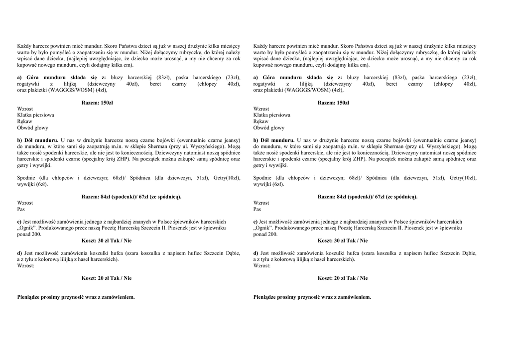 Każdy harcerz powinien mieć mundur. Skoro Państwa dzieci są już w naszej drużynie kilka miesięcy warto by było pomyśleć o zaopatrzeniu się w mundur. Niżej dołączymy rubryczkę, do której należy wpisać dane dziecka, (najlepiej uwzględniając, że dziecko może urosnąć, a my nie chcemy za rok kupować nowego munduru, czyli dodajmy kilka cm). Każdy harcerz powinien mieć mundur. Skoro Państwa dzieci są już w naszej drużynie kilka miesięcy warto by było pomyśleć o zaopatrzeniu się w mundur. Niżej dołączymy rubryczkę, do której należy wpisać dane dziecka, (najlepiej uwzględniając, że dziecko może urosnąć, a my nie chcemy za rok kupować nowego munduru, czyli dodajmy kilka cm). a) Góra munduru składa się z: bluzy harcerskiej (83zł), paska harcerskiego (23zł), rogatywki z lilijką (dziewczyny 40zł), beret czarny (chłopcy 40zł), oraz plakietki (WAGGGS/WOSM) (4zł), a) Góra munduru składa się z: bluzy harcerskiej (83zł), paska harcerskiego (23zł), rogatywki z lilijką (dziewczyny 40zł), beret czarny (chłopcy 40zł), oraz plakietki (WAGGGS/WOSM) (4zł), Razem: 150zł Razem: 150zł Wzrost Klatka piersiowa Rękaw Obwód głowy Wzrost Klatka piersiowa Rękaw Obwód głowy b) Dół munduru. U nas w drużynie harcerze noszą czarne bojówki (ewentualnie czarne jeansy) do munduru, w które sami się zaopatrują m.in. w sklepie Sherman (przy ul. Wyszyńskiego). Mogą także nosić spodenki harcerskie, ale nie jest to koniecznością. Dziewczyny natomiast noszą spódnice harcerskie i spodenki czarne (specjalny krój ZHP). Na początek można zakupić samą spódnicę oraz getry i wywijki. b) Dół munduru. U nas w drużynie harcerze noszą czarne bojówki (ewentualnie czarne jeansy) do munduru, w które sami się zaopatrują m.in. w sklepie Sherman (przy ul. Wyszyńskiego). Mogą także nosić spodenki harcerskie, ale nie jest to koniecznością. Dziewczyny natomiast noszą spódnice harcerskie i spodenki czarne (specjalny krój ZHP). Na początek można zakupić samą spódnicę oraz getry i wywijki. Spodnie (dla chłopców i dziewczyn; 68zł)/ Spódnica (dla dziewczyn, 51zł), Getry(10zł), wywijki (6zł). Spodnie (dla chłopców i dziewczyn; 68zł)/ Spódnica (dla dziewczyn, 51zł), Getry(10zł), wywijki (6zł). Razem: 84zł (spodenki)/ 67zł (ze spódnicą). Razem: 84zł (spodenki)/ 67zł (ze spódnicą). Wzrost Pas Wzrost Pas c) Jest możliwość zamówienia jednego z najbardziej znanych w Polsce śpiewników harcerskich „Ognik”. Produkowanego przez naszą Pocztę Harcerską Szczecin II. Piosenek jest w śpiewniku ponad 200. Koszt: 30 zł Tak / Nie c) Jest możliwość zamówienia jednego z najbardziej znanych w Polsce śpiewników harcerskich „Ognik”. Produkowanego przez naszą Pocztę Harcerską Szczecin II. Piosenek jest w śpiewniku ponad 200. Koszt: 30 zł Tak / Nie d) Jest możliwość zamówienia koszulki hufca (szara koszulka z napisem hufiec Szczecin Dąbie, a z tyłu z kolorową lilijką z haseł harcerskich). Wzrost: d) Jest możliwość zamówienia koszulki hufca (szara koszulka z napisem hufiec Szczecin Dąbie, a z tyłu z kolorową lilijką z haseł harcerskich). Wzrost: Koszt: 20 zł Tak / Nie Pieniądze prosimy przynosić wraz z zamówieniem. Koszt: 20 zł Tak / Nie Pieniądze prosimy przynosić wraz z zamówieniem.