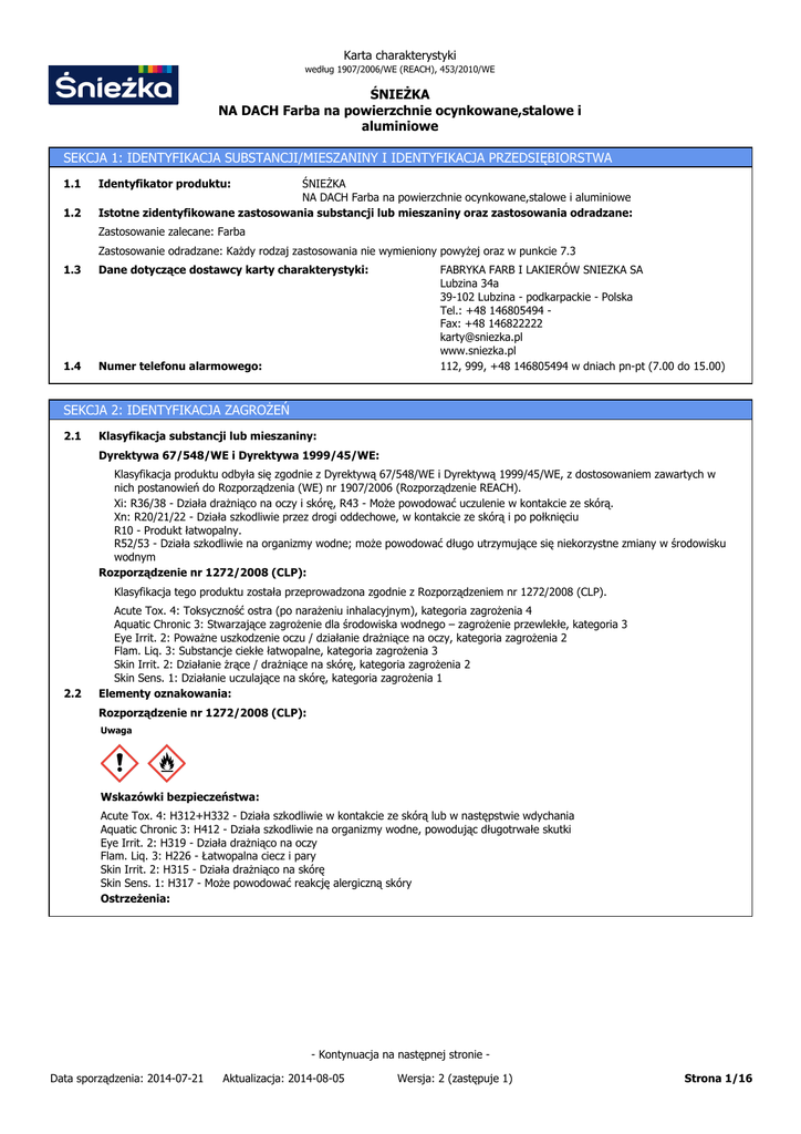 Karta charakterystyki według 1907/2006/WE (REACH), 453/2010/WE ŚNIEŻKA NA DACH Farba na powierzchnie ocynkowane,stalowe i aluminiowe SEKCJA 1: IDENTYFIKACJA SUBSTANCJI/MIESZANINY I IDENTYFIKACJA PRZEDSIĘBIORSTWA 1.1 1.2 Identyfikator produktu: ŚNIEŻKA NA DACH Farba na powierzchnie ocynkowane,stalowe i aluminiowe Istotne zidentyfikowane zastosowania substancji lub mieszaniny oraz zastosowania odradzane: Zastosowanie zalecane: Farba Zastosowanie odradzane: Każdy rodzaj zastosowania nie wymieniony powyżej oraz w punkcie 7.3 1.3 Dane dotyczące dostawcy karty charakterystyki: 1.4 Numer telefonu alarmowego: FABRYKA FARB I LAKIERÓW SNIEZKA SA Lubzina 34a 39-102 Lubzina - podkarpackie - Polska Tel.: +48 146805494 Fax: +48 146822222 [email protected] www.sniezka.pl 112, 999, +48 146805494 w dniach pn-pt (7.00 do 15.00) SEKCJA 2: IDENTYFIKACJA ZAGROŻEŃ 2.1 Klasyfikacja substancji lub mieszaniny: Dyrektywa 67/548/WE i Dyrektywa 1999/45/WE: Klasyfikacja produktu odbyła się zgodnie z Dyrektywą 67/548/WE i Dyrektywą 1999/45/WE, z dostosowaniem zawartych w nich postanowień do Rozporządzenia (WE) nr 1907/2006 (Rozporządzenie REACH). Xi: R36/38 - Działa drażniąco na oczy i skórę, R43 - Może powodować uczulenie w kontakcie ze skórą. Xn: R20/21/22 - Działa szkodliwie przez drogi oddechowe, w kontakcie ze skórą i po połknięciu R10 - Produkt łatwopalny. R52/53 - Działa szkodliwie na organizmy wodne; może powodować długo utrzymujące się niekorzystne zmiany w środowisku wodnym Rozporządzenie nr 1272/2008 (CLP): Klasyfikacja tego produktu została przeprowadzona zgodnie z Rozporządzeniem nr 1272/2008 (CLP). 2.2 Acute Tox. 4: Toksyczność ostra (po narażeniu inhalacyjnym), kategoria zagrożenia 4 Aquatic Chronic 3: Stwarzające zagrożenie dla środowiska wodnego – zagrożenie przewlekłe, kategoria 3 Eye Irrit. 2: Poważne uszkodzenie oczu / działanie drażniące na oczy, kategoria zagrożenia 2 Flam. Liq. 3: Substancje ciekłe łatwopalne, kategoria zagrożenia 3 Skin Irrit. 2: Działanie żrące / drażniące na skórę, kategoria zagrożenia 2 Skin Sens. 1: Działanie uczulające na skórę, kategoria zagrożenia 1 Elementy oznakowania: Rozporządzenie nr 1272/2008 (CLP): Uwaga Wskazówki bezpieczeństwa: Acute Tox. 4: H312+H332 - Działa szkodliwie w kontakcie ze skórą lub w następstwie wdychania Aquatic Chronic 3: H412 - Działa szkodliwie na organizmy wodne, powodując długotrwałe skutki Eye Irrit. 2: H319 - Działa drażniąco na oczy Flam. Liq. 3: H226 - Łatwopalna ciecz i pary Skin Irrit. 2: H315 - Działa drażniąco na skórę Skin Sens. 1: H317 - Może powodować reakcję alergiczną skóry Ostrzeżenia: - Kontynuacja na następnej stronie Data sporządzenia: 2014-07-21 Aktualizacja: 2014-08-05 Wersja: 2 (zastępuje 1) Strona 1/16 Karta charakterystyki według 1907/2006/WE (REACH), 453/2010/WE ŚNIEŻKA NA DACH Farba na powierzchnie ocynkowane,stalowe i aluminiowe SEKCJA 2: IDENTYFIKACJA ZAGROŻEŃ (Ciąg dalszy) P101: W razie konieczności zasięgnięcia porady lekarza należy pokazać pojemnik lub etykietę P102: Chronić przed dziećmi P303+P361+P353: W PRZYPADKU KONTATKU ZE SKÓRĄ (lub z włosami): Natychmiast usunąć/zdjąć całą zanieczyszczoną odzież. Spłukać skórę pod strumieniem wody/prysznicem P304+P340: W PRZYPADKU DOSTANIA SIĘ DO DRÓG ODDECHOWYCH: wyprowadzić lub wynieść poszkodowanego na świeże powietrze i zapewnić warunki do odpoczynku w pozycji umożliwiającej swobodne oddychanie P305+P351+P338: W PRZYPADKU DOSTANIA SIĘ DO OCZU: Ostrożnie płukać wodą przez kilka minut. Wyjąć soczewki kontaktowe, jeżeli są i można je łatwo usunąć. Nadal płukać P501: Zawartość/pojemnik usuwać zgodnie z obowiązującymi przepisami (Dz.U. 2010 nr 185 poz. 1243, Dz.U. 2010 nr 249 poz. 1674.) Informacja uzupełniająca: Brak danych Substancje, które mają wpływ na klasyfikację Ksylen; Bisphenol A diglycidyl ether resin 2.3 Inne zagrożenia: Brak danych SEKCJA 3: SKŁAD/INFORMACJA O SKŁADNIKACH Opis chemiczny: Mieszanina na bazie pigmentów i żywic w rozpuszczalnikach Składniki: Zgodnie z Załącznikiem II do Rozporządzenia (WE) nr 1907/2006 (punkt 3), Produkt zawiera: Identyfikacja Nazwa chemiczna/klasyfikacja Ksylen CAS: 1330-20-7 EC: 215-535-7 Dyrektywa 67/548/WE Xi: R38; Xn: R20/21; R10 Index: 601-022-00-9 REACH: 01-2119488216-32-XXXX Rozporządzenie 1272/2008 Acute Tox. 4: H312+H332; Flam. Liq. 3: H226; Skin Irrit. 2: H315 - Uwaga Stężenie ATP CLP00 20 - <50 % Bisphenol A diglycidyl ether resin ATP CLP00 CAS: 25068-38-6 EC: 500-033-5 Dyrektywa 67/548/WE N: R51/53; Xi: R36/38, R43 Index: 603-074-00-8 REACH: 01-2119456619-26-XXXX Rozporządzenie 1272/2008 Aquatic Chronic 2: H411; Eye Irrit. 2: H319; Skin Irrit. 2: H315; Skin Sens. 1: H317 - Uwaga 1 - <5 % etylobenzen CAS: 100-41-4 EC: 202-849-4 Dyrektywa 67/548/WE F: R11; Xn: R20 Index: 601-023-00-4 REACH: 01-2119489370-35-XXXX Rozporządzenie 1272/2008 Acute Tox. 4: H332; Flam. Liq. 2: H225 - Niebezpieczeństwo 1 - <5 % ATP CLP00 Butan-1-ol ATP CLP00 CAS: 71-36-3 EC: 200-751-6 Dyrektywa 67/548/WE Xi: R37/38, R41; Xn: R22; R10; R67 Index: 603-004-00-6 REACH: 01-2119484630-38-XXXX Rozporządzenie 1272/2008 Acute Tox. 4: H302; Eye Dam. 1: H318; Flam. Liq. 3: H226; Skin Irrit. 2: H315; STOT SE 3: H335; STOT SE 3: H336 - Niebezpieczeństwo metanol CAS: 67-56-1 EC: 200-659-6 Dyrektywa 67/548/WE F: R11; T: R23/24/25, R39/23/24/25 Index: 603-001-00-X REACH: 01-2119433307-44-XXXX Rozporządzenie 1272/2008 Acute Tox. 3: H301+H311+H331; Flam. Liq. 2: H225; STOT SE 1: H370 Niebezpieczeństwo 1 - <5 % ATP CLP00 <0,1 % Dokładne brzmienie zwrotów R i H patrz sekcja 16 SEKCJA 4: ŚRODKI PIERWSZEJ POMOCY 4.1 Opis środków pierwszej pomocy: Objawy w wyniku zatrucia mogą wystąpić dopiero po narażeniu, w związku z czym w razie wątpliwości, bezpośredniego narażenia na produkt chemiczny lub przeciągającego się złego samopoczucia należy skonsultować się z leka