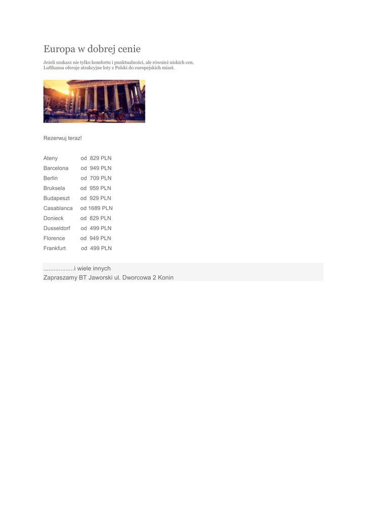 Europa w dobrej cenie Jeżeli szukasz nie tylko komfortu i punktualności, ale również niskich cen, Lufthansa oferuje atrakcyjne loty z Polski do europejskich miast. Rezerwuj teraz! Ateny od 829 PLN Barcelona od 949 PLN Berlin od 709 PLN Bruksela od 959 PLN Budapeszt od 929 PLN Casablanca od 1689 PLN Donieck od 829 PLN Dusseldorf od 499 PLN Florence od 949 PLN Frankfurt od 499 PLN ..................i wiele innych Zapraszamy BT Jaworski ul. Dworcowa 2 Konin