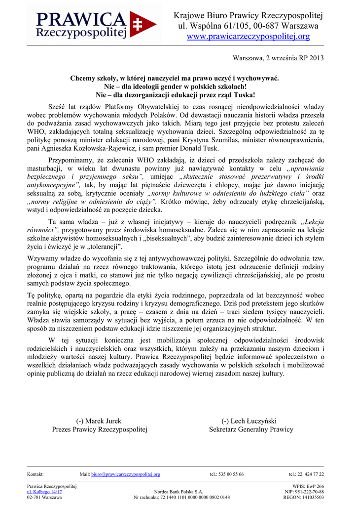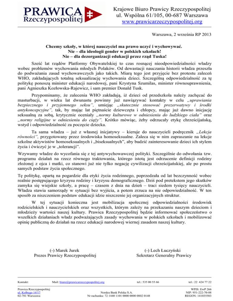 Krajowe Biuro Prawicy Rzeczypospolitej ul. Wspólna 61/105, 00-687 Warszawa www.prawicarzeczypospolitej.org Warszawa, 2 września RP 2013 Chcemy szkoły, w której nauczyciel ma prawo uczyć i wychowywać. Nie – dla ideologii gender w polskich szkołach! Nie – dla dezorganizacji edukacji przez rząd Tuska! Sześć lat rządów Platformy Obywatelskiej to czas rosnącej nieodpowiedzialności władzy wobec problemów wychowania młodych Polaków. Od dewastacji nauczania historii władza przeszła do podważania zasad wychowawczych jako takich. Miarą tego jest przyjęcie bez protestu zaleceń WHO, zakładających totalną seksualizację wychowania dzieci. Szczególną odpowiedzialność za tę politykę ponoszą minister edukacji narodowej, pani Krystyna Szumilas, minister równouprawnienia, pani Agnieszka Kozłowska-Rajewicz, i sam premier Donald Tusk. Przypominamy, że zalecenia WHO zakładają, iż dzieci od przedszkola należy zachęcać do masturbacji, w wieku lat dwunastu powinny już nawiązywać kontakty w celu „uprawiania bezpiecznego i przyjemnego seksu”, umiejąc „skutecznie stosować prezerwatywy i środki antykoncepcyjne”, tak, by mając lat piętnaście dziewczęta i chłopcy, mając już dawno inicjację seksualną za sobą, krytycznie oceniały „normy kulturowe w odniesieniu do ludzkiego ciała” oraz „normy religijne w odniesieniu do ciąży”. Krótko mówiąc, żeby odrzucały etykę chrześcijańską, wstyd i odpowiedzialność za poczęcie dziecka. Ta sama władza – już z własnej inicjatywy – kieruje do nauczycieli podręcznik „Lekcja równości”, przygotowany przez środowiska homoseksualne. Zaleca się w nim zapraszanie na lekcje szkolne aktywistów homoseksualnych i „biseksualnych”, aby budzić zainteresowanie dzieci ich stylem życia i ćwiczyć je w „tolerancji”. Wzywamy władze do wycofania się z tej antywychowawczej polityki. Szczególnie do odwołania tzw. programu działań na rzecz równego traktowania, którego istotą jest odrzucenie definicji rodziny złożonej z ojca i matki, co stanowi już nie tylko negację cywilizacji chrześcijańskiej, ale po prostu samych podstaw życia społecznego. Tę politykę, opartą na pogardzie dla etyki życia rodzinnego, poprzedzała od lat bezczynność wobec realnie postępującego kryzysu rodziny i kryzysu demograficznego. Dziś pod pretekstem jego skutków zamyka się wiejskie szkoły, a pracę – czasem z dnia na dzień – traci siedem tysięcy nauczycieli. Władza stawia samorządy w sytuacji bez wyjścia, a potem zrzuca na nie odpowiedzialność. W ten sposób za niszczeniem podstaw edukacji idzie niszczenie jej organizacyjnych struktur. W tej sytuacji konieczna jest mobilizacja społecznej odpowiedzialności środowisk rodzicielskich i nauczycielskich oraz wszystkich, którym zależy na przekazaniu naszym dzieciom i młodzieży wartości naszej kultury. Prawica Rzeczypospolitej będzie informować społeczeństwo o wszelkich działaniach władz podważających zasady wychowania w polskich szkołach i mobilizować opinię publiczną do działań na rzecz edukacji narodowej wiernej zasadom naszej kultury. (-) Marek Jurek Prezes Prawicy Rzeczypospolitej Kontakt: Prawica Rzeczypospolitej ul. Kolbego 14/17 02-781 Warszawa Mail: [email protected] (-) Lech Łuczyński Sekretarz Generalny Prawicy tel.: 535 00 55 66 Nordea Bank Polska S.A. Nr rachunku: 72 1440 1101 0000 0000 0802 0148 tel.: 22 424 77 22 WPIS: EwP 266 NIP: 951-222-70-88 REGON: 141035503