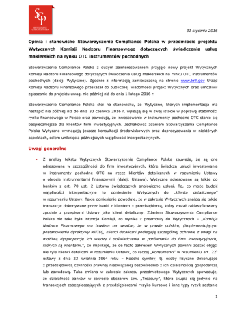 31 stycznia 2016 Opinia i stanowisko Stowarzyszenie Compliance Polska w przedmiocie projektu Wytycznych Komisji Nadzoru Finansowego dotyczących świadczenia usług maklerskich na rynku OTC instrumentów pochodnych Stowarzyszenie Compliance Polska z dużym zainteresowaniem przyjęło nowy projekt Wytycznych Komisji Nadzoru Finansowego dotyczących świadczenia usług maklerskich na rynku OTC instrumentów pochodnych (dalej: Wytyczne). Zgodnie z informacją zamieszczoną na stronie www.knf.gov Urząd Komisji Nadzoru Finansowego przekazał do publicznej wiadomości projekt Wytycznych oraz umożliwił zgłaszanie do projektu uwag, nie później niż do dnia 1 lutego 2016 r. Stowarzyszenie Compliance Polska stoi na stanowisku, że Wytyczne, których implementacja ma nastąpić nie później niż do dnia 30 czerwca 2016 r. wpisują się w swej istocie w poprawę stabilności rynku finansowego w Polsce oraz powodują, że inwestowanie w instrumenty pochodne OTC stanie się bezpieczniejsze dla klientów firm inwestycyjnych. Jednakowoż zdaniem Stowarzyszenia Compliance Polska Wytyczne wymagają jeszcze konsultacji środowiskowych oraz doprecyzowania w niektórych aspektach, celem uniknięcia późniejszych wątpliwości interpretacyjnych. Uwagi generalne Z analizy tekstu Wytycznych Stowarzyszenie Compliance Polska zauważa, że są one adresowane w szczególności do firm inwestycyjnych, które świadczą usługi inwestowania w instrumenty pochodne OTC na rzecz klientów detalicznych w rozumieniu Ustawy o obrocie instrumentami finansowymi (dalej: Ustawa). Wytyczne adresowane są także do banków z art. 70 ust. 2 Ustawy świadczących analogiczne usługi. To, co może budzić wątpliwości interpretacyjne to odniesienie Wytycznych do „klienta detalicznego” w rozumieniu Ustawy. Takie odniesienie powoduje, że w zakresie Wytycznych znajdą się także transakcje dokonywane przez banki z klientem – przedsiębiorcą, który został zaklasyfikowany zgodnie z przepisami Ustawy jako klient detaliczny. Zdaniem Stowarzyszenia Compliance Polska nie taka była intencja Komisji, co wynika z preambuły do Wytycznych – „Komisja Nadzoru Finansowego ma bowiem na uwadze, że w prawie polskim, (implementującym postanowienia dyrektywy MiFID), klienci detaliczni podlegają szczególnej ochronie z uwagi na możliwą dysproporcję ich wiedzy i doświadczenia w porównaniu do firm inwestycyjnych, których są klientami.”, co implikuje, że de facto zakresem Wytycznych powinni zostać objęci nie tyle klienci detaliczni w rozumieniu Ustawy, co raczej „konsumenci” w rozumieniu art. 221 ustawy z dnia 23 kwietnia 1964 roku – Kodeks cywilny, tj. osoby fizyczne dokonujące z przedsiębiorcą czynności prawnej niezwiązanej bezpośrednio z ich działalnością gospodarczą lub zawodową. Taka zmiana w zakresie zakresu przedmiotowego Wytycznych spowoduje, że działalność banków w zakresie obszarów tzw. „Treasury”, która skupia się jedynie na transakcjach zabezpieczających z przedsiębiorcami ryzyko kursowe i inne typy ryzyk zostanie 1 wyłączona spod zakresu Wytycznych, jeśli nie będzie prowadzona z konsumentami. Taki sposób rozumienia Wytycznych wydaje się być w zgodzie z intencją Komisji oraz będzie w stanie zapewnić ochronę tych, którzy faktycznie mogą w porównaniu z firmą inwestycyjną mieć mniejszą wiedze i doświadczenie na temat rynków instrumentów pochodnych OTC, czyli właśnie osób fizycznych – konsumentów oraz pozwoli rozwiać wątpliwości interpretacyjne. Stowarzyszenie Compliance Polska proponuje także by połączyć zakres „konsumenta” wskazany powyżej z wyłączeniem dla banków z art. 70 ust. 2 Ustawy, chyba że banki te oferują świadczą usługi inwestowania w instrumenty pochodne OTC dla klienta (konsumenta). Warto wskazać, że banki zawierając transakcje (patrząc na ich charakterystykę jasnym jest, że są to transakcje zabezpieczające) wymagają, by klienci (także klienci detaliczni w rozumieniu Ustawy, ale niebędący konsumentami) składali oświadczenia, że dana transakcja jest zawierana w celu zabezpieczającym, nie zaś spekulacyjnym (inwestycyjnym), co implikuje, że tego typu działalność banków (w zakresie obszarów tzw. „Treasury” powinna być wyłączona z zakresu Wytycznych). Dodatkowo Stowarzyszenie Compliance Polska proponuje by zdefiniować w Wytycznych „potencjalnego klienta”, żeby uniknąć wątpliwości interpretacyjnych, w którym momencie osoba fizyczna staje się potencjalnym klientem firmy inwestycyjnej. Zdaniem Stowarzyszenia Compliance Polska nie każda osoba fizyczna jest potencjalnym klientem, a zatem nie do każdej osoby fizycznej znajdą zastosowanie postanowienia Wytycznych. Wydaje się zasadnym, że potencjalnym klientem jest osoba fizyczna, która ma zamiar zawrzeć z firmą inwestycyjną umowę w zakresie inwestowania w instrumenty pochodne i podjęła czynności zmierzające do zawarcia umowy. Zgodnie z przyjętą praktyką, czynnościami zmierzającymi do zawarcia umowy będzie m.in. identyfikacja danej osoby fizycznej przez firmę inwestycyjną, czynności firmy inwestycyjnej zmierzające do ustalenia rezydencji podatkowej, sprawdzenie danej osoby fizycznej pod kątem przeciwdziałania praniu pieniędzy i finansowaniu terroryzmu, klasyfikacja klienta według Ustawy, jako klienta detalicznego lub profesjonalnego, badanie wiedzy i doświadczenia oraz inne, określone w regulaminach firm inwestycyjnych świadczenia danej usługi. Dodatkowo wydaje się zasadnym, że aby Wytyczne stały się skuteczne dla danej osoby fizycznej, traktowanej jako potencjalny klient, nie musi de facto dojść do zawarcia umowy. Wprowadzenie do Wytycznych definicji potencjalnego klienta pozwoli na uniknięcie wątpliwości interpretacyjnych oraz w sposób jasny i precyzyjny określi moment powstania zobowiązań firmy inwestycyjnej określonych w Wytycznych wobec klienta. Stowarzyszenie Compliance Polska proponuje ta