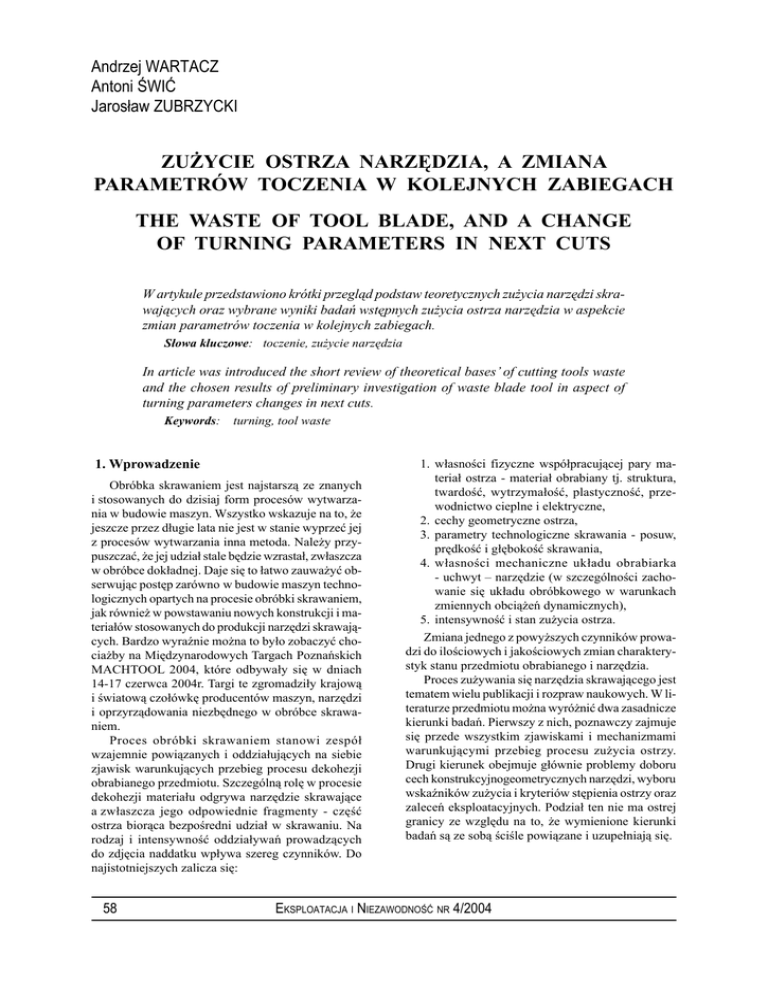 Andrzej WARTACZ Antoni ŚWIĆ Jarosław ZUBRZYCKI ZUŻYCIE OSTRZA NARZĘDZIA, A ZMIANA PARAMETRÓW TOCZENIA W KOLEJNYCH ZABIEGACH THE WASTE OF TOOL BLADE, AND A CHANGE OF TURNING PARAMETERS IN NEXT CUTS W artykule przedstawiono krótki przegląd podstaw teoretycznych zużycia narzędzi skrawających oraz wybrane wyniki badań wstępnych zużycia ostrza narzędzia w aspekcie zmian parametrów toczenia w kolejnych zabiegach. Słowa kluczowe: toczenie, zużycie narzędzia In article was introduced the short review of theoretical bases’ of cutting tools waste and the chosen results of preliminary investigation of waste blade tool in aspect of turning parameters changes in next cuts. Keywords: turning, tool waste 1. Wprowadzenie Obróbka skrawaniem jest najstarszą ze znanych i stosowanych do dzisiaj form procesów wytwarzania w budowie maszyn. Wszystko wskazuje na to, że jeszcze przez długie lata nie jest w stanie wyprzeć jej z procesów wytwarzania inna metoda. Należy przypuszczać, że jej udział stale będzie wzrastał, zwłaszcza w obróbce dokładnej. Daje się to łatwo zauważyć obserwując postęp zarówno w budowie maszyn technologicznych opartych na procesie obróbki skrawaniem, jak również w powstawaniu nowych konstrukcji i materiałów stosowanych do produkcji narzędzi skrawających. Bardzo wyraźnie można to było zobaczyć chociażby na Międzynarodowych Targach Poznańskich MACHTOOL 2004, które odbywały się w dniach 14-17 czerwca 2004r. Targi te zgromadziły krajową i światową czołówkę producentów maszyn, narzędzi i oprzyrządowania niezbędnego w obróbce skrawaniem. Proces obróbki skrawaniem stanowi zespół wzajemnie powiązanych i oddziałujących na siebie zjawisk warunkujących przebieg procesu dekohezji obrabianego przedmiotu. Szczególną rolę w procesie dekohezji materiału odgrywa narzędzie skrawające a zwłaszcza jego odpowiednie fragmenty - część ostrza biorąca bezpośredni udział w skrawaniu. Na rodzaj i intensywność oddziaływań prowadzących do zdjęcia naddatku wpływa szereg czynników. Do najistotniejszych zalicza się: 58 1. własności fizyczne współpracującej pary materiał ostrza - materiał obrabiany tj. struktura, twardość, wytrzymałość, plastyczność, przewodnictwo cieplne i elektryczne, 2. cechy geometryczne ostrza, 3. parametry technologiczne skrawania - posuw, prędkość i głębokość skrawania, 4. własności mechaniczne układu obrabiarka - uchwyt – narzędzie (w szczególności zachowanie się układu obróbkowego w warunkach zmiennych obciążeń dynamicznych), 5. intensywność i stan zużycia ostrza. Zmiana jednego z powyższych czynników prowadzi do ilościowych i jakościowych zmian charakterystyk stanu przedmiotu obrabianego i narzędzia. Proces zużywania się narzędzia skrawającego jest tematem wielu publikacji i rozpraw naukowych. W literaturze przedmiotu można wyróżnić dwa zasadnicze kierunki badań. Pierwszy z nich, poznawczy zajmuje się przede wszystkim zjawiskami i mechanizmami warunkującymi przebieg procesu zużycia ostrzy. Drugi kierunek obejmuje głównie problemy doboru cech konstrukcyjnogeometrycznych narzędzi, wyboru wskaźników zużycia i kryteriów stępienia ostrzy oraz zaleceń eksploatacyjnych. Podział ten nie ma ostrej granicy ze względu na to, że wymienione kierunki badań są ze sobą ściśle powiązane i uzupełniają się. EKSPLOATACJA I NIEZAWODNOŚĆ NR 4/2004 NAUKA I TECHNIKA 2. Kierunki badań Badania nad procesem skrawania jak i zużywania się narzędzi skrawających mają istotne znaczenie szczególnie w obecnej dobie. Obserwowany rozwój automatyzacji procesów wytwarzania a zwłaszcza systemów automatycznego sterowania powoduje korzystanie zarówno z narzędzi jak i obrabiarek o wysokiej jakości i niezawodności. W rozwoju ubytkowego kształtowania materiałów wysoką pozycję zajmuje obróbka z dużymi prędkościami skrawania HSC (High Speed Cutting). Stosowanie tego rodzaju obróbki daje konkretne korzyści ekonomiczno-technologiczne. Do jej zalet zaliczyć można: większą wydajność procesu obróbki, lepszą jakość powierzchni, zredukowane siły skrawania, korzystniejsze właściwości cieplne [1]. Stosując konwencjonalne sposoby obróbki, można uzyskiwać skracanie czasów wytwarzania tylko w bardzo uwarunkowanym zakresie. Główne możliwości oszczędności czasu realizacji stwarza obecnie obróbka z dużymi prędkościami. Relatywnie ogromne prędkości przesuwu, zapewnione przez napędy liniowe najnowszych HSC-centrów obróbkowych, umożliwiają skrócenie nieproduktywnych czasów pomocniczych oraz zwiększoną prędkość i elastyczność manipulowania narzędziami z wykorzystaniem jednoczesnego nadzorowania stanu narzędzi przed każdą ich wymianą. Równolegle z wprowadzaniem i rozwojem HSC prowadzone są badania i wdrożenia obróbki wysokowydajnej HPC (High Performance Cutting, High Productive Cutting). Obróbka HPC prowadzona jest z mniejszymi niż HSC prędkościami skrawania, ale za to z większymi wartościami posuwu. Podczas gdy HSC wymaga maszyn dysponujących dużą prędkością obrotową wrzecion i dużymi prędkościami przesuwów w poszczególnych osiach. HPC jest ukierunkowana również na wzrost wydajności ubytkowej uzyskiwany na istniejących, konwencjonalnych obrabiarkach. Obróbka wysokowydajna HPC łączy zalety obróbki HSC w odniesieniu do obróbki wykańczającej z dużą wydajnością ubytkową uzyskiwaną podczas obróbki zgrubnej, dzięki stosowaniu średnich prędkości skrawania i dużych posuwów narzędzia. 3. Charakterystyka procesu zużycia Zużywanie się ostrzy narzędzi determinowane jest szeregiem czynników i zjawisk składających się na proces skrawania. Przebiega ono w warunkach wysokich temperatur i nacisków powierzchniowych. Sumarycznie, zużycie ostrza skrawającego jest wynikiem nakładania się oraz wzajemnych interakcji kilku, a czasami kilkunastu, elementarnych procesów zu