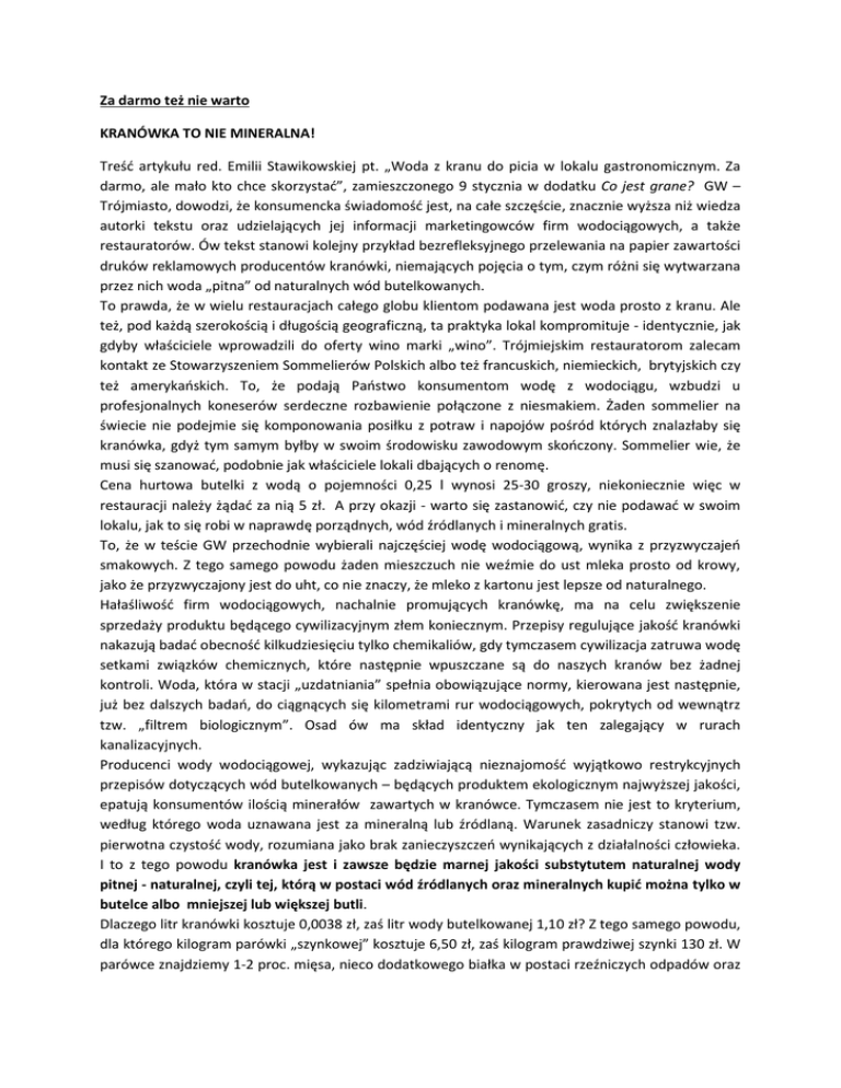 Za darmo też nie warto KRANÓWKA TO NIE MINERALNA! Treść