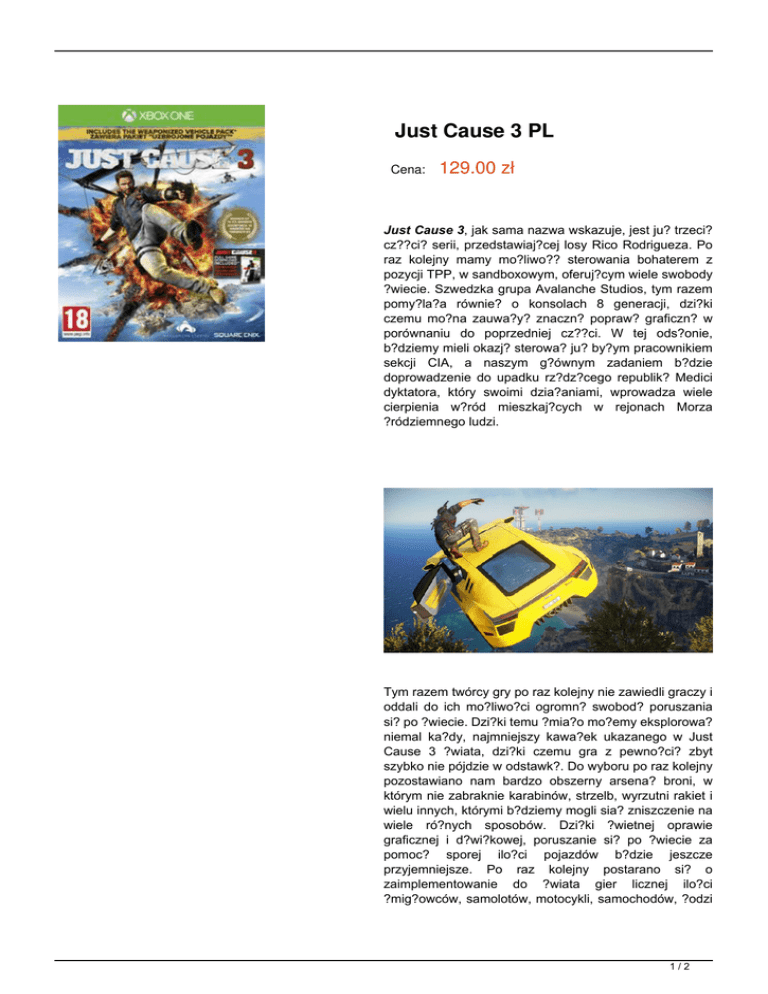 Just Cause 3 PL Cena: 129.00 zł Just Cause 3, jak sama nazwa wskazuje, jest ju? trzeci? cz??ci? serii, przedstawiaj?cej losy Rico Rodrigueza. Po raz kolejny mamy mo?liwo?? sterowania bohaterem z pozycji TPP, w sandboxowym, oferuj?cym wiele swobody ?wiecie. Szwedzka grupa Avalanche Studios, tym razem pomy?la?a równie? o konsolach 8 generacji, dzi?ki czemu mo?na zauwa?y? znaczn? popraw? graficzn? w porównaniu do poprzedniej cz??ci. W tej ods?onie, b?dziemy mieli okazj? sterowa? ju? by?ym pracownikiem sekcji CIA, a naszym g?ównym zadaniem b?dzie doprowadzenie do upadku rz?dz?cego republik? Medici dyktatora, który swoimi dzia?aniami, wprowadza wiele cierpienia w?ród mieszkaj?cych w rejonach Morza ?ródziemnego ludzi. Tym razem twórcy gry po raz kolejny nie zawiedli graczy i oddali do ich mo?liwo?ci ogromn? swobod? poruszania si? po ?wiecie. Dzi?ki temu ?mia?o mo?emy eksplorowa? niemal ka?dy, najmniejszy kawa?ek ukazanego w Just Cause 3 ?wiata, dzi?ki czemu gra z pewno?ci? zbyt szybko nie pójdzie w odstawk?. Do wyboru po raz kolejny pozostawiano nam bardzo obszerny arsena? broni, w którym nie zabraknie karabinów, strzelb, wyrzutni rakiet i wielu innych, którymi b?dziemy mogli sia? zniszczenie na wiele ró?nych sposobów. Dzi?ki ?wietnej oprawie graficznej i d?wi?kowej, poruszanie si? po ?wiecie za pomoc? sporej ilo?ci pojazdów b?dzie jeszcze przyjemniejsze. Po raz kolejny postarano si? o zaimplementowanie do ?wiata gier licznej ilo?ci ?mig?owców, samolotów, motocykli, samochodów, ?odzi 1/2 oraz innych dodatkowych elementów, takich jak cho?by znany z drugiej cz??ci gry hak umo?liwiaj?cy sprawne i efektowne przemieszczanie si? po ?wiecie. W tej cz??ci protagonista b?dzie mia? okazj? korzysta? wingsuitu (kombinezonu pozwalaj?cego na sprawne szybowanie w powietrzu), który z pewno?ci? u?atwi odnajdywanie wielu ciekawostek ukrytych w ?wiecie gry jak i wielu easter eggów, o które twórcy równie? si? postarali. W tej ods?onie jednak równie? nie spotkamy si? z mo?liwo?ci? prowadzenia internetowych rozgrywek, jednak tym razem twórcy umo?liwili graczom porównywanie swoich wyników dotycz?cych ró?nych wyzwa? zwi?zanych z gr?. 2/2 Powered by TCPDF (www.tcpdf.org)