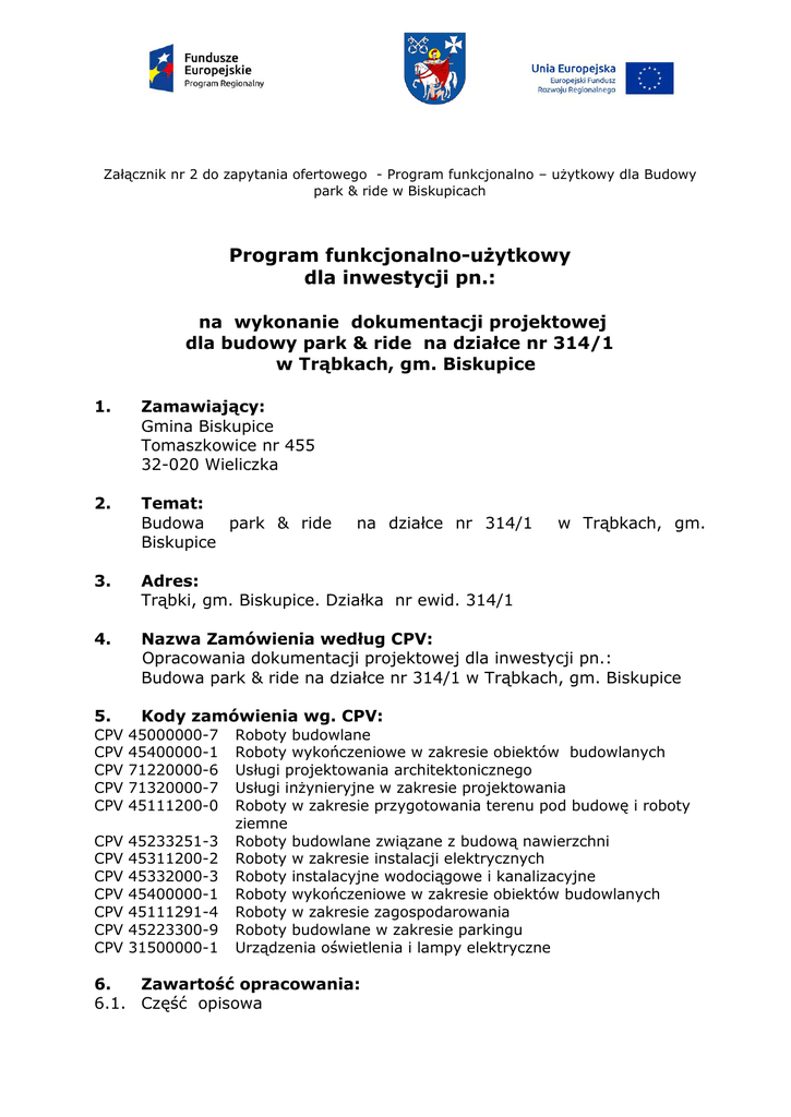 Załącznik nr 2 do zapytania ofertowego - Program funkcjonalno – użytkowy dla Budowy park & ride w Biskupicach Program funkcjonalno-użytkowy dla inwestycji pn.: na wykonanie dokumentacji projektowej dla budowy park & ride na działce nr 314/1 w Trąbkach, gm. Biskupice 1. Zamawiający: Gmina Biskupice Tomaszkowice nr 455 32-020 Wieliczka 2. Temat: Budowa park & ride Biskupice na działce nr 314/1 w Trąbkach, gm. 3. Adres: Trąbki, gm. Biskupice. Działka nr ewid. 314/1 4. Nazwa Zamówienia według CPV: Opracowania dokumentacji projektowej dla inwestycji pn.: Budowa park & ride na działce nr 314/1 w Trąbkach, gm. Biskupice 5. Kody zamówienia wg. CPV: CPV CPV CPV CPV CPV 45000000-7 45400000-1 71220000-6 71320000-7 45111200-0 CPV CPV CPV CPV CPV CPV CPV 45233251-3 45311200-2 45332000-3 45400000-1 45111291-4 45223300-9 31500000-1 Roboty budowlane Roboty wykończeniowe w zakresie obiektów budowlanych Usługi projektowania architektonicznego Usługi inżynieryjne w zakresie projektowania Roboty w zakresie przygotowania terenu pod budowę i roboty ziemne Roboty budowlane związane z budową nawierzchni Roboty w zakresie instalacji elektrycznych Roboty instalacyjne wodociągowe i kanalizacyjne Roboty wykończeniowe w zakresie obiektów budowlanych Roboty w zakresie zagospodarowania Roboty budowlane w zakresie parkingu Urządzenia oświetlenia i lampy elektryczne 6. Zawartość opracowania: 6.1. Część opisowa 6.2. Część informacyjna CZĘŚĆ OPISOWA PROGRAMU FUNKCJONALNO-UŻYTKOWEGO DLA BUDOWY PARK & RIDE DZIAŁCE NR 314/1 W TRĄBKACH, GM. BISKUPICE 1. Podstawa opracowania: ● ● Wypis z miejscowego planu zagospodarowania Gminy Biskupice Mapa zasadnicza terenu w skali 1:500 2. Opis ogólny przedmiotu zamówienia: NA Przedmiotem zamówienia jest wykonanie dokumentacji projektowej w zakresie inwestycji polegającej na budowie park & ride na działce nr 314/1 w Trąbkach, gm. Biskupice Zamówienie obejmuje: ●Wykonanie koncepcji programowo przestrzennej i zagospodarowania terenu ●Wykonanie projektu budowlanego i uzyskanie wynikających z przepisów opinii, uzgodnień i prawomocnego pozwolenia na budowę przedmiotu zamówienia. ●Wykonanie projektów wykonawczych dla projektowanej inwestycji ●Wykonanie przedmiaru robót i kosztorysów inwestorskich ● Wykonanie STWiORB ● Komplet dokumentacji projektowej na nośnikach elektronicznych ● Pełnienie nadzoru autorskiego przy realizacji inwestycji 3. Charakterystyczne parametry charakteryzujące wielkość inwestycji: Park & ride projektuje się na działce nr 314/1 w miejscowości Trabki, działka zabudowana jest w części budynkiem kaplicy, od strony wschodniej przylega do drogi wojewódzkiej relacji Kraków -Gdów. Dojazd do projektowanej inwestycji w oparciu o przylegające drogi publiczne. Projektowa na inwestycji pn.: park & ride ma być elementem systemu parkingów zlokalizowanych na terenie metropolii krakowskiej przy węzłach i przystankach transportu zbiorowego, umożliwiających pozostawienie samochodu i kontynuowanie podróży środkiem transportu zbiorowego oraz zwiększeniu atrakcyjności komunikacji zbiorowej i poruszania się transportem zbiorowym. W ramach przedmiotowej inwestycji na terenie działki nr 314/1 projektuje się place manewrowe, miejsca postojowe dla samochodów osobowych pozostawionych na czas podróży środkami transportu publicznego, chodniki i miejsca do wsiadania i wysiadania, co najmniej jedno miejsce postojowe dla środków transportu zbiorowego dla wsiadających i wysiadających, wiatę dla oczekujących na transport publiczny, zadaszone miejsca na bezpieczne przechowanie rowerów. Projektowany teren powinien być dostępny dla osób niepełnosprawnych. Place, parkingi i chodniki o nawierzchni utwardzonej wyposażone w kanalizacją opadową z odprowadzeniem ścieków opadowych do zbiornika na wody opadowe. Zjazd na teren parkingu powinien mieć kategorię i parametry zjazdu publicznego. Teren powinien być oświetlony, wyposażony w monitoring i oznakowanie w oparciu o projekt graficzny znaków jednolity dla całej Metropolii krakowskiej. 3.1. Charakterystyczne parametry określające wielkość inwestycji: Parking park & ride projektowany jest na terenie działki budowlanej nr 314/1 w miejscowości Trąbki. Przedmiotowa inwestycja powinna zapewnić podróżnym maksymalny i wygodny dostęp do środków transportu zbiorowego. W ramach inwestycji należy zaprojektować elementy i urzadzenia: ● Zatoka postojowa umożliwiająca zatrzymanie się przynajmniej jednego pojazdu dla wysiadających i wsiadających ● Peron dla wysiadających i wsiadających przy zatoce park & ride dostępny dla niepełnosprawnych ● Miejsca zadaszone dla podróżnych: wiata zadaszenia dla podróżnych, z miejscami do siedzenia dla podróżnych ● Zatoka postojowa umożliwiająca zatrzymanie się na krótko samochodu, pożegnanie i wysiadanie przynajmniej dla jednego samochodu Kiss & Ride ● Miejsca postojowe dla samochodów o wym. 2,50 x 5,0 m, / 3,6 x 5,0 dla niepełnosprawnych/, nawierzchnia utwardzona ● Miejsca postojowe dla rowerów w tym: wiata zadaszenia, stojaki rowerowe w kształcie odwróconego U ● Oznakowania parkingu: wjazd i wyjazd, miejsca postojowe, itp. ● Oświetlenie parkingu i terenu / technologia energooszczędna/ ● Likwidacja barier dla niepełnosprawnych / miejsca postojowe dla samochodów dla osób z niepełnosprawnością/ ● Infrastruktura zwiększająca bezpieczeństwo użytkowników: /progi zwalniające, wyniesione przejścia dla pieszych ● Infrastruktura umożliwiająca utrzymanie porządku ● Zieleń o właściwościach izolacyjnych i dekoracyjnych ● Przebudowa zjazdów z drogi publicznej 3.2. Lp. Wykaz realizowanych obiektów w zakresie projektu i zamówienia: Wykaz realizowanych obiektów Pow. użytkowa / szt lub m² / (orientacyjnie) 1. Zatoka postojowa umożliwiająca zatrzymanie się przynajmniej jednego pojazdu dla wysiadających i wsiadających 2. Peron dla wysi