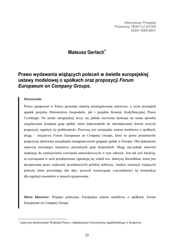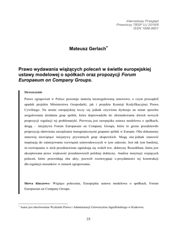 Internetowy Przegląd Prawniczy TBSP UJ 2016/8 ISSN 1689-9601 Mateusz Gerlach Prawo wydawania wiążących poleceń w świetle europejskiej ustawy modelowej o spółkach oraz propozycji Forum Europaeum on Company Groups. Streszczenie Prawo zgrupowań w Polsce pozostaje materią nieuregulowaną ustawowo, o czym przesądził upadek projektu Ministerstwa Gospodarki, jak i projektu Komisji Kodyfikacyjnej Prawa Cywilnego. Na arenie europejskiej toczy się jednak ożywiona dyskusja na temat sposobu uregulowania działania grup spółek, która doprowadziła do sformułowania dwóch nowych propozycji regulacji tej problematyki. Pierwszą jest europejska ustawa modelowa o spółkach, drugą – inicjatywa Forum Europaeum on Company Groups, które to grono przedstawiło propozycję ułatwienia zarządzania transgranicznymi grupami spółek w Europie. Oba dokumenty stanowią niewiążące inicjatywy prywatnych grup eksperckich. Mogą one jednak stanowić inspirację do zainicjowania rozwiązań ustawodawczych w tym zakresie. Jest tak tym bardziej, że rozwiązania w nich przedstawione ogniskują się wokół tzw. doktryny Rozenblum, która jest akceptowana przez większość przedstawicieli polskiej doktryny. Analiza instytucji wiążących poleceń, które przewidują oba akty, pozwoli rozstrzygnąć o przydatności tej konstrukcji dla regulacji stosunków w ramach zgrupowania. Słowa kluczowe: Wiążące polecenia, Europejska ustawa modelowa o spółkach, Forum Europaeum on Company Groups. Autor jest absolwentem Wydziału Prawa i Administracji Uniwersytetu Jagiellońskiego w Krakowie. 25 1. Wstęp Działalność podmiotów gospodarczych w formie grup spółek to ekonomiczna rzeczywistość. W szczególności duże podmioty tworzą rozbudowane struktury grupy przez zakładanie lub przejmowanie spółek zależnych, w których lokują one poszczególne kategorie swojej działalności. Ten fenomen wymyka się ustawowej regulacji. Dlatego też wielu autorów wypowiadało się na temat potrzeby regulacji prawa zgrupowań w Polsce1. Słusznie wskazywali oni, że obecny stan prawny znacznie zwiększa ryzyko gospodarcze funkcjonowania grup spółek oraz wywołuje koszty transakcyjne2. Od czasu zgłoszenia tych postulatów, pojawiły się jednak dwie nowe propozycje uregulowania tej skomplikowanej problematyki prawnej. Pierwszą z nich jest rozdział 15 europejskiej ustawy modelowej o spółkach (European Model Company Act, dalej: EMCA lub ustawa modelowa)3. Drugą jest inicjatywa Forum Europaeum on Company Groups, które to grono przedstawiło propozycję ułatwienia zarządzania transgranicznymi grupami spółek w Europie (Proposal to facilitate the management of cross-border company groups in Europe, dalej: propozycja FECG)4. Obie te inicjatywy proponują państwom członkowskim Unii Europejskiej rozwiązania, które mają umożliwić sprawniejsze zarządzanie grupą i ułatwić wprowadzenie jednolitej strategii biznesowej dla całego zgrupowania. W propozycjach Grupy Roboczej EMCA akcentowana jest przede wszystkim potrzeba spojrzenia na problemy prawa koncernowego z perspektywy spółki-matki (<<top-down>> perspective)5. Natomiast propozycja FECG już w samej nazwie określa swój cel jako ułatwienie zarządzania grupami spółek. Głównym narzędziem, zmierzającym do osiągnięcia tego celu, jest prawo do wydawania wiążących poleceń przez spółkę-matkę spółkom-córkom, które przewidują oba omawiane dokumenty. Mało realistyczne wydaje się aktualnie całościowe przeniesienie rozwiązań ustawy modelowej 1 Zob. m. in. M. Romanowski, W sprawie potrzeby nowej regulacji prawa grup kapitałowych w Polsce, PPH, 7/2008, s. 4-12; T. Staranowicz, Podstawowe problemy regulacji koncernu w prawie spółek, KPP, 2/2009, s. 371-404; A. Opalski, M. Romanowski, O potrzebie zasadniczej reformy polskiego prawa spółek, PPH, 6/2008, s. 4-11. 2 A. Opalski, M. Romanowski, O potrzebie…, s. 8. 3 Europejska ustawa modelowa o spółkach, http://www.commerciallaw.com.ua/attachments/article/96/Final%20Draft%20EMCA%20Code.pdf, 15.7.2016 r. 4 Propozycja ułatwienia zarządzania transgranicznymi grupami spółek w http://www.transformacje.pl/wp-content/uploads/2015/08/tpp_-2-2015_forum.pdf, 15.7.2016 r. 5 Ogólne uwagi do rozdziału 15 ustawy modelowej, s. 394. 26 Europie, czy propozycji FECG na grunt prawa polskiego. Akty te mogą jednak inspirować działania polskiego ustawodawcy w niektórych aspektach, przykładowo w zakresie rozpoznania interesu grupy czy przyznania prawa wydawania wiążących poleceń6. Warto zatem przedstawić rozwiązania zawarte w ustawie modelowej oraz propozycji FECG oraz ocenić czy, i ewentualnie w jakim kształcie, instytucja wiążących poleceń jest pożądanym instrumentem regulacyjnym grup spółek działających w Polsce. 2. Prawo wydawania wiążących poleceń według ustawy modelowej Mechanizmem, który ułatwiłby znacząco zarządzanie całym zgrupowaniem jest prawo wydawania wiążących poleceń7. Ustawa modelowa rozpoznaje to prawo bez rozszerzania w żaden sposób odpowiedzialności spółki-matki, a także bez nakładania na nią dodatkowych obowiązków. To elastyczne podejście wynika z doświadczeń innych systemów prawa spółek, w których uzależnienie kierowania spółkami zależnymi od przyjęcia odpowiedzialności za zobowiązania spółki zależnej okazało się zbyt rygorystyczne. Przykładem jest rozwiązanie zawarte w niemieckim Aktiengesetz, które ustanawia, w § 322, solidarną odpowiedzialność „głównej spółki” wobec wierzycieli „spółki zintegrowanej” za zobowiązania, które powstały przed utworzeniem grupy, jak i za wszystkie zobowiązania, które powstały po utworzeniu grupy. Ta surowa odpowiedzialność sprawiła, że rozwiązania te zostały pozbawione praktycznego znaczenia, a przez to efektywności. Nieracjonalne byłoby bowiem przyjmowanie odpowiedzialności i wydawanie poleceń, skoro nieformalną drogą można osiągną