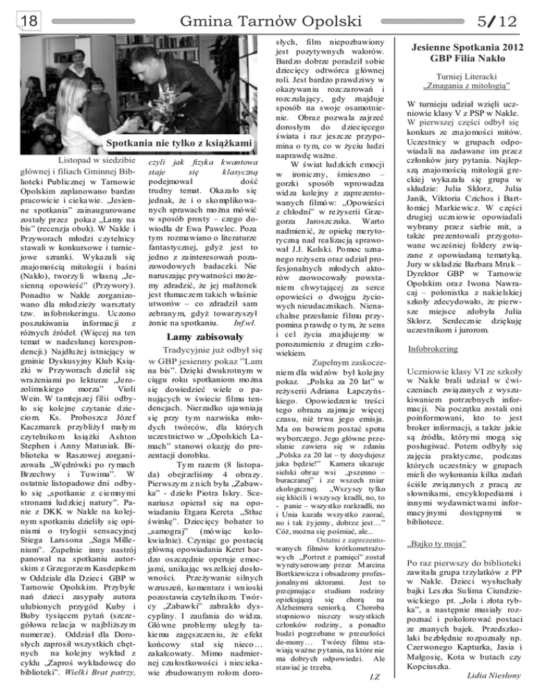 18 Gmina Tarnow Opolski Spotkania nie tylko z książkami siedzibie ╜ℓĊ◘♫ĂListopad ŕ Ŏ ℓ╜śŕ w ū╜Ľ╜ ś ┼░☺Ŏgłównej filiach Gminnej nej ii filiach Gminnej Biblioteki Publicznej w Tarnowie Opolskim zaplanowano bardzo pracowicie i ciekawie. „Jesienne spotkania” zainaugurowane zostały przez pokaz „Lamy na bis” (recenzja obok). W Nakle i Przyworach młodzi czytelnicy stawali w konkursowe i turniejowe szranki. Wykazali się znajo mością mitologii i baśni (Nakło), tworzy li własną „Jesienną opowieść” (Przywory). Ponadto w Nakle zorganizowano dla młod zieży warsztaty tzw. in fobrokeringu. Uczono poszukiwania informacji z różnych źródeł. (Więcej na ten temat w nadesłanej korespondencji.) Najdłu żej istniejący w gminie Dyskusyjny Klub Książki w Przyworach d zielił się wrażeniami po lekturze „Jerozolimskiego morza” Violi Wein. W tamtejszej filii odbyło się kolejne czytanie d ziecio m. Ks. Proboszcz Józef Kaczmarek przybliży ł mały m czytelniko m książki Ashton Stephen i Anny Matusiak. Biblioteka w Raszowej zorganizowała „Wędrówki po ry mach Brzechwy i Tuwima”. W ostatnie listopadowe dni odbyło się „spotkanie z ciemny mi stronami lud zkiej natury”. Panie z DKK w Nakle na ko lejnym spotkaniu dzieliły się opiniami o trylogii sensacyjnej Stiega Larssona „Saga Millenium”. Zupełnie inny nastrój panował na spotkaniu autorskim z Grzegorzem Kasdepkem w Oddziale dla Dzieci GBP w Tarnowie Opolskim. Przybyłe nań dzieci zasypały autora ulubionych przygód Kuby i Buby tysiącem pytań (szczegółowa relacja w najbliższy m numerze). Oddział dla Dorosłych zaprosił wszystkich chętnych na kolejny wykład z cyklu „Zaproś wykładowcę do biblioteki”. Wielki Brat patrzy, [ czyli jak fizyka kwantowa staje się klasyczną podejmował dość trudny temat. Okazało się jednak, że i o sko mpliko wanych sprawach mo żna mó wić w sposób prosty – czego dowiodła dr Ewa Pawelec. Poza tym rozmawiano o literaturze fantastycznej, gdyż jest to jedno z zainteresowań pozazawodowych badaczki. Nie naruszając prywatności mo żemy zdradzić, że jej małżonek jest tłumaczem takich właśnie utworów – co zdradził sam zebrany m, gdyż towarzyszył żonie na spotkaniu. Inf.wł. Lamy zabisowały Ç Tradycyjnie już ʼnĂŕ ŦľŦ╨■╜ś ╨ĵ Ų ◘ŕ odbył ĽŦ░ℓ╜Źsię Ŏ GBPjesienny jesiennypokaz pokaz ”Lam ”Lam w GBP na bis”. Dzięki dwukrotnym w ciągu roku spotkaniom mo żna się dowiedzieć wiele o panujących w świecie filmu tendencjach. Nierzadko ujawniają się przy ty m nazwiska młodych twórców, dla których uczestnictwo w „Opolskich Lamach” stanowi o kazję do prezentacji dorobku. Ty m razem (8 listopada) obejrzeliśmy 4 obrazy. Pierwszy m z n ich była „Zabawka” - d zieło Piotra Iskry. Scenariusz opierał się na opowiadaniu Etgara Kereta „Stłuc świnkę”. Dziecięcy bohater to „samograj” (mó wiąc ko lokwialnie). Czyniąc go postacią główną opowiadania Keret bardzo oszczędnie operuje emocjami, unikając ws zelkiej dosłowności. Przeżywanie silnych wzruszeń, ko mentarz i wn ioski pozostawia czyteln iko m. Twórcy „Zabawki” zabrakło dyscypliny. I zaufania do wid za. Głó wne problemy uleg ły takiemu zagęszczen iu, że efekt końcowy stał się nieco … zakalcowaty. Mimo nadmiernej czu łostkowości i nieciekawie zbudowanym rolo m doro- 5 12 słych, film niepozbawiony jest pozytywnych walorów. Bard zo dobrze poradził sobie dziecięcy odtwórca g łównej roli. Jest bardzo p rawd ziwy w okazywan iu rozczarowań i rozczulający, gdy znajduje sposób na swoje osamotnienie. Obraz pozwala zajrzeć dorosłym do d ziecięcego świata i raz jeszcze przypomina o ty m, co w życiu ludzi naprawdę ważne. W świat lud zkich emocji w ironiczny, śmieszno – gorzki sposób wprowadza wid za kolejny z zaprezentowanych filmó w: „Opowieści z chłodni” w reżyserii Grzegorza Jaroszczuka. Warto nadmien ić, że opiekę merytoryczną nad realizacją sprawował J.J. Kolski. Po moc uznanego reżysera oraz udział profesjonalnych młodych aktorów zaowocowały powstaniem chwytającej za serce opowieści o dwojgu życiowych nieudacznikach. Nienachalne przesłanie filmu przypomina p rawdę o ty m, że sens i cel życia znajdujemy w porozumieniu z drugim człowiekiem. ùZupełnym ĵ ♫ś░■Ŧ▓ ūĂ ℓ╫◘ľ ūśzaskoczeniem dla wid zów był kolejny pokaz. „Polska za 20 lat” w reżyserii Adriana Łapczyńskiego. Opowiedzen ie treści tego obrazu zajmu je więcej czasu, niż trwa jego emisja. Ma on bowiem postać spotu wyborczego. Jego główne przesłanie zawiera się w zdaniu „Polska za 20 lat – ty decydujesz jaka będzie!” Kamera ukazuje sielski obraz wsi „pszenno – buraczanej” i ze wszech miar ekologicznej. „Wszyscy tylko się kłócili i wszyscy kradli, no, to - panie – wszystko rozkradli, no i Unia kazała wszystko zaorać, no i tak żyjemy, dobrze jest…” Cóż, można się pośmiać, ale... h ℓĊ ĂĊ■╜ ū z ūĂ ♫ʼnśūś■Ċ◘Ostatni zaprezentowanych filmów krótkometrażowych „Portret z pamięci” został wyreżyserowany przez M arcina Bortkiewicza i obsadzony profesjonalnymi aktorami. Jest to przejmujące studium rodziny opiekującej się chorą na Alzheimera seniorką. Choroba stopniowo niszczy wszystkich członków rodziny, a ponadto budzi pogrzebane w przeszłości de-mony… Twórcy filmu stawiają ważne pytania, na które nie ma dobrych odpowiedzi. Ale stawiać je trzeba. I.Z Jesienne Spotkania 2012 Jesienne Spotkania D. t C╜ ▄╜Ă b Ă╫░◘2012 GBP Filia Nakło Ç ĵ ʼn■╜ ś╨[ ╜ĊśʼnĂ ľ╫╜ ù ▓Ă┼Ă■╜Ă Turniej Literacki z„Zmagania mitologią”z mitologią” íW turnieju Ċĵ ʼn■╜ś╨ĵ udział ĵ ŕ ū╜Ă░wzięli Ŏū╜Ź▄╜uczĵ ľūniowie klasy V z PSP PSP w Nakle. niowie Nakle. íW pierwszej ♫╜śʼnŎℓūś╨części ľ ūŹ□ľ╜odb