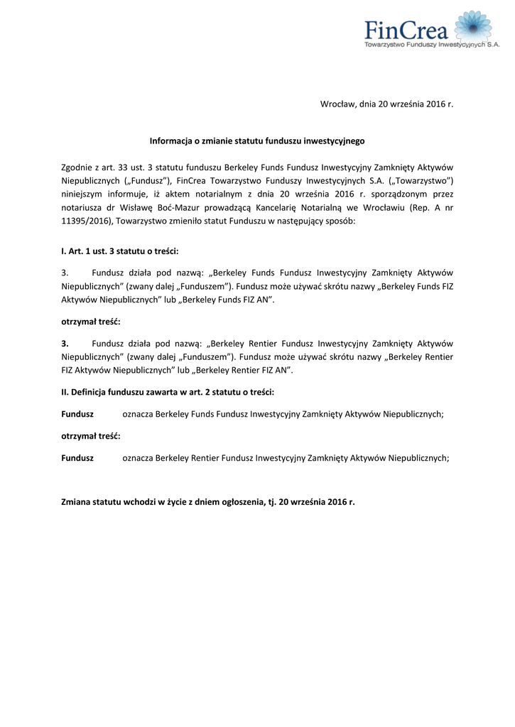 Wrocław, dnia 20 września 2016 r. Informacja o zmianie statutu funduszu inwestycyjnego Zgodnie z art. 33 ust. 3 statutu funduszu Berkeley Funds Fundusz Inwestycyjny Zamknięty Aktywów Niepublicznych („Fundusz”), FinCrea Towarzystwo Funduszy Inwestycyjnych S.A. („Towarzystwo”) niniejszym informuje, iż aktem notarialnym z dnia 20 września 2016 r. sporządzonym przez notariusza dr Wisławę Boć-Mazur prowadzącą Kancelarię Notarialną we Wrocławiu (Rep. A nr 11395/2016), Towarzystwo zmieniło statut Funduszu w następujący sposób: I. Art. 1 ust. 3 statutu o treści: 3. Fundusz działa pod nazwą: „Berkeley Funds Fundusz Inwestycyjny Zamknięty Aktywów Niepublicznych” (zwany dalej „Funduszem”). Fundusz może używać skrótu nazwy „Berkeley Funds FIZ Aktywów Niepublicznych” lub „Berkeley Funds FIZ AN”. otrzymał treść: 3. Fundusz działa pod nazwą: „Berkeley Rentier Fundusz Inwestycyjny Zamknięty Aktywów Niepublicznych” (zwany dalej „Funduszem”). Fundusz może używać skrótu nazwy „Berkeley Rentier FIZ Aktywów Niepublicznych” lub „Berkeley Rentier FIZ AN”. II. Definicja funduszu zawarta w art. 2 statutu o treści: Fundusz oznacza Berkeley Funds Fundusz Inwestycyjny Zamknięty Aktywów Niepublicznych; otrzymał treść: Fundusz oznacza Berkeley Rentier Fundusz Inwestycyjny Zamknięty Aktywów Niepublicznych; Zmiana statutu wchodzi w życie z dniem ogłoszenia, tj. 20 września 2016 r.