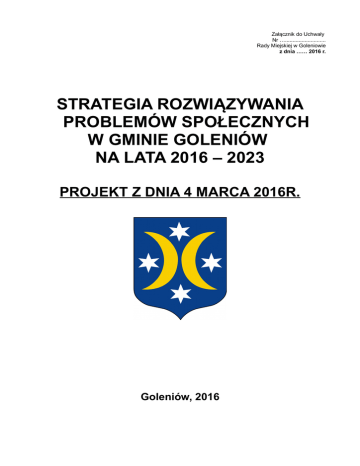 Załącznik do Uchwały Nr …........................... Rady Miejskiej w Goleniowie z dnia …… 2016 r. STRATEGIA ROZWIĄZYWANIA PROBLEMÓW SPOŁECZNYCH W GMINIE GOLENIÓW NA LATA 2016 – 2023 PROJEKT Z DNIA 4 MARCA 2016R. Goleniów, 2016 Strategia Rozwiązywania Problemów Społecznych w Gminie Goleniów na lata 2016-2023 Opracowanie: Zbigniew Łukaszewski Monika Garncarek Warsztaty z mieszkańcami prowadził: Zbigniew Łukaszewski Wykorzystano materiały: Business Mobility International Spółka z o.o. ul. Drewsa 4E; 61 – 606 Poznań oraz Poakcesyjnego Programu Wspierania Obszarów Wiejskich Strategia Rozwiązywania Problemów Społecznych w Gminie Goleniów na lata 2016-2023 SPIS TREŚCI STRONA WPROWADZENIE 4 I. Uwarunkowania prawne i zasady opracowania Strategii 5 II. Uwarunkowania Strategii wynikające z członkostwa w Unii Europejskiej oraz polityki społecznej realizowanej na różnych szczeblach administracji 7 CZĘŚĆ DIAGNOSTYCZNO-ANALITYCZNA 12 I. Uwarunkowania demograficzne 13 II. Problemy społeczne – charakterystyka grup zagrożonych wykluczeniem społecznym 14 1. Bezrobocie 16 2. Niepełnosprawność i długotrwała lub ciężka choroba 22 3. Ubóstwo 24 4. Bezradność w sprawach opiekuńczo wychowawczych 25 5. Bezdomność 27 6. Alkoholizm 28 7. Narkomania 29 8. Seniorzy 30 III. Pomoc społeczna – podstawowe dane statystyczne 34 IV. Aktywność społeczna 36 V. Analiza SWOT 37 CZĘŚĆ STRATEGICZNA 39 I. Misja 40 II. Cele strategiczne, cele szczegółowe, kierunki działań oraz wskaźniki 41 1. Cel strategiczny I - Wzmocnienie rodziny 41 2. Cel strategiczny II – Poprawa warunków życia seniorów 43 3. Cel strategiczny III – Działanie na rzecz poprawy jakości życia osób niepełnosprawnych 45 4. Cel strategiczny IV – Rozwój edukacji społecznej 45 5. Cel strategiczny V – Wspieranie rozwoju społeczności lokalnych 47 ZARZĄDZANIE REALIZACJĄ STRATEGII 48 I. Wdrażanie, monitoring i ewaluacja 49 II. Finansowanie 50 SPIS WYKRESÓW 51 SPIS TABEL 52 3 Strategia Rozwiązywania Problemów Społecznych w Gminie Goleniów na lata 2016-2023 WPROWADZENIE 4 Strategia Rozwiązywania Problemów Społecznych w Gminie Goleniów na lata 2016-2023 I. Uwarunkowania prawne i zasady opracowania Strategii Strategia Rozwiązywania Problemów Społecznych jest narzędziem polityki społecznej gminy a obowiązek jej opracowania wynika wprost z art. 17 ust. 1 pkt 1 ustawy o pomocy społecznej z dnia 12 marca 2004 r. (Dz. U. z 2015 r. poz. 163 ze zmianami): „Do zadań własnych gminy o charakterze obowiązkowym należy opracowanie i realizacja gminnej strategii rozwiązywanie problemów społecznych ze szczególnym uwzględnieniem programów pomocy społecznej, profilaktyki i rozwiązywania problemów alkoholowych i innych, których celem jest integracja osób i rodzin z grup szczególnego ryzyka”. Nie brakuje opinii, że obecnie funkcjonujący system rozwiązywania problemów społecznych raczej np. utrwala biedę, niż pozwala z niej wyjść. Przez ponad 25 lat system, który miał w założeniu wspierać i pomagać, był w niewielkim stopniu zmieniany i nie spełniał swojej roli. Dla 1,3 mln rodzin w Polsce stał się sposobem na życie, w którym najistotniejsze jest funkcjonowanie od zasiłku do zasiłku. Wyzwania XXI wieku, złożoność ludzkich problemów wymagają jednak elastycznej, sprawnie reagującej struktury społecznej, która funkcjonuje w oparciu o sześć zasad rozwoju społecznego. Zasada 1. Wyrównywanie szans i podnoszenie jakości życia. Odnosi się do postrzegania mieszkańców danej społeczności lokalnej jako całości. Nadmierna polaryzacja społeczna prowadzi do napięć i konfliktów społecznych. Osobom wymagającym wsparcia społecznego należy umożliwić jednakowe szanse dla osiągnięcia zaspokojenia potrzeb życiowych. Działania powinny respektować zasadę pomocniczości zgodnie, z którą w pierwszej kolejności potrzeby winny być zaspakajanie poprzez rodzinę, społeczność lokalną a dopiero w dalszej kolejności przez gminę czy państwo. W działaniach winno dążyć się do usamodzielnienia osób i rodzin oraz ich integracji ze środowiskiem lokalnym. Rozwiązywanie problemów społecznych w istocie wpływa na podnoszenie jakości życia w społeczności lokalnej. Zasada 2. Wsparcie dla istniejących inicjatyw prospołecznych. Poprzez tę zasadę dąży się do dokonania wzmocnienia potencjału lokalnych instytucji działających w sferze społecznej. Ich znaczenie jest ogromne z punktu widzenia integracji społecznej, zaspakajania potrzeby przynależności. Działalność wielu instytucji trzeciego sektora oparta jest o działalność wolontarystyczną. Zapewnia to zarówno możliwość zwiększania zaangażowania społecznego mieszkańców, jak i rozwój potencjału danej organizacji. Zasada 3. Tworzenie nowych inicjatyw prospołecznych wspierających integrację społeczną. Ważne aby scenariusze, które dotyczą rozwiązywania problemów pojawiających się w społeczności lokalnej, pozwalały na zaspokojenie potrzeb społecznych, rozwiązanie problemów oraz zacieśnienie więzi miedzy mieszkańcami. Charakterystyczne jest jednak to, iż inicjatywy takie powoli „zamierają” i bez dalszego wsparcia nie mają szans na zrealizowanie wielu ciekawych przedsięwzięć. Inicjatywy społeczne wymagają 5 Strategia Rozwiązywania Problemów Społecznych w Gminie Goleniów na lata 2016-2023 wsparcia w dłuższej perspektywie czasowej -niewystarczające są działania związane z pomocą w uruchomieniu/sformalizowaniu przedsięwzięcia, ale potrzebna jest pomoc w dalszym funkcjonowaniu. Zasada 4. Tworzenie działań o szerokim zasięgu. Problemy społeczne mają wielowymiarowy charakter i ich rozwiązanie wymaga systemowych rozstrzygnięć, zintegrowanej współpracy instytucjonalnej. Oddziaływanie na poszczególne problemy społeczne pozwala i winno oddziaływać na inne sfery. Zasada 5. Tworzenie działań o długotrw