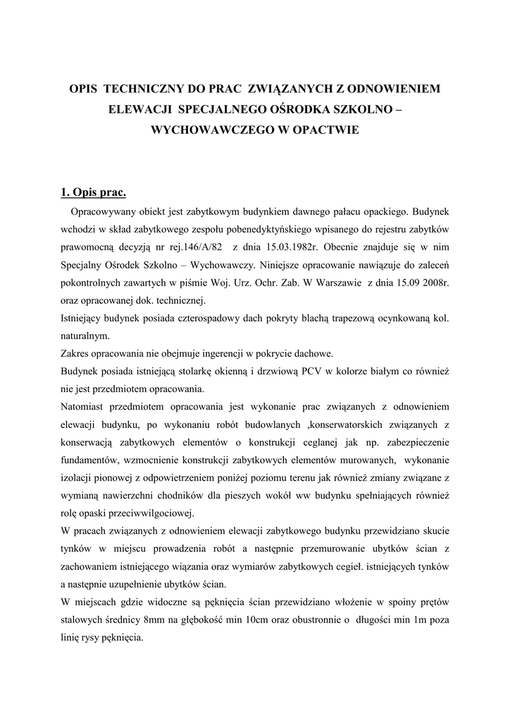 OPIS TECHNICZNY DO PRAC ZWIĄZANYCH Z ODNOWIENIEM ELEWACJI SPECJALNEGO OŚRODKA SZKOLNO – WYCHOWAWCZEGO W OPACTWIE 1. Opis prac. Opracowywany obiekt jest zabytkowym budynkiem dawnego pałacu opackiego. Budynek wchodzi w skład zabytkowego zespołu pobenedyktyńskiego wpisanego do rejestru zabytków prawomocną decyzją nr rej.146/A/82 z dnia 15.03.1982r. Obecnie znajduje się w nim Specjalny Ośrodek Szkolno – Wychowawczy. Niniejsze opracowanie nawiązuje do zaleceń pokontrolnych zawartych w piśmie Woj. Urz. Ochr. Zab. W Warszawie z dnia 15.09 2008r. oraz opracowanej dok. technicznej. Istniejący budynek posiada czterospadowy dach pokryty blachą trapezową ocynkowaną kol. naturalnym. Zakres opracowania nie obejmuje ingerencji w pokrycie dachowe. Budynek posiada istniejącą stolarkę okienną i drzwiową PCV w kolorze białym co równieŜ nie jest przedmiotem opracowania. Natomiast przedmiotem opracowania jest wykonanie prac związanych z odnowieniem elewacji budynku, po wykonaniu robót budowlanych ,konserwatorskich związanych z konserwacją zabytkowych elementów o konstrukcji ceglanej jak np. zabezpieczenie fundamentów, wzmocnienie konstrukcji zabytkowych elementów murowanych, wykonanie izolacji pionowej z odpowietrzeniem poniŜej poziomu terenu jak równieŜ zmiany związane z wymianą nawierzchni chodników dla pieszych wokół ww budynku spełniających równieŜ rolę opaski przeciwwilgociowej. W pracach związanych z odnowieniem elewacji zabytkowego budynku przewidziano skucie tynków w miejscu prowadzenia robót a następnie przemurowanie ubytków ścian z zachowaniem istniejącego wiązania oraz wymiarów zabytkowych cegieł. istniejących tynków a następnie uzupełnienie ubytków ścian. W miejscach gdzie widoczne są pęknięcia ścian przewidziano włoŜenie w spoiny prętów stalowych średnicy 8mm na głębokość min 10cm oraz obustronnie o długości min 1m poza linię rysy pęknięcia. Po wykonaniu powyŜszych czynności uzupełnić na ścianach tynk zabezpieczający, konserwatorski : z obrzutką wstępną np. Baumit Vor Spritzer i tynk BAUMIT HBBY PUTZ w kolorze białym analogicznie jak elewacje sąsiedniego zabytkowego budynku kościoła pobenedygdyńskiego. Istniejący zabytkowy cokolik na obwodzie budynku o wysokości ok. 50cm naleŜy pokryć równieŜ tynkiem typu baumit lecz kolorze szarym. Wszystkie zachowane detale architektoniczne a w szczególności profile ciągnione gzymsu wieńczonego naleŜy uszanować natomiast w miejscu ubytków dokonać stosownych uzupełnień. Istniejące ściany fundamentowe oraz części podpiwniczona budynku, po wykonaniu wzmocnienia pod nimi gruntu metodą iniekcji „jet grouting” ,naleŜy usztywnić poprzez wykonanie wieńca obwodowego, Ŝelbetowego o grubości 40cm od poziomu posadowienia ścian do wysokości min 30cm poniŜej poziomu terenu z uwzględnieniem spadków ww opaski przeciwwilgociowej. Celem osuszenia terenu wokół ww budynku naleŜy wykonać drenaŜ opaskowy wg odrębnego opracowania. Odwodnienia połaci dachowych na tle ścian zewnętrznych i gzymsu wińczącego, naleŜy wykonać jako wymianę istniejącego układu rynien i rur spustowych stalowych ocynkowanych które następnie naleŜy pomalować emailą zewnętrzną w kolorze białym. Wokół całego budynku przewidziano odtworzenie nawierzchni chodników i opasek o nawierzchni z kostki brukowej granitowej. Teren najbliŜszego otoczenia winien być zniwelowany tak Ŝeby woda opadowa odpływała od budynku. UWAGA: Przed przystąpieniem do robót budowlanych zapoznać się z całością dokumentacji. Roboty prowadzić zgodnie z:warunkami pozwolenia na budowę , z projektem , z polskimi normami i przepisami , przestrzegając instrukcji producentów i dostawców. Stosować materiały , elementy i wyroby posiadające aktualne aprobaty techniczne , atesty higieniczno – sanitarne i certyfikaty bezpieczeństwa (m.in. ochrona przeciwporaŜeniowa). Sygnalizować jednostce projektowej wystąpienie kolizji lub zagroŜeń dla prawidłowej realizacji i eksploatacji obiektu, do czasu otrzymania wyjaśnień wstrzymać dane roboty.(rozwiązania zamienne konsultować z nadzorem autorskim). OPRACOWAŁ: PROJEKTOWAŁ: mgr inŜ. Karol Grysiński mgr inŜ. arch. Konrad Brejtkop 67/69