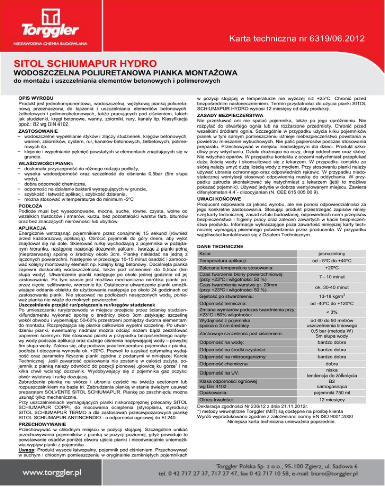 Karta techniczna nr 6319/06.2012 SITOL SCHIUMAPUR HYDRO WODOSZCZELNA POLIURETANOWA PIANKA MONTAŻOWA do montażu i uszczelniania elementów betonowych i polimerowych OPIS WYROBU Produkt jest jednokomponentową, wodoszczelną, wężykową pianką poliuretanową przeznaczoną do łączenia i uszczelniania elementów betonowych, żelbetowych i polimerobetonowych, także pracujących pod ciśnieniem, takich jak studzienki, kręgi betonowe, wanny, zbiorniki, rury, kanały itp. Klasyfikacja ppoż.: B2 wg DIN 4102. ZASTOSOWANIE − wodoszczelne wypełnianie styków i złączy studzienek, kręgów betonowych, wanien, zbiorników, cystern, rur, kanałów betonowych, żelbetowych, polimerowych itp. − klejenie i wypełnianie pęknięć powstałych w elementach znajdujących się w gruncie. WŁAŚCIWOŚCI PIANKI: − doskonała przyczepność do różnego rodzaju podłoży, − wysoka wodoodporność oraz szczelność do ciśnienia 0,5bar (5m słupa wody), − dobra odporność chemiczna, − odporność na działanie bakterii występujących w gruncie, − szybkość i łatwość aplikacji, szybkość działania, − można stosować w temperaturze do minimum -5ºC PODŁOŻA Podłoże musi być wysezonowane, mocne, suche, równe, czyste, wolne od wszelkich tłuszczów i smarów, kurzu, bez pozostałości warstw farb, bitumów oraz bez znaczących nierówności lub ubytków. APLIKACJA Energicznie wstrząsnąć pojemnikiem przez conajmniej 15 sekund (również przed każdorazową aplikacją). Obrócić pojemnik do góry dnem, aby wylot znajdował się na dole. Skierować rurkę wychodzącą z pojemnika w pożądanym kierunku, następnie nacisnąć dozownik palcami, tworząc z pianki pełną (nieprzerwaną) spoinę o średnicy około 3cm. Piankę nakładać na jedną z łączonych powierzchni. Następnie w przeciągu 10-15 minut osadzić i zamocować kolejny montowany element np. kolejny krąg betonowy. Dociśnięta pianka zapewni doskonałą wodoszczelność, także pod ciśnieniem do 0,5bar (5m słupa wody). Utwardzenie pianki następuje po około jednej godzinie od jej zastosowania. Po tym czasie jest możliwa mechaniczna odróbka pianki poprzez cięcie, szlifowanie, wiercenie itp. Ostateczne utwardzenie pianki umożliwiające oddanie obiektu do użytkowania następuje po około 24 godzinach od zastosowania pianki. Nie stosować na podłożach nasączonych wodą, ponieważ pianka nie wiąże do mokrych powierzchni. Uszczelnianie przejść rur/połączenia rur/kręgów studzienek Po umieszczeniu rury/przewodu w miejscu przejścia przez ściankę studzienki/fundamentu wykonać spoinę o średnicy około 3cm zatykając szczelinę wokół obwodu i wypełniając 50-60% przestrzeni pomiędzy dwoma elementami do montażu. Rozprężająca się pianka całkowicie wypełni szczelinę. Po utwardzeniu pianki, ewentualny nadmiar można odciąć nożem bądź zeszlifować papierem ściernym. Nie stosować pianki w przypadku bezpośredniego napływy wody podczas aplikacji oraz dużego ciśnienia napływającej wody – powyżej 5m słupa wody. Zaleca się, aby podczas prac temperatura pojemnika z pianką, podłoża i otoczenia wynosiła ok. +20ºC. Pozwoli to uzyskać optymalną wydajność oraz parametry fizyczne pianki zgodne z podanymi w niniejszej Karcie Technicznej. Jeśli zawartość opakowania nie zostanie w całości zużyta, pojemnik z pianką należy odwrócić do pozycji pionowej „głowicą ku górze” i na kilka chwil wcisnąć dozownik. Wydobywający się z pojemnika gaz oczyści otwór wylotowy i rurkę dozującą. Zabrudzenia pianką na skórze i ubraniu czyścić na świeżo acetonem lub rozpuszczalnikiem na bazie tri. Zabrudzenia pianką w stanie świeżym usuwać preparatem SOLVENTE SITOL SCHIUMAPUR. Piankę po zaschnięciu można usunąć tylko mechanicznie. Przy uszczelnieniach wymagających pianki niskorozprężnej polecamy SITOL SCHIUMAPUR COPPI, do mocowania ocieplenia (styropianu, styroduru) SITOL SCHIUMAPUR TERMO a dla zastosowań przeciwpożarowych piankę SITOL SCHIUMAPUR ANTINCENDIO - o odporności ogniowej do EI 240. PRZECHOWYWANIE Przechowywać w chłodnym miejscu w pozycji stojącej. Szczególnie unikać przechowywania pojemników z pianką w pozycji poziomej, gdyż powoduje to powstawanie osadów poniżej otworu ujścia pianki i nieodwracalnie uniemożliwia wypływ pianki z pojemnika. Uwaga: Produkt wysoce łatwopalny, pojemnik pod ciśnieniem. Przechowywać w suchym i chłodnym pomieszczeniu w oryginalnie zamkniętych pojemnikach w pozycji stojącej w temperaturze nie wyższej niż +25ºC. Chronić przed bezpośrednim nasłonecznieniem. Termin przydatności do użycia pianki SITOL SCHIUMAPUR HYDRO wynosi 12 miesięcy od daty produkcji. ZASADY BEZPIECZEŃSTWA Nie przekłuwać ani nie spalać pojemnika, także po jego opróżnieniu. Nie rozpylać do otwartego ognia lub na rozżarzone przedmioty. Chronić przed wszelkimi źródłami ognia. Szczególnie w przypadku użycia kilku pojemników pianek w tym samym pomieszczeniu istnieje niebezpieczeństwo powstania w powietrzu mieszanin wybuchowych. Nie palić papierosów podczas stosowania preparatu. Przechowywać w miejscu niedostępnym dla dzieci. Produkt szkodliwy przy wdychaniu. Działa drażniąco na oczy, drogi oddechowe oraz skórę. Nie wdychać oparów. W przypadku kontaktu z oczami natychmiast przepłukać dużą ilością wody i skonsultować się z lekarzem. W przypadku kontaktu ze skórą należy umyć dużą ilością wody z mydłem. Przy stosowaniu pianki należy używać ubrania ochronnego oraz odpowiednich rękawic. W przypadku niedostatecznej wentylacji stosować odpowiednią maskę do oddychania. W przypadku zatrucia skontaktować się natychmiast z lekarzem (jeśli to możliwe pokazać pojemnik). Używać jedynie w dobrze wentylowanym miejscu. Zawiera difenylometan 4,4´- diizocyjanian (N. CEE 615 005 00 9). UWAGI KOŃCOWE Producent odpowiada za jakość wyrobu, ale nie ponosi odpowiedzialności za jego konkretne 
