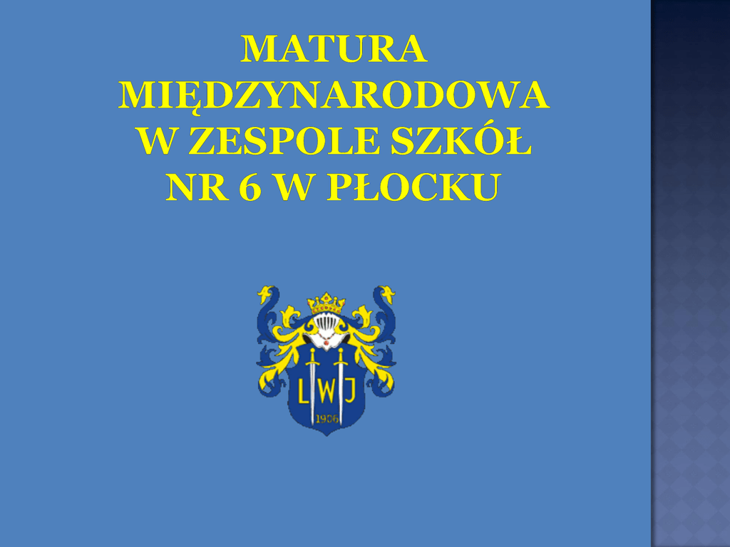 Zespół Szkół nr 6 w Płocku informuje, że od 01 września 2013 roku nasza szkoła posiada status kandydacki w programie Matury Międzynarodowej (Diploma Programme International Baccalaureate). Do Pana Dyrektora Mirosława Piątka wpłynęło pismo od Pana Adriana Kearney, Dyrektora International Baccalaureate Organization w regionie Afryki, Europy i Środkowego Wschodu, w którym czytamy: Zespół Szkół Nr 6 / Liceum Ogólnokształcące im. Władysława Jagiełły w Płocku jest szkołą kandydacką w programie Diploma Programme Matury Międzynarodowej. Szkoła prowadzi działania zmierzające do autoryzacji jako IB World School (szkoła z uprawnieniami do nauczania w ramach programu Międzynarodowej Matury). Są to szkoły, które łączy wspólna filozofia – zapewnienie międzynarodowego wykształcenia w szkole o wysokiej jakości nauczania, w której nauka jest prawdziwym wyzwaniem dla ucznia. Zespół Szkół Nr 6 / Liceum Ogólnokształcące im. Władysława Jagiełły w Płocku podziela przekonanie o istotnej roli takiego wykształcenia. INFORMACJE WSTĘPNE International Baccalaureate Organization – organizacja Matury Międzynarodowej została utworzona w Genewie w 1968 roku. Obecnie prowadzi program Międzynarodowej Matury w ponad 2100 szkołach w ponad 130 krajach na całym świecie. W Polsce szkoły IB działają od 1993 roku. Zespół Szkół nr 6 – Liceum Ogólnokształcące im. Władysława Jagiełły w Płocku jest pierwszą szkołą publiczną w województwie mazowieckim (poza szkołami warszawskimi), która podjęła starania zmierzające do otwarcia klasy z programem International Baccalaureate. Przewidywana data uruchomienia oddziału IB w naszej szkole to 1 września 2015 roku. MISJA SZKÓŁ IB U podstaw działania szkół z programem Międzynarodowej Matury leży misja szkół International Baccalaureate: Celem Organizacji Matury Międzynarodowej (IBO) jest rozwój człowieka dociekliwego, wykształconego i sumiennego, który wspiera tworzenie lepszego i spokojniejszego świata poprzez zrozumienie innych kultur i szacunek wobec nich. Organizacja współpracuje ze szkołami, rządami i organizacjami, rozwijając wymagający międzynarodowy program edukacyjny z rygorystycznymi zasadami oceniania. Program ten zachęca młodych ludzi na całym świecie, by stawać się uczniami aktywnymi, empatycznymi, posiadającymi świadomość konieczności uczenia się przez całe życie i wykazującymi się zrozumieniem, że inny człowiek też może mieć rację. ODBIORCY PROGRAMU Program DP Międzynarodowej Matury jest skierowany do uczniów klas II i III szkoły ponadgimnazjalnej. Uczniowie wybierają trzy przedmioty na poziomie podstawowym (Standard Level) oraz trzy przedmioty na poziomie rozszerzonym (Higher Level) spośród oferowanych sześciu grup tematycznych. OFERTA PRZEDMIOTOWA Grupa 1 – język ojczysty (język A) – język polski – SL lub HL, Grupa 2 – język obcy (język B) – język angielski – obowiązkowy HL, - język francuski, niemiecki lub włoski (od podstaw) Grupa 3 – człowiek i społeczeństwo – historia - SL lub HL, - geografia - SL lub HL, Grupa 4 – nauki eksperymentalne – biologia - SL lub HL, - chemia - SL lub HL, - fizyka - SL lub HL, Grupa 5 – nauki matematyczne – matematyka - SL lub HL, Grupa 6 – jeden przedmiot dodatkowy z grup 3-5 lub dodatkowy język obcy. OFERTA PRZEDMIOTOWA Wybór przedmiotu i jego poziomu zależy od zainteresowań i uzdolnień kandydatów oraz ich dalszych planów edukacyjnych. Przed wyborem wskazana jest również konsultacja z nauczycielami przedmiotów oraz szkolnym doradcą zawodowym / psychologiem. Język angielski jako język wykładowy oferowany jest jedynie na poziomie rozszerzonym. Przedmioty na poziomie podstawowym nauczane są w wymiarze 4 godzin na tydzień, zaś na poziomie rozszerzonym – 6 godzin. WYMAGANIA DODATKOWE (CORE) Dodatkowo uczniowie zobowiązani są do: •zaliczenia przedmiotu Theory of Knowledge (Teoria wiedzy), •udziału w programie CAS (Creativity, Action, Service), •napisania pracy dyplomowej (Extended Essay) THEORY OF KNOWLEDGE – TEORIA WIEDZY Theory of Knowledge – to przedmiot, którego celem jest wykształcenie poszukującego, intelektualnie aktywnego człowieka i przygotowanie do dalszych studiów uniwersyteckich. Uczestnik kursu TOK uczy się, jak zdobywać i weryfikować wiedzę, jak docierać do wiarygodnych informacji i jak skutecznie budować trwałe zaplecze edukacyjne dla własnego wykształcenia i lepszej przyszłości. Lekcje odbywają się w wymiarze 2 godzin w tygodniu. Uczeń zobowiązany jest do przedstawienia prezentacji na wybrany temat oraz napisania pracy zaliczeniowej na ok. 1600 słow. CREATIVITY, ACTION, SERVICE – KREATYWNOŚĆ, DZIAŁANIE, SŁUŻBA CAS to przedmiot, który kształtuje osobowość, rozwój i wrażliwość ucznia poprzez udział w różnych formach aktywności społecznej, kulturalnej, fizycznej w szkole i poza szkołą i pozwala uczniowi odnaleźć równowagę między nauką w szkole a życiem pozaszkolnym. KREATYWNOŚĆ – wszelkie pozalekcyjne działania twórcze podejmowane w szkole i poza szkołą, np. nauka gry na instrumencie lub zajęcia plastyczne. DZIAŁANIE – np. zajęcia sportowe lub nauka udzielania pierwszej pomocy. SŁUŻBA – działania na rzecz społeczności lokalnej, środowiska, wolontariat, pomoc potrzebującym. EXTENDED ESSAY – PRACA DYPLOMOWA Jednym z wymogów programu Międzynarodowej Matury jest napisanie pracy dyplomowej (Extended Essay) na około 4000 słów na samodzielnie sformułowany temat z wybranego przedmiotu pod opieką merytoryczną nauczyciela-mentora OCENIANIE Ocenianie dzieli się na wewnętrzne (za które odpowiedzialny jest nauczyciel w szkole) i zewnętrzne (za które odpowiedzialni są egzaminatorzy IB na całym świecie). Ocenianie wewnętrzne obejmuje: •egzamin ustny z języka obcego, •projekty, •portfolio przedmiotowe, •prezentacje, •zajęcia laboratoryj