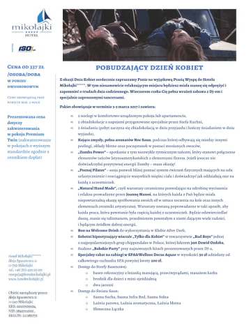 partner: pobudzający dzień kobiet Cena od 337 zł /osoba/doba w pokoju dwuosobowym Z okazji Dnia Kobiet serdecznie zapraszamy Panie na wyjątkową Ptasią Wyspę do Hotelu Mikołajki*****. W tym niesamowicie relaksującym miejscu będziesz miała szansę się odprężyć i zapomnieć o trudach dnia codziennego. Wieczorem czeka Cię pełna wrażeń zabawa z Dj-em i Ceny obowiązują przy pobycie min. 2 noce specjalnie zaproszonymi tancerzami. Pakiet obowiązuje w terminie 3-5 marca 2017 i zawiera: Prezentowana cena dotyczy zakwaterowania w pokoju Premium Twin (zakwaterowanie w pokojach o wyższym standardzie zgodnie z cennikiem dopłat) • 2 noclegi w komfortowo urządzonym pokoju lub apartamencie, • 2 obiadokolacje z napojami przygotowane specjalnie przez Szefa Kuchni, • 2 śniadania (pobyt zaczyna się obiadokolacją w dniu przyjazdu i kończy śniadaniem w dniu wyjazdu), • Kojąca zmysły, pełna aromatów Noc Saun, podczas której odbywają się miedzy innymi peelingi, okłady błotne oraz poczęstunek w postaci mrożonych owoców, • „Zumba Power” – spotkanie z tym niezwykle rytmicznym tańcem, który stanowi połączenie elementów tańców latynoamerykańskich z elementami fitness. Jeżeli jeszcze nie doświadczyłaś pozytywnej energii Zumby – masz okazję! • „Poznaj Pilates” – sesja pozwoli bliżej poznać system ćwiczeń fizycznych mających na celu uelastycznienie i rozciągnięcie wszystkich mięśni ciała i doświadczyć jak oddziałują one na każdą z uczestniczek. • „Natural Hand Made”, czyli warsztaty ceramiczne pozwalające na odrobinę wyciszenia i relaksu prowadzone przez Joannę Manoś, na których każda z Pań będzie miała niepowtarzalną okazję spróbowania swoich sił w sztuce toczenia na kole oraz innych elementach ceramiki artystycznej. Warsztaty zostaną poprowadzone w taki sposób, aby każda praca, która powstanie była częścią każdej z uczestniczek. Będzie odzwierciedlać duszę, stanie się talizmanem, przedmiotem powstałym z ziemi dającym wiele radości, i będącym źródłem dobrej energii, • Bon na Welcome Drink do wykorzystania w Klubie After Dark, • Sobotni hipnotyzujący wieczór „Tylko dla Kobiet” w towarzystwie „Bad Boys” jednej z najpopularniejszych grup chippendales w Polsce, której liderem jest Dawid Ozdoba, • Szalone „Babskie Party” przy najnowszych hitach prezentowanych przez DJ-a, • Specjalny rabat na zabiegi w SPA&Wellnes Decus Aquae w wysokości 50 zł udzielany od całkowitego rachunku SPA powyżej kwoty 200 zł, • • Dostęp do Strefy Basenowej: o basen rekreacyjny z leżanką masującą, przeciwprądami, masażem karku o brodzik dla dzieci z mini-zjeżdżalnią o dwa jacuzzi Dostęp do Świata Saun: o Sauna Sucha, Sauna Infra Red, Sauna Solna o Łaźnia parowa, Łaźnia aromatyczna, Łaźnia błotna o Słoneczna Łączka partner: • o Jacuzzi, Prysznice Wrażeń o Misy do moczenia stóp, Podgrzewane ławy Parking Do ceny pobytu należy doliczyć koszt opłaty miejscowej, pobieranej zgodnie z uchwałą Rady Miejskiej w Mikołajkach. Niniejszy dokument nie stanowi oferty w rozumieniu art. 66 i następnych Kodeksu Cywilnego.