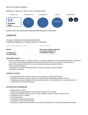 Izba Celna w Białej Podlaskiej Ogłoszenie o naborze nr 5497 z dnia 17 listopada 2016 r. OFERTY DO WYMIAR ETATU STANOWISKA 1 1 22 listopada 2016 STATUS DODATKOWE archiwalny Dyrektor Izby Celnej poszukuje kandydatów\kandydatek na stanowisko: referent do spraw: obsługi kancelaryjno-sekretarskiej w Referacie Ogólnym w Urzędzie Celnym w Zamościu MIEJSCE WYKONYWANIA PRACY: ADRES URZĘDU: Zamość Izba Celna w Białej Podlaskiej ul. Celników Polskich 21 21-500 Biała Podlaska ul. Strefowa 5, 22-400 Zamość WARUNKI PRACY -praca w siedzibie urzędu na I piętrze budynku, w systemie codziennym od poniedziałku do piątku w godzinach 7.30-15.30, z możliwością wystąpienia sporadycznej konieczności pracy w godzinach nadliczbowych, -praca administracyjno-biurowa, praca przy komputerze powyżej 4 godzin dziennie, -praca w pozycji siedzącej, - udogodnienia dla osób niepełnosprawnych: miejsce parkingowe, podjazd, toaleta; - brak windy w budynku. ZAKRES ZADAŃ Prowadzenie kancelari urzędu celnego w celu zapewnienia obiegu dokumentów. Obsługa sekretariatu urzędu celnego w celu zapewnienia prawidłowego obiegu informacji. Przygotowywanie pod względem organizacyjnym spotkań i narad służbowych w celu zapewnienia ich sprawnego i terminowego przebiegu. WYMAGANIA NIEZBĘDNE Wykształcenie: średnie Znajomość obsługi programów komputerowych (Word, Excel, Outlook) Znajomość przepisów Kodeksu pracy, ustawy o Służbie Cywilnej i ustawy o Służbie Celnej Umiejętność pracy w zespole Komunikatywność Posiadanie obywatelstwa polskiego Korzystanie z pełni praw publicznych Nieskazanie prawomocnym wyrokiem za umyślne przestępstwo lub umyślne przestępstwo skarbowe DOKUMENTY I OŚWIADCZENIA NIEZBĘDNE Życiorys/CV i list motywacyjny Kopie dokumentów potwierdzających spełnienie wymagania niezbędnego w zakresie wykształcenia Oświadczenie o posiadanych umiejętnościach w zakresie obsługi komputera Oświadczenie o posiadaniu obywatelstwa polskiego albo kopia dokumentu potwierdzającego posiadanie polskiego obywatelstwa Oświadczenie o wyrażeniu zgody na przetwarzanie danych osobowych do celów naboru Oświadczenie o korzystaniu z pełni praw publicznych Oświadczenie o nieskazaniu prawomocnym wyrokiem za umyślne przestępstwo lub umyślne przestępstwo skarbowe DOKUMENTY I OŚWIADCZENIA DODATKOWE kopia dokumentu potwierdzającego niepełnosprawność - w przypadku kandydatek/kandydatów, zamierzających skorzystać z pierwszeństwa w zatrudnieniu w przypadku, gdy znajdą się w gronie najlepszych kandydatek/kandydatów TERMINY I MIEJSCE SKŁADANIA DOKUMENTÓW Dokumenty należy złożyć do: 22 listopada 2016 r. Decyduje data: stempla pocztowego / osobistego dostarczenia oferty do urzędu Miejsce składania dokumentów: Izba Celna w Białej Podlaskiej ul. Celników Polskich 21 21-500 Biała Podlaska INNE INFORMACJE: W miesiącu poprzedzającym datę upublicznienia ogłoszenia wskaźnik zatrudnienia osób niepełnosprawnych w urzędzie, w rozumieniu przepisów o rehabilitacji zawodowej i społecznej oraz zatrudnianiu osób niepełnosprawnych, nie wynosi co najmniej 6%. 1. Do składania aplikacji zachęcamy osoby niepełnosprawne. 2. Wzór oświadczenia dostępny jest na stronie internetowej www.bialapodlaska.scelna.gov.pl w zakładce ogłoszenia/praca 3. Informacje dotyczące metod i technik naboru umieszczone są na stronie internetowej www.bialapodlaska.scelna.gov.pl w zakładce Ogłoszenia/Praca 4. Kandydaci informowani będą o terminach każdego etapu naboru, a także o wynikach naboru poprzez stronę internetową oraz poprzez umieszczenie informacji na tablicy ogłoszeń w siedzibie Izby Celnej w Białej Podlaskiej. 5. Nie będą rozpatrywane oferty, które: - wpłynęły po terminie (decyduje daty stempla pocztowego); - list motywacyjny nie będzie zawierał numeru ogłoszenia (brak możliwości przypisania oferty do ogłoszenia); - nie będą zawierały własnoręcznie podpisanego oświadczenia, życiorysu (CV), listu motywacyjnego; - wskazują, że kandydat nie spełnia wymagań niezbędnych określonych w ogłoszeniu. 6. Oferty należy składać osobiście w siedzibie Izby Celnej (ul. Celników Polskich 21, 21-500 Biała Podlaska) lub przesłać drogą pocztową (decyduje data stempla nadania). 7. Oferty, które nie spełniają wymogów formalnych zostaną komisyjnie zniszczone. 8. Oferty osób niezatrudnionych zostaną zniszczone po upływie 3 miesięcy od zakończenia naboru. 9. Nadesłanych dokumentów nie odsyłamy. 10. Proponowane wynagrodzenie zasadnicze wg mnożnika kwoty bazowej w wysokości 1,441. 11. Nasz urząd jest pracodawcą równych szans i wszystkie aplikacje są rozważane z równą uwagą bez względu na płeć, wiek, niepełnosprawność, rasę, narodowość, przekonania polityczne, przynależność związkową, pochodzenie etniczne, wyznanie, orientacje seksualną czy też jakąkolwiek inną cechę prawnie chronioną. Legenda Pierwszeństwo dla osób z niepełnosprawnościami Ogłoszenie z tym symbolem oznacza, że pierwszeństwo w zatrudnieniu mają osoby z niepełnosprawnościami, które spełniają wszystkie następujące warunki: • złożyły w terminie ofertę wraz z dokumentem potwierdzającym niepełnosprawność, • spełniają warunki wymienione w ogłoszeniu, • po rekrutacji znalazły się w gronie najlepszych kandydatów. Zastępstwo Ogłoszenie z tym symbolem oznacza, że urząd poszukuje kandydatów do pracy na czas przewidywanej nieobecności swojego pracownika. Jeśli w ogłoszeniu nie wskazano okresu zastępstwa, możesz o to spytać w urzędzie. Osoba zatrudniona na zastępstwo jest członkiem korpusu służby cywilnej. Nabór otwarty dla cudzoziemców Ogłoszenie z tym symbolem oznacza, że o stanowisko mogą starać się, poza polskimi obywatelami, również cudzoziemcy. Kandydaci muszą spełniać następujące warunki: • są obywatelami państwa Unii Europejskiej lub innego państwa, którego obywatelom na podstawie umów