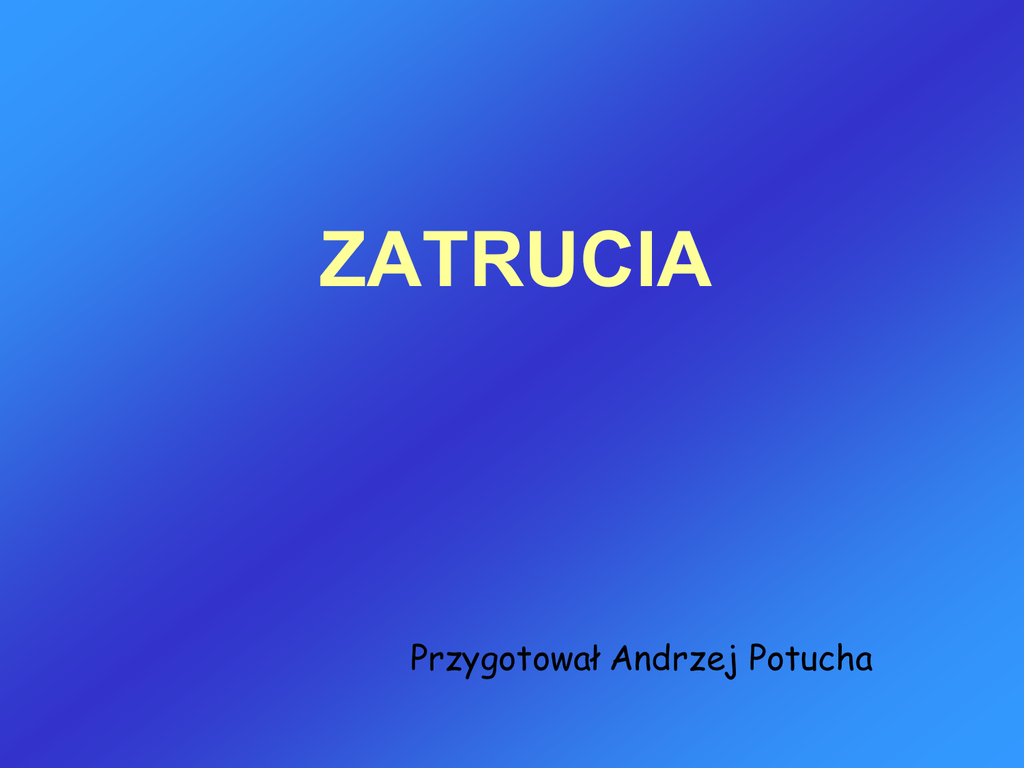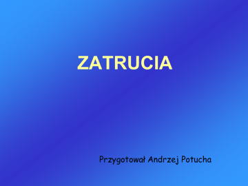 ZATRUCIA Przygotował Andrzej Potucha Trucizna to każda substancja stała, płynna lub gazowa, która po wprowadzeniu do organizmu zakłóca jego funkcje życiowe. Przyczyny zatruć: • 10 –15 % przypadków jest to zdarzenie przypadkowe • 80 – 90 % u dorosłych to zatrucia celowe po zażyciu trucizny w celach samobójczych • około 5 % zatruć związanych jest z wykonywaniem zawodu DROGI SKAŻENIA 1. Spożycie (połknięcie) Najczęstszą drogą, którą substancje trujące, stałe i płynne dostają się do organizmu, jest przewód pokarmowy. Spożycie trucizny to droga skażenia obserwowana głównie u ofiar prób samobójczych (leki), u alkoholików (metanol, alkohole przemysłowe) i u małych dzieci (chemia gospodarcza). 2. Wstrzyknięcie Trucizny wstrzyknięte to najczęściej narkotyki przyjmowane dożylnie przez osoby uzależnione. U osób chorujących na cukrzycę, samodzielnie pobierających insulinę objawy toksyczne mogą wywołać jej nieodpowiednie dawkowanie. Innym typem wstrzyknięć wywołujących objawy zatrucia są użądlenia przez owady lub ukąszenia przez jadowite węże. 3. Inhalacja (wdychanie) Wdychane mogą być gazy, pary lub aerozole. Najczęściej wdychaną trucizną jest tlenek węgla. W wyniku wypadków przemysłowych i rolniczych oraz pożarów może dojść do zatruć w wyniku wdychania takich gazów jak tlenki azotu, fosgen, cyjanki i inne. Podczas ratowania ofiar zatruć gazami ratownicy powinni pamiętać o szczególnych środkach bezpieczeństwa, które należy stosować w celu uniknięcia ekspozycji na związki toksyczne. Odrębną kategorię trujących inhalacji stanowi wąchanie kleju lub rozpuszczalników organicznych w celu wywołania odurzenia (!) 4. Absorpcja (wchłanianie) Trucizny mogą być także wchłaniane przez skórę. Przykładem są zatrucia przez środki owadobójcze. Częste objawy zatrucia: 1. Zaburzenia ośrodkowego i obwodowego układu nerwowego wywołane zatruciem mogą występować jako: • depresja OUN: zaburzenia świadomości, senność, sopor (sen głęboki), śpiączka. • pobudzenie: niepokój, splątanie, oszołomienie, stany rozdrażnienia, drżenia oraz uogólnione napady drgawek. 2. Ostre zaburzenia żołądkowo – jelitowe: • mdłości, • nudności, • wymioty i biegunka ( również krwawa ). 3. Szczególna woń z ust lub zapach wymiocin. 4. Uszkodzenia skóry (zmiany skórne): • rumień, pęcherzyki, miejscowa martwica , krwawe wybroczyny, • oparzenia chemiczne w wyniku zetknięcia z połkniętymi substancjami żrącymi, • zmiany o charakterze oparzeń wskutek kontaktu z rozpuszczalnikami i innymi substancjami chemicznymi (kwasy, ługi i środki utleniające), • ślady wkłucia igły – przy podejrzeniu zatrucia lekami – pomocne są w dalszej diagnostyce różnicowej. 5. Zaburzenia rytmu serca: • rzucają podejrzenie na zatrucie zwłaszcza wtedy, gdy występują nieoczekiwanie w aspekcie wieku i wcześniejszego wywiadu. 6. Zmiany temperatury: • mogą występować w formie zarówno hiper- jak i hipotermii. Toksydromy Toksydrom oznacza zespół objawów pojawiający się wskutek ekspozycji organizmu na określoną truciznę (dotyczą skóry, oczu, błon śluzowych, układu oddechowego, krążenia, przewodu pokarmowego, stanu neurologicznego). Określenie właściwego toksydromu pomaga postawić trafną diagnozę i wdrożyć prawidłowe leczenie w sytuacji gdy nie wie się, jaki czynnik szkodliwy wywołał zatrucie. Toksydrom to „odcisk palca” trucizny. Zasady postępowania ratunkowego w ostrych zatruciach 1. Rozpoznanie stanu pacjenta 2. Utrzymanie podstawowych funkcji życiowych 3. Identyfikacja trucizny 4. Leczenie przyczynowe: - dekontaminacja, - eliminacja trucizn, - odtrutki 5. Leczenie objawowe Ogólne zasady pierwszej pomocy w zatruciach: Pamiętaj o swoim bezpieczeństwie (gazy). Zwalczanie zaburzeń groźnych dla życia (resuscytacja w razie zaburzeń oddychania i braku oznak krążenia). Identyfikacja trucizny (opakowania, wywiad). Wezwanie pomocy (+ konsultacja z lekarzem przez telefon). Hamowanie wchłaniania trucizny (dekontaminacja): 1. 2. 3. 4. 5. – – – – – – spłukiwanie skóry wodą, prowokowanie wymiotów, podanie środka, który rozcieńczy truciznę, węgiel aktywowany, środki przeczyszczające, płukanie żołądka. 5. Gdy poszkodowany jest w nieprzytomny to: – – pozycja boczna bezpieczna, kontrola funkcji życiowych. Dekontaminacja (dezaktywacja, odkażanie ) - proces polegający na usunięciu lub/i zneutralizowaniu substancji toksycznej - polega na usuwaniu z powierzchni ciała ludzkiego błon śluzowych oczu, nosa i ust substancji promieniotwórczych, środków trujących i biologicznych. Dekontaminacja ma na celu przerwanie narażenia organizmu na czynnik szkodliwy, czyli dalszego wchłaniania trucizny. Dekontaminacja miejscowa (zewnętrzna) Dekontaminacja miejscowa polega na przepłukaniu skóry wodą. Można też zastosować każdy roztwór płynu obojętnego o objętości odpowiedniej dla rozmiaru obrażenia. Płukanie powinno trwać kilka minut. Nie wolno podejmować prób neutralizowania trucizny roztworami o przeciwnym pH, ponieważ zwiększa się wówczas zakres uszkodzenia tkanek w wyniku powstałej w miejscu skażenia reakcji egzotermicznej. Dekontaminacja żołądkowo-jelitowa (wewnętrzna) Dekontaminację żołądkowo-jelitową wykonuje się w celu zmniejszenia absorpcji trucizny w przewodzie pokarmowym. Jej klasyczne metody to: prowokowanie wymiotów, płukanie żołądka z podaniem aktywowanego węgla i płukanie jelit. W celu przyspieszenia pasażu treści jelitowej podaje się środki przeczyszczające. Nie prowokuj wymiotów ! - jeżeli nie wiesz co połknął pacjent, - jeżeli pacjent wymiotował samoistnie, - jeśli zamierzamy podać doustnie odtrutki, np. N-acetylocysteinę w zatruciu paracetamolem lub węgiel aktywowany absorbujący truciznę, - w zatruciach środkami żrącymi (ryzyko pęknięcia przełyku i zapalenia 