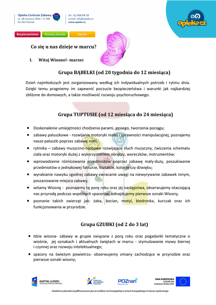 Opieka Centrum Zabawy tel.: 61 668 68 18 ul. 28 Czerwca 1956 r. nr 398 61-441 Poznań e-mail: [email protected] www.opieka.cz Co się u nas dzieje w marcu? I. Witaj Wiosno!- marzec Grupa BĄBELKI (od 20 tygodnia do 12 miesiąca) Dzień najmłodszych jest zorganizowany według ich indywidualnych potrzeb i rytmu dnia. Dzięki temu pragniemy im zapewnić poczucie bezpieczeństwa i warunki jak najbardziej zbliżone do domowych, a także możliwość rozwoju psychoruchowego. Grupa TUPTUSIE (od 12 miesiąca do 24 miesiąca)  Doskonalenie umiejętności chodzenia parami, gęsiego, tworzenia pociągu;  zabawy paluszkowe - rozwijanie motoryki małej i sprawności manipulacyjnej, poznajemy nasze paluszki poprzez zabawę nimi;  rytmika – zabawy muzyczno-ruchowe rozwijające słuch muzyczny, ćwiczenia schematu ciała oraz motoryki dużej z wykorzystaniem obręczy, woreczków, instrumentów;  wprowadzenie różnicowania przedmiotów poprzez zabawę mały-duży, poszukiwanie przedmiotów o jednakowej fakturze, kształcie, kolorze czy dźwięku;  wyrabianie nawyku zgodnej zabawy-zwracanie uwagi na niewyrywanie zabawek innym, poszanowanie miejsca zabawy;  witamy Wiosnę - poznajemy tę porę roku oraz jej następstwa, obserwujemy otaczającą nas przyrodę podczas wspólnych spacerów, odnajdujemy pierwsze oznaki Wiosny;  poznanie takich zwierząt jak: żaba, bocian, motyl, biedronka, kurczak oraz ich funkcjonowania w przyrodzie. Grupa GZUBKI (od 2 do 3 lat)  Idzie wiosna- zabawy w grupie związane z porą roku oraz pogadanki tematyczne o wiośnie, jej oznakach i aktualnych świętach w marcu - stymulowanie mowy biernej i czynnej oraz rozwoju intelektualnego;  spacery na świeżym powietrzu- obserwujemy zmiany zachodzące w przyrodzie oraz pierwsze oznaki wiosny; Opieka Centrum Zabawy tel.: 61 668 68 18 ul. 28 Czerwca 1956 r. nr 398 61-441 Poznań e-mail: [email protected] www.opieka.cz  nauka piosenki o Marcu - czarodzieju - doskonalimy przy tym pamięć językową oraz wymowę, kształtujemy wiedzę dotyczącą pór roku oraz rozwijamy poczucie rytmu;  poznanie różnych rodzajów kwiatów (żonkil, pierwiosnek, przebiśnieg, tulipan), związanych z nadchodzącą porą roku oraz ich kolorów – doskonalimy znajomość kolorów oraz umiejętność rozróżniania poszczególnych roślin;  nauka wiersza o Wiośnie - inscenizujemy go ruchem oraz rozwijamy przy tym narząd mowy;  tworzenie prac plastycznych przedstawiających „Panią Wiosnę” oraz wiosenną łąkę;  święta Wielkanocne – robimy ozdoby świąteczne (kolorowe jajka, zajączki oraz kurczaczki) przy wykorzystaniu różnorodnych materiałów;  doskonalenie umiejętności porządkowych - odkładanie zabawek na odpowiednie miejsce, sprzątanie zabawek przed posiłkami;  słuchanie bajek i muzyki relaksacyjnej w celu wyciszenia, uspokojenia grupy. II. Ruch to zdrowie:  Zabawy ruchowe w grupie z wykorzystaniem elementów wspólnej zabawy oraz doskonalące umiejętność nazywania poszczególnych części swojego ciała;  wspomaganie rozwoju ruchowego dziecka- organizowanie zajęć mających na celu pomoc w nabywaniu sprawności ruchowej, postawy ciała, równowagi, orientacji w schemacie własnego ciała;  zabawy orientacyjno –porządkowe. Ćwiczenia rozwojowe z elementami czworakowania, równowagi, skoczne, bieżne;  kształtowanie umiejętności utrzymywania równowagi - uczymy się chodzić na „mini szczudłach” oraz stać i skakać na jednej nodze. III. Czynności samoobsługowe:  Kształtowanie nawyku samodzielnego spożywania posiłków oraz prawidłowego trzymania i posługiwania się sztućcami;  wyrabianie nawyku używania form grzecznościowych (Dzień dobry, Do widzenia, Przepraszam, Proszę, Dziękuję);  wspieranie procesu kształtowania nawyków higienicznych i prozdrowotnych;  kształtowanie umiejętności samodzielnego ubierania i rozbierania się. Opieka Centrum Zabawy tel.: 61 668 68 18 ul. 28 Czerwca 1956 r. nr 398 61-441 Poznań e-mail: [email protected] www.opieka.cz IV. Marcowy kalendarz: 3 marca – Międzynarodowy Dzień Pisarzy, Światowy Dzień Dzikiej Przyrody 5 marca – Dzień Dentysty 6 marca- Europejski Dzień Logopedy 8 marca – Dzień Kobiet 12 marca – Dzień matematyki 14 marca – Dzień liczby Pi, Biały Dzień 15 marca – Międzynarodowy Dzień Inwalidów 17 marca – Światowy Dzień Morza, Dzień świętego Patryka 18 marca – Europejski Dzień Mózgu 19 marca- Dzień Wędkarza 20 marca – Międzynarodowy Dzień Astrologii 21 marca – Światowy Dzień Lasu 22 marca – Światowy Dzień Wody, 23 marca – Światowy Dzień Meteorologii 27 marca – Międzynarodowy Dzień Teatru Opieka Centrum Zabawy tel.: 61 668 68 18 ul. 28 Czerwca 1956 r. nr 398 61-441 Poznań e-mail: [email protected] www.opieka.cz PIOSENKI I WIERSZYKI, KTÓRYCH SIĘ UCZYMY piosenka wiosenna Zieleń pod, błękit nad, czerwony w środku kwiat. Żółte słońce w górze lśni, uśmiechnij się i ty! piosenka „Wiosna-radosna” Już na polu kłos dojrzewa, trawka rośnie, ptaszek śpiewa. Gdy wiosna radosna swój uśmiech roztoczy, to dzieciom wokoło wesoło jest! Konik polny stroi skrzypce, krakowiaczka w miejscu drepce. Gdy wiosna radosna swój uśmiech roztoczy, to dzieciom wokoło wesoło jest ! piosenka "Marzec czarodziej” Chodzi marzec - czarodziej, po chmurach i po lodzie. Aż tu nagle hokus - pokus: i już pączki na patyku i już trawka na śnieżniku. Och , ten marzec - czarodziej! Skacze marzec - czarodziej, Po chmurach i po lodzie. Aż tu nagle hokus - pokus: słońce rzuca swe błyskotki, że aż mruczą bazie -kotki Och, ten marzec -czarodziej! Biega marzec - czarodziej, po chmurach i po lodzie. Aż tu nagle hokus - pokus: przez kałuże skaczą kaczki, żółte kaczki - przedszkolaczki. Och, ten marzec - czarodziej! wiersz " Biegały ptaszki" Tam daleko gdzie wysoka sosna maszeruje drogą, mała wiosna. Ma spódniczkę mini, sznurowane butki i jeden warkoczyk krótki. Maszeruje wiosna a ptaki wokoł