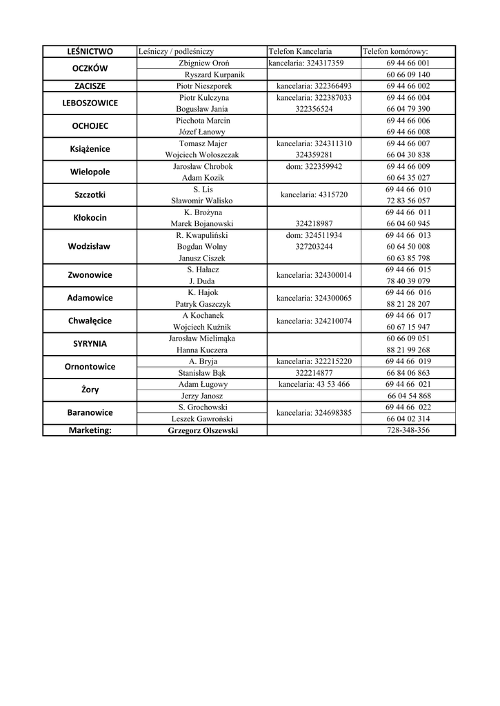 LEŚNICTWO OCZKÓW ZACISZE LEBOSZOWICE OCHOJEC Książenice Wielopole Szczotki Kłokocin Wodzisław Zwonowice Adamowice Chwałęcice SYRYNIA Ornontowice Żory Baranowice Marketing: Leśniczy / podleśniczy Zbigniew Oroń Ryszard Kurpanik Piotr Nieszporek Piotr Kulczyna Bogusław Jania Piechota Marcin Józef Łanowy Tomasz Majer Wojciech Wołoszczak Jarosław Chrobok Adam Kozik S. Lis Sławomir Walisko K. Brożyna Marek Bojanowski R. Kwapuliński Bogdan Wolny Janusz Ciszek S. Hałacz J. Duda K. Hajok Patryk Gaszczyk A Kochanek Wojciech Kuźnik Jarosław Mielimąka Hanna Kuczera A. Bryja Stanisław Bąk Adam Ługowy Jerzy Janosz S. Grochowski Leszek Gawroński Grzegorz Olszewski Telefon Kancelaria kancelaria: 324317359 kancelaria: 322366493 kancelaria: 322387033 322356524 kancelaria: 324311310 324359281 dom: 322359942 kancelaria: 4315720 324218987 dom: 324511934 327203244 kancelaria: 324300014 kancelaria: 324300065 kancelaria: 324210074 kancelaria: 322215220 322214877 kancelaria: 43 53 466 kancelaria: 324698385 Telefon komórowy: 69 44 66 001 60 66 09 140 69 44 66 002 69 44 66 004 66 04 79 390 69 44 66 006 69 44 66 008 69 44 66 007 66 04 30 838 69 44 66 009 60 64 35 027 69 44 66 010 72 83 56 057 69 44 66 011 66 04 60 945 69 44 66 013 60 64 50 008 60 63 85 798 69 44 66 015 78 40 39 079 69 44 66 016 88 21 28 207 69 44 66 017 60 67 15 947 60 66 09 051 88 21 99 268 69 44 66 019 66 84 06 863 69 44 66 021 66 04 54 868 69 44 66 022 66 04 02 314 728-348-356