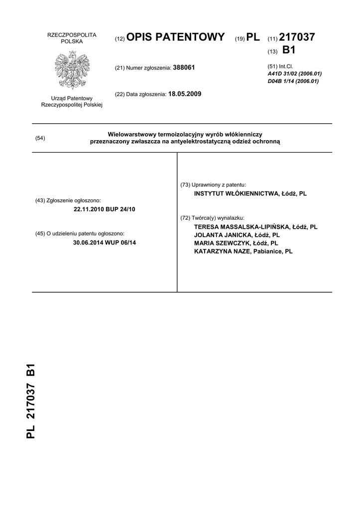 RZECZPOSPOLITA POLSKA (12) OPIS PATENTOWY (19) (21) Numer zgłoszenia: 388061 Urząd Patentowy Rzeczypospolitej Polskiej (54) PL 217037 (13) B1 (11) (51) Int.Cl. A41D 31/02 (2006.01) D04B 1/14 (2006.01) (22) Data zgłoszenia: 18.05.2009 Wielowarstwowy termoizolacyjny wyrób włókienniczy przeznaczony zwłaszcza na antyelektrostatyczną odzież ochronną (73) Uprawniony z patentu: INSTYTUT WŁÓKIENNICTWA, Łódź, PL (43) Zgłoszenie ogłoszono: 22.11.2010 BUP 24/10 (72) Twórca(y) wynalazku: (45) O udzieleniu patentu ogłoszono: PL 217037 B1 30.06.2014 WUP 06/14 TERESA MASSALSKA-LIPIŃSKA, Łódź, PL JOLANTA JANICKA, Łódź, PL MARIA SZEWCZYK, Łódź, PL KATARZYNA NAZE, Pabianice, PL 2 PL 217 037 B1 Opis wynalazku Przedmiotem wynalazku jest wielowarstwowy termoizolacyjny wyrób włókienniczy, przeznaczony zwłaszcza na odzież ochronną, ocieplającą o właściwościach antyelektrostatycznych, dla określonych stanowisk pracy w przemyśle chłodniczym, chemicznym, naftowym, takich jak na przykład dla pracowników stacji benzynowych. Znane są dziane materiały włókiennicze, w których strukturę wprowadzono różnego rodzaju przędze i materiały elektroprzewodzące, jednorodne i w połączeniu z innymi włóknami. Z opisu patentowego PL 76919 znany jest sposób wytwarzania dzianiny zbrojonej łańcuszkiem ze stali lub metali kolorowych oraz tworzyw sztucznych. Elastyczna zbrojona dzianina wytwarzana jest w splocie dziewiarskim, z przędzy z włókien naturalnych lub syntetycznych, przez nakładanie na igły maszyny, ze znajdującymi się na nich oczkami zawieszonej dzianiny, oczek zbrojącego łańcuszka. Natomiast z opisu polskiego zgłoszenia patentowego P-371859 znany jest materiał antyelektrostatyczny przeznaczony zwłaszcza na odzież ochronną, stanowiący dzianinę w o splocie kolumienkowym złożonym, wykonanym z co najmniej jednego układu przędzy nie przewodzącej elektrycznie, stanowiącej tło dzianiny, w strukturę której wprowadzona jest poprzez rządki oczek, w ustalonych miejscach konduktywna przędza. Konduktywna przędza jest wprowadzona w strukturę tła dzianiny co najmniej jednym splotem składowym, w układzie pionowym wzdłuż kolumienek, bądź w układzie siatkowym, co najmniej dwoma splotami składowymi. Materiały te ze względu na swoją strukturę mogą być wykorzystane na odzież i rękawice ochronne, ekrany, pokrowce na siedziska, natomiast nie kwalifikują się na odzieżowe wyroby ochronne termoaktywne. Z opisu patentowego PL 125805 znana jest tkanina przewodząca prąd elektryczny, w której osnowę i wątek stanowi przędza metalizowana, uzyskana przez okręcanie włókien sztucznych, stanowiących rdzeń, nitkami miedzianymi. Z opisu patentowego PL 161577 znana jest tkanina na odzież ochronną, mająca w układzie osnowowym jedwab poliestrowy oraz jedwab poliamidowy srebrzony połączony z jedwabiem poliestrowym teksturowanym, a w układzie wątkowym gładki jedwab poliestrowy. Natomiast z opisu patentowego PL 178064 znany jest sposób nadawania właściwości antyelektrostatycznych wyrobom włókienniczym, polegający na drukowaniu ich pastą drukarską w postaci mieszaniny dodatku przewodzącego prąd elektryczny, środka wiążącego, zagęszczenia emulsyjnego lub syntetycznego oraz środka sieciującego, stosując nadruk o wzorze ciągłym, na przykład w postaci kratki, w której odległość między liniami kratkującymi jest nie większa niż 10 mm, zaś grubość tych linii nie mniejsza niż 0,5 mm. Znany z opisu polskiego zgłoszenia patentowego P-309719 wyrób tekstylny, stosowany do wytwarzania materiałów warstwowych, zawiera co najmniej dwie warstwy tekstylnego wzmocnienia, umieszczone po obu stronach warstwy środkowej, które to warstwy połączone są wzajemnie za pomocą szycia lub dziania. Kompozyt zawiera na przynajmniej jednej zewnętrznej powierzchni otoczkę z włókien syntetycznych, połączoną poprzez sklejanie albo zszycie łączące poszczególne warstwy kompozytu. Znany z opisu polskiego zgłoszenia patentowego P-331519 kompozytowy materiał odzieżowy zawiera odporny na wodę, przepuszczalny dla pary wodnej elastyczny substrat, który jest połączony z jednej strony z tkaniną, a z drugiej strony z odporną na ścieranie nieciągłą warstwą, w postaci licznych zgrubień. Znany z opisu polskiego zgłoszenia patentowego P- 354985 kompozyt włókninowy zawiera co najmniej jedną włókninę i połączony z nią termicznie materiał wzmacniający, w postaci folii z tworzywa termoplastycznego. Natomiast znany z opisu patentowego PL 196003 kompozyt zawiera polimer poliaminowy obłożony z obu stron materiałem podłożowym z porami, poprzez laminowanie nieciągłym spoiwem, korzystnie poliuretanem utwardzanym na mokro, nałożonym odpowiednio na tekstylne materiały czołowe, korzystnie na tkaninę wykonaną z poliamidu, poliestru, aramidu, akrylu, bawełny albo wełny. Materiał czołowy może być poddany wykończeniu hydrofobowemu i/lub oleofobowemu, a materiał podłożowy stanowiący warstwę wewnętrzną może być dziany, tkany albo nietkany. Celem wynalazku było uzyskanie wielowarstwowego „oddychającego” materiału włókienniczego o właściwościach antyelektrostatycznych i termoaktywnych, pozwalającego na osiągnięcie wysokiego komfortu użytkowego, zwłaszcza cieplnego, a zadaniem technologicznym postawionym do realizacji było wytypowanie właściwych surowców włókienniczych, zapewniających uzyskanie pożądanych właściwości wyrobu, oraz konstrukcja poszczególnych jego składników, gwarantująca swobodną wymianę wilgoci z jednoczesnym zatrzymaniem ciepła przy warstwie wewnętrznej. PL 217 037 B1 3 Wielowarstwowy termoizolacyjny wyrób włókienniczy, przeznaczony na odzież ochronną, o właściwościach antyelektrostatycznych i termoaktywnych, zawierający membranę, oddzielającą zewnętrzną warstwę od wewnętrznej warstwy, laminowany korzystnie metodą hot melt, według 