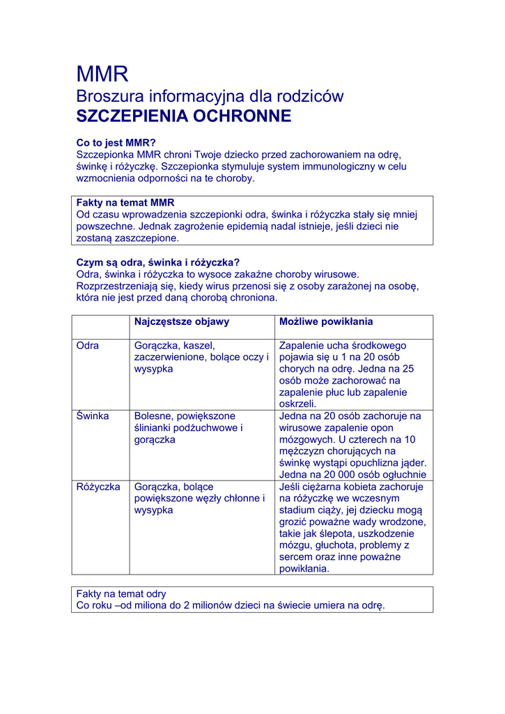 MMR Broszura informacyjna dla rodziców SZCZEPIENIA OCHRONNE Co to jest MMR? Szczepionka MMR chroni Twoje dziecko przed zachorowaniem na odrę, świnkę i różyczkę. Szczepionka stymuluje system immunologiczny w celu wzmocnienia odporności na te choroby. Fakty na temat MMR Od czasu wprowadzenia szczepionki odra, świnka i różyczka stały się mniej powszechne. Jednak zagrożenie epidemią nadal istnieje, jeśli dzieci nie zostaną zaszczepione. Czym są odra, świnka i różyczka? Odra, świnka i różyczka to wysoce zakaźne choroby wirusowe. Rozprzestrzeniają się, kiedy wirus przenosi się z osoby zarażonej na osobę, która nie jest przed daną chorobą chroniona. Najczęstsze objawy Możliwe powikłania Odra Gorączka, kaszel, zaczerwienione, bolące oczy i wysypka Świnka Bolesne, powiększone ślinianki podżuchwowe i gorączka Różyczka Gorączka, bolące powiększone węzły chłonne i wysypka Zapalenie ucha środkowego pojawia się u 1 na 20 osób chorych na odrę. Jedna na 25 osób może zachorować na zapalenie płuc lub zapalenie oskrzeli. Jedna na 20 osób zachoruje na wirusowe zapalenie opon mózgowych. U czterech na 10 mężczyzn chorujących na świnkę wystąpi opuchlizna jąder. Jedna na 20 000 osób ogłuchnie Jeśli ciężarna kobieta zachoruje na różyczkę we wczesnym stadium ciąży, jej dziecku mogą grozić poważne wady wrodzone, takie jak ślepota, uszkodzenie mózgu, głuchota, problemy z sercem oraz inne poważne powikłania. Fakty na temat odry Co roku –od miliona do 2 milionów dzieci na świecie umiera na odrę. Kto powinien otrzymać szczepionkę MMR? Szczepionka MMR jest podawana dzieciom w 12. miesiącu życia. Dzieci powinny otrzymać drugą dawkę w wieku 4-5 lat. Druga dawka jest zazwyczaj podawana w szkole podczas szczepień organizowanych przez HSE, jednak na niektórych obszarach jest podawana przez lekarza rodzinnego. Dla pełnej ochrony są potrzebne dwie dawki szczepionki MMR. Czego mogę spodziewać się po szczepieniu? Po szczepieniu niektóre dzieci mogą odczuwać dyskomfort, swędzenie lub może pojawić się zaczerwienienie w miejscu wykonania zastrzyku. Dziecko może być rozdrażnione lub gorączkować. W takim przypadku należy podać dziecku paracetamol lub ibuprofen. Powinno ono również dużo pić. Należy zapewnić, aby dziecku nie było zbyt gorąco oraz żeby ubrania nie ocierały miejsca podania szczepionki. U 1 na 20 dzieci może wystąpić „łagodna odmiana odry” objawiająca się wysypką i gorączką w okresie od 6 do 10 dni po podaniu szczepionki. W 1 na 100 przypadków może wystąpić „łagodna odmiana świnki” objawiająca się opuchlizną w okolicy szczęki w trzecim tygodniu po podaniu szczepionki. Ta odmiana nie jest zakaźna. Objawy zazwyczaj mijają po 1-2 dniach. Czy niektórym osobom nie należy podawać szczepionki MMR? Jest mało osób, którym nie należy podawać szczepionki MMR. Szczepionki nie należy podawać dzieciom, które wykazały reakcje alergiczne (anafilaksja) na wcześniejsze szczepionki MMR lub któryś ze składników szczepionki. Należy opóźnić podanie szczepionki, jeśli dziecko: ma gorączkę, przyjęło inną szczepionkę, np. BCG, w okresie ostatnich czterech tygodni, przyjmuje wysoką dawkę sterydów, jest poddawane kuracji, takiej jak chemioterapia czy radioterapia, jest leczone maścią Protopic w przypadku wystąpienia przewlekłego wyprysku choruje na jakąkolwiek chorobę mającą wpływ na jego system immunologiczny. Z wszelkimi pytaniami należy zgłaszać się do lekarza rodzinnego lub pielęgniarki środowiskowej. Czy mojemu dziecku można podać szczepionkę, jeśli cierpi na alergię na jajka? Tak. Dzieci uczulone na jajka mogą otrzymać szczepionkę MMR. Wszelkie pytania dotyczące poważnej alergii na jajka należy zgłaszać lekarzowi rodzinnemu. Czy istnieje związek pomiędzy szczepionką MMR a autyzmem lub zapaleniem jelit? Nie. Wykonano wiele badań, które wykazały, że nie istnieje powiązanie pomiędzy szczepionką MMR a autyzmem, zapaleniem jelit czy nadaktywnością. Więcej informacji • można uzyskać od lekarza rodzinnego lub pielęgniarki środowiskowej • kopię broszury My Child's Immunisations (Odporność mojego dziecka — przewodnik dla rodziców) można uzyskać od pielęgniarki środowiskowej • odwiedź stronę www.immunisation.ie lub www.hspc.ie.