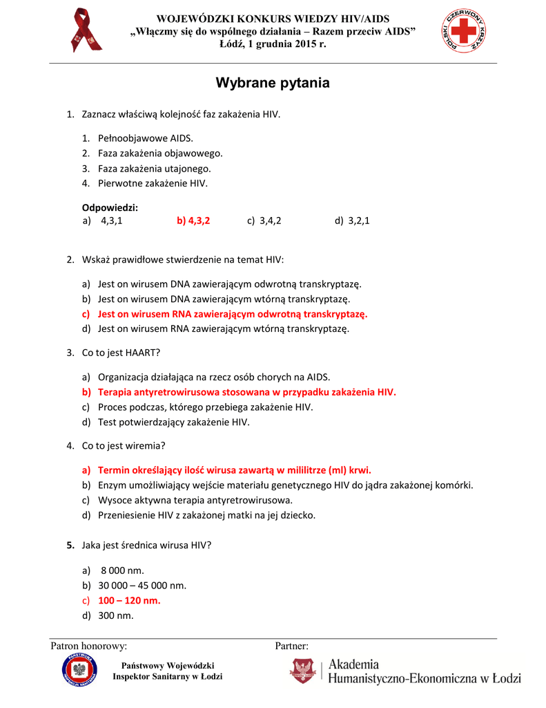 WOJEWÓDZKI KONKURS WIEDZY HIV/AIDS „Włączmy się do wspólnego działania – Razem przeciw AIDS” Łódź, 1 grudnia 2015 r. Wybrane pytania 1. Zaznacz właściwą kolejnośd faz zakażenia HIV. 1. 2. 3. 4. Pełnoobjawowe AIDS. Faza zakażenia objawowego. Faza zakażenia utajonego. Pierwotne zakażenie HIV. Odpowiedzi: a) 4,3,1 b) 4,3,2 c) 3,4,2 d) 3,2,1 2. Wskaż prawidłowe stwierdzenie na temat HIV: a) b) c) d) Jest on wirusem DNA zawierającym odwrotną transkryptazę. Jest on wirusem DNA zawierającym wtórną transkryptazę. Jest on wirusem RNA zawierającym odwrotną transkryptazę. Jest on wirusem RNA zawierającym wtórną transkryptazę. 3. Co to jest HAART? a) b) c) d) Organizacja działająca na rzecz osób chorych na AIDS. Terapia antyretrowirusowa stosowana w przypadku zakażenia HIV. Proces podczas, którego przebiega zakażenie HIV. Test potwierdzający zakażenie HIV. 4. Co to jest wiremia? a) b) c) d) Termin określający ilośd wirusa zawartą w mililitrze (ml) krwi. Enzym umożliwiający wejście materiału genetycznego HIV do jądra zakażonej komórki. Wysoce aktywna terapia antyretrowirusowa. Przeniesienie HIV z zakażonej matki na jej dziecko. 5. Jaka jest średnica wirusa HIV? a) b) c) d) 8 000 nm. 30 000 – 45 000 nm. 100 – 120 nm. 300 nm. Patron honorowy: Państwowy Wojewódzki Inspektor Sanitarny w Łodzi Partner: WOJEWÓDZKI KONKURS WIEDZY HIV/AIDS „Włączmy się do wspólnego działania – Razem przeciw AIDS” Łódź, 1 grudnia 2015 r. 6. Które z poniższych twierdzeo są prawdziwe? 1. 2. 3. 4. 5. 6. Matka może zakazid swoje dziecko wirusem HIV podczas porodu. Matka nie może zakazid dziecka wirusem HIV w trakcie porodu. Podczas karmienia piersią może dojśd do zakażenia dziecka przez matkę. Podczas karmienia piersią nie może dojśd do zakażenia dziecka przez matkę. W trakcie trwania ciąży matka nie może zakazid dziecka wirusem HIV. W trakcie trwania ciąży matka może zakazid dziecko wirusem HIV. Odpowiedzi: a) 1,2,6 b) 1,3,6 c) 2,3,6 d) 2,4,5 7. Informacja o zakażeniu HIV: a) b) c) d) Może zostad przekazana przez lekarza partnerowi seksualnemu osoby zakażonej HIV. Jest tajemnicą lekarską. Może zostad przekazana przez lekarza rodzinie osoby zakażonej HIV. Nie jest tajemnicą lekarską. 8. UNAIDS to skrót: a) b) c) d) Nowej odmiany AIDS Najnowszej szczepionki przeciw AIDS. Organizacji badającej przyczyny AIDS. ONZ- owskiej agencji do spraw AIDS. 9. Od początku epidemii do kooca 2014 roku w Polsce zarejestrowano: a) b) c) d) 18 646 osób zakażonych HIV. 2 500 osób zakażonych HIV. 1 000 osób zakażonych HIV. 23 342 osób zakażonych HIV. 10. Jak nazywała się kampania Polskiego Czerwonego Krzyża, która została wybrana Kampanią Społeczną Roku 2011? a) b) c) d) Życie to nie facebook. Jeden test dwa życia. W życiu jak w taocu, każdy krok ma znaczenie. HIV nie wybiera. Ty możesz. Patron honorowy: Państwowy Wojewódzki Inspektor Sanitarny w Łodzi Partner: