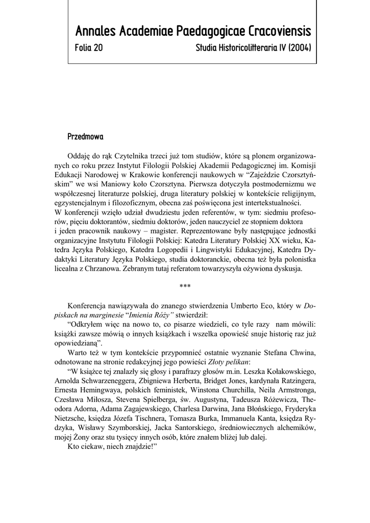 Annales Academiae Paedagogicae Cracoviensis Folia 20 Studia Historicolitteraria IV (2004) Przedmowa Oddaję do rąk Czytelnika trzeci już tom studiów, które są plonem organizowanych co roku przez Instytut Filologii Polskiej Akademii Pedagogicznej im. Komisji Edukacji Narodowej w Krakowie konferencji naukowych w “Zajeździe Czorsztyńskim” we wsi Maniowy koło Czorsztyna. Pierwsza dotyczyła postmodernizmu we współczesnej literaturze polskiej, druga literatury polskiej w kontekście religijnym, egzystencjalnym i filozoficznym, obecna zaś poświęcona jest intertekstualności. W konferencji wzięło udział dwudziestu jeden referentów, w tym: siedmiu profesorów, pięciu doktorantów, siedmiu doktorów, jeden nauczyciel ze stopniem doktora i jeden pracownik naukowy – magister. Reprezentowane były następujące jednostki organizacyjne Instytutu Filologii Polskiej: Katedra Literatury Polskiej XX wieku, Katedra Języka Polskiego, Katedra Logopedii i Lingwistyki Edukacyjnej, Katedra Dydaktyki Literatury Języka Polskiego, studia doktoranckie, obecna też była polonistka licealna z Chrzanowa. Zebranym tutaj referatom towarzyszyła ożywiona dyskusja. *** Konferencja nawiązywała do znanego stwierdzenia Umberto Eco, który w Dopiskach na marginesie “Imienia Róży” stwierdził: “Odkryłem więc na nowo to, co pisarze wiedzieli, co tyle razy nam mówili: książki zawsze mówią o innych książkach i wszelka opowieść snuje historię raz już opowiedzianą”. Warto też w tym kontekście przypomnieć ostatnie wyznanie Stefana Chwina, odnotowane na stronie redakcyjnej jego powieści Złoty pelikan: “W książce tej znalazły się głosy i parafrazy głosów m.in. Leszka Kołakowskiego, Arnolda Schwarzeneggera, Zbigniewa Herberta, Bridget Jones, kardynała Ratzingera, Ernesta Hemingwaya, polskich feministek, Winstona Churchilla, Neila Armstronga, Czesława Miłosza, Stevena Spielberga, św. Augustyna, Tadeusza Różewicza, Theodora Adorna, Adama Zagajewskiego, Charlesa Darwina, Jana Błońskiego, Fryderyka Nietzsche, księdza Józefa Tischnera, Tomasza Burka, Immanuela Kanta, księdza Rydzyka, Wisławy Szymborskiej, Jacka Santorskiego, średniowiecznych alchemików, mojej Żony oraz stu tysięcy innych osób, które znałem bliżej lub dalej. Kto ciekaw, niech znajdzie!” 4 Jak czytać przytoczony tekst? Czy jako sugestię dla potencjalnego czytelnika, jak należy penetrować powieść pod kątem intertekstualności? Czy jak zakończenie Ferdydurke Witolda Gombrowicza: “ Koniec i bomba. A kto czytał, ten trąba!”. Myślę, że jest to swoista gra z czytelnikiem. Zaproszenie do zabawy w wyszukiwanie w tekście cudzych tekstów. Jeżeli nadto zważymy, że czyni to pisarz, który jest historykiem literatury, profesorem Uniwersytetu Gdańskiego, to staje się jasne, iż w owej grze kryje się wyraźna reakcja na coraz bardziej modne badania intertekstualne. Zarówno ilość sugerowanych tutaj protoplastów tekstu Chwina, jak i różnorodność nazwisk oraz końcowe wezwanie: “Kto ciekaw, niech znajdzie” – wskazują na parodystyczny charakter tego wyznania. Pisarz, który w rozmowie z Remigiuszem Grzelakiem, opublikowanej w 1998 roku na łamach “Literatury”, raczej odżegnywał się od intertekstualności i akcentował autobiograficzny charakter swych utworów, tutaj jakby kwestionuje te procedury badawcze, sugeruje, że mogą one prowadzić do absurdu. Konferencja Naukowa we wsi Maniowy w dniach od 16 do 18 maja 2003 roku potwierdziła jednak, niezależnie od sceptycyzmu wyrażonego w cytowanej nocie, że badania te w odniesieniu do różnych epok literackich mogą być płodne, czego dowodem są zebrane tutaj teksty. A zatem – pożytecznej lektury! Kraków, w lipcu 2003. Faron Bolesław Annales Academiae Paedagogicae Cracoviensis Folia 20 Studia Historicolitteraria IV (2004) Teodozja Rittel “Miłość nieprzykładna” Elżbiety Drużbackiej Rozwinięcie intertekstowe motywu orła i słońca (konteksty interpretacyjne) 1. “Przestrzenie miłości” w tekstach Drużbackiej W wierszowanych tekstach Elżbiety Drużbackiej odnajdujemy różne “przestrzenie miłości”. Jest to: miłość “ponad czas wyniesiona” z Fabuły o książęciu Adolfie dziedzicu Roxolanji 1 , miłość “przykładna, przyzwoita”, z której “każdy nie zgorszenie, ale naukę brać może, że miłość z mo d es tyą , przy assystencyi wstydu z rozumem, przy baczności na honor y obecność, boską zabroniona nie jest, owszem chwalona”, z Arkadii szczęśliwą zwanej 2 . Najlepiej jednak, z dużą erudycją i śmiałością, ukazuje autorka miłość “nieprzykładną, nieprzyzwoitą” 3 w przewierszowanym przez nią Życiu św. Dawida króla Izraelskiego 4 . Są tu przykłady miłości “kazirodczej” Amona ku siostrze Tamarze, o której czytamy, że: Szatan mu też dał radę uczynić się chorem, Żeby siostra jeść bratu przyniosła wieczorem; Jakoż tej sztuki zażył, chytrze się obrócił. Krótko mówiąc, że czystą pannę z e s r o m o c i ł 5 ; 1 Fabuła o książęciu Adlofie dziedzicu Roxolanji, [w:] Poezje Elżbiety Drużbackiej, wyd. przez Jana Nepomucena Bobrowicza, Lipsk 1837, t. II, s.183–259. 2 Arkadia szczęśliwa. Poemat. Archiwum Akt Dawnych w Warszawie, Sygn. 1354, s.1. Objaśnienia znaczenia słowa modestya ‘skromność, grzeczność’, por. S. B. Linde, Słownik języka polskiego, Lwów1807–1815, t. III, s. 148. 3 U Lindego: przykładność to zbiór przykładnych przymiotów mogących służyć za wzór do naśladowania (t. IV, 645); miłość nieprzykładna byłaby zatem zaprzeczeniem owych przymiotów jako miłość nieprzystojna, niestosowna, nieprzyzwoita, niegodziwa i właśnie nieprzykładna (t. IV, 691) – hasło przystojność. Ze Skargi notuje Linde wyrażenie: prawa miłość i ślepa miłość (t. III, 114). 4 Opisanie życia świętego Dawida króla Izraelskiego, [w:] Poezje Elżbiety Drużbackiej, op. cit., t. II, 