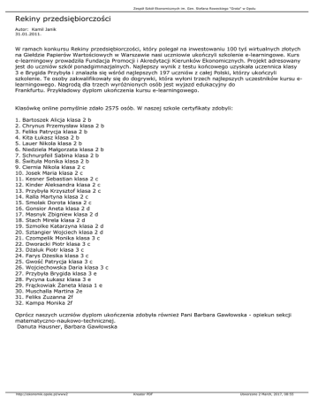 Zespół Szkół Ekonomicznych im. Gen. Stefana Roweckiego "Grota" w Opolu Rekiny przedsiębiorczości Autor: Kamil Janik 31.01.2011. W ramach konkursu Rekiny przedsiębiorczości, który polegał na inwestowaniu 100 tyś wirtualnych złotych na Giełdzie Papierów Wartościowych w Warszawie nasi uczniowie ukończyli szkolenie e-learningowe. Kurs e-learningowy prowadziła Fundacja Promocji i Akredytacji Kierunków Ekonomicznych. Projekt adresowany jest do uczniów szkół ponadgimnazjalnych. Najlepszy wynik z testu końcowego uzyskała uczennica klasy 3 e Brygida Przybyła i znalazła się wśród najlepszych 197 uczniów z całej Polski, którzy ukończyli szkolenie. Te osoby zakwalifikowały się do dogrywki, która wyłoni trzech najlepszych uczestników kursu elearningowego. Nagrodą dla trzech wyróżnionych osób jest wyjazd edukacyjny do Frankfurtu. Przykładowy dyplom ukończenia kursu e-learningowego. Klasówkę online pomyślnie zdało 2575 osób. W naszej szkole certyfikaty zdobyli: 1. Bartoszek Alicja klasa 2 b 2. Chrynus Przemysław klasa 2 b 3. Feliks Patrycja klasa 2 b 4. Kita Łukasz klasa 2 b 5. Lauer Nikola klasa 2 b 6. Niedziela Małgorzata klasa 2 b 7. Schnurpfeil Sabina klasa 2 b 8. Śwituła Monika klasa 2 b 9. Ciernia Nikola klasa 2 c 10. Josek Maria klasa 2 c 11. Kesner Sebastian klasa 2 c 12. Kinder Aleksandra klasa 2 c 13. Przybyła Krzysztof klasa 2 c 14. Ralla Martyna klasa 2 c 15. Smolak Dorota klasa 2 c 16. Gonsior Aneta klasa 2 d 17. Masnyk Zbigniew klasa 2 d 18. Stach Mirela klasa 2 d 19. Szmolke Katarzyna klasa 2 d 20. Sztangier Wojciech klasa 2 d 21. Czompelik Monika klasa 3 c 22. Dworacki Piotr klasa 3 c 23. Dżaluk Piotr klasa 3 c 24. Farys Dżesika klasa 3 c 25. Gwość Patrycja klasa 3 c 26. Wojciechowska Daria klasa 3 c 27. Przybyła Brygida klasa 3 e 28. Pycyna Łukasz klasa 3 e 29. Frąckowiak Żaneta klasa 1 e 30. Muschalla Martina 2e 31. Feliks Zuzanna 2f 32. Kampa Monika 2f Oprócz naszych uczniów dyplom ukończenia zdobyła również Pani Barbara Gawłowska - opiekun sekcji matematyczno-naukowo-technicznej. Danuta Hausner, Barbara Gawłowska http://ekonomik.opole.pl/www2 Kreator PDF Utworzono 2 March, 2017, 08:55