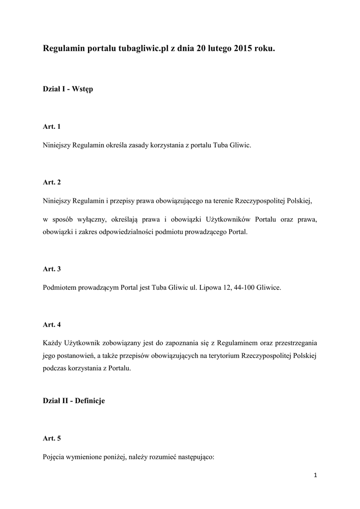Regulamin portalu tubagliwic.pl z dnia 20 lutego 2015 roku. Dział I - Wstęp Art. 1 Niniejszy Regulamin określa zasady korzystania z portalu Tuba Gliwic. Art. 2 Niniejszy Regulamin i przepisy prawa obowiązującego na terenie Rzeczypospolitej Polskiej, w sposób wyłączny, określają prawa i obowiązki Użytkowników Portalu oraz prawa, obowiązki i zakres odpowiedzialności podmiotu prowadzącego Portal. Art. 3 Podmiotem prowadzącym Portal jest Tuba Gliwic ul. Lipowa 12, 44-100 Gliwice. Art. 4 Każdy Użytkownik zobowiązany jest do zapoznania się z Regulaminem oraz przestrzegania jego postanowień, a także przepisów obowiązujących na terytorium Rzeczypospolitej Polskiej podczas korzystania z Portalu. Dział II - Definicje Art. 5 Pojęcia wymienione poniżej, należy rozumieć następująco: 1 Portal Portal dostępny pod adresem internetowym www.tubagliwic.pl Użytkownik Osoba fizyczna posiadająca aktywne Konto w Portalu Konto Dostępne, po zalogowaniu, miejsce w Portalu, w którym Użytkownik może wprowadzać, modyfikować i usuwać swoje dane i inne elementy związane z użytkowaniem Portalu. Profil Miejsce w Internecie, gdzie opublikowane są dane wprowadzone przez Użytkownika. Nazwa Profilu/Loginu indywidualna i niepowtarzalna nazwa wybrana przez Użytkownika. Komentarz/Wpis Wyrażenie opinii przez Użytkownika w Portalu. Prywatna wiadomość Wiadomość wysyłana Użytkownikowi przez innego Użytkownika za pośrednictwem wewnętrznego systemu wiadomości Portalu. 2 Spinacz/Pasje Grupa Użytkowników powiązana ze sobą podobnymi zainteresowaniami. Ban Blokada dostępu nałożona na Użytkownika za złamanie postanowień Regulaminu. Administrator Osoby zarządzające Portalem Materiały Zdjęcia, filmy, teksty i inne treści umieszczane przez Użytkowników Dział III - Rejestracja i zasady korzystania z Serwisu Art. 6 Użytkownikiem Portalu może być każda osoba fizyczna, która ukończy proces rejestracji oraz zaakceptuje treść Regulaminu w całości. Art. 7 Rejestracja w Portalu polega na poprawnym wypełnieniu formularza i aktywacji konta. Art. 8 Podczas procesu rejestracji Użytkownik zobowiązany jest do podania aktualnych i 3 prawdziwych danych, a także do ich aktualizacji w przypadku nastąpienia zmian. Art. 9 Pozytywne ukończenie procesu rejestracji oznacza zawarcie Umowy na czas nieokreślony na korzystanie z wybranych bezpłatnych funkcjonalności Portalu. Po dokonaniu weryfikacji Konta, Użytkownik uzyskuje pełny dostęp do wszystkich bezpłatnych funkcjonalności Portalu. Art. 10 W celach weryfikacyjnych konieczne jest potwierdzenie założenia konta poprzez pocztę elektroniczną. Art. 11 Zarejestrowany Użytkownik ma prawo do: a. posiadania własnego Konta i Profilu w Portalu, b. zmiany i usunięcia swoich danych za pomocą opcji Konta, c. przeglądania Profili innych Użytkowników złączonych w Spinaczu, d. wysyłania Wiadomości prywatnych, a także komentowania artykułów, profili, wydarzeń, blogów, e. wypowiadania się na forum, czacie i w grupach. Art. 12 Zachowania sprzeczne z dobrymi obyczajami i ogólnie pojętą etykietą są zabronione. W szczególności niedozwolone jest: 4 a. używanie wulgaryzmów i zwrotów powszechnie uważanych za obraźliwe, a także w jakikolwiek sposób naruszających godność, b. umieszczanie materiałów pornograficznych, c. promowanie innych stron internetowych (wyjątek stanowi zgoda administratora), d. wielokrotne umieszczanie tych samych Materiałów, e. rozsyłanie spamu, g. umieszczanie treści i materiałów o charakterze komercyjnym bez pisemnej zgody podmiotu prowadzącego Portal. Dział IV - Konto Art. 13 Użytkownik może posiadać jedno Konto w Portalu. Art. 14 Przekazywanie hasła do Konta osobom trzecim jest zabronione. Art. 15 Z Konta może korzystać wyłącznie Użytkownik. Zabronione jest zakładanie i używanie kont przez 2 lub więcej osób jednocześnie. Art. 16 Użytkownik ma prawo do usunięcia Konta samodzielnie lub kontaktując się z 5 Administratorem Portalu. Usunięcie konta powoduje rozwiązanie Umowy z Portalem. Art. 17 W przypadkach łamania postanowień niniejszego Regulaminu Konto Użytkownika może zostać zablokowane tymczasowo, trwale (Ban) lub usunięte. Blokada lub usunięcie może być zastosowane do wszystkich Kont Użytkownika. Art. 18 Konta zablokowane w trybie art. 17 nie mogą zostać usunięte przez Użytkownika. Art. 19 Konta nieużywane przez 4 miesięcy od ostatniego zalogowania mogą zostać usunięte. Art. 20 W przypadku rozpoczęcia procedury przewidzianej art. 19, Użytkownik zostanie poinformowany o zamiarze usunięcia Konta, w przypadku braku sprzeciwu w ciągu 30 dni, Konto zostaje usunięte. Art. 21 Śmierć Użytkownika powoduje wygaśnięcie Umowy z Portalem. Art. 22 W przypadku wystąpienia okoliczności art. 21 Konto zostaje zablokowane, a następnie 6 usunięte w trybie art. 20. Wyjątek stanowią prośby od rodziny Użytkownika. Dział V - Materiały Użytkownika Art. 23 Użytkownik ponosi pełną i wyłączną odpowiedzialność za Materiały umieszczane w Portalu, w szczególności zdjęcia, filmy, teksty jak i wypowiedzi oraz przesyłane Prywatne Wiadomości. Art. 24 Portal w żaden sposób nie ponosi odpowiedzialności za nieautoryzowane wykorzystanie przez osoby trzecie umieszczonych w Portalu Materiałów. Wszelką odpowiedzialność ponosi Użytkownik. Art. 25 Administrator nie ponosi odpowiedzialności za materiały umieszczane przez Użytkowników, jednakże 0dołoży wszelkich starań, aby usuwać/blokować materiały niezgodne z Regulaminem. Art. 26 Użytkownik oświadcza, że posiada pełnię praw do zamieszczanych przez siebie Materiałów oraz zgodę osób trzecich na publikację w przypadku gdy osoby trzecie występują w Materiałach. 7 Art. 27 Administrator ma prawo do zmniejszania/kompresowania Materiałów Użytkownika bez wcześniejszego informowania. Art. 28 Administrator ma prawo do usunięcia dowolnego Materiału bez poda