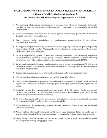 PRZEDMIOTOWY SYSTEM OCENIANIA Z JĘZYKA NIEMIECKIEGO w Zespole Szkół Ogólnokształcących nr 2 im. Króla Jana III Sobieskiego w Legionowie - LICEUM 1. Na pierwszej lekcji języka niemieckiego w nowym roku szkolnym nauczyciel informuje uczniów o zakresie wymagań przedmiotowych i zapoznaje z wymaganiami egzaminu maturalnego. 2. Uczeń zobowiązany jest przynosić na lekcje języka niemieckiego podręcznik z zeszytem ćwiczeń oraz zeszyt przedmiotowy. 3. Prace klasowe będą zapowiadane z tygodniowym wyprzedzeniem i poprzedzone powtórzeniem materiału. 4. W przypadku usprawiedliwionej nieobecności ucznia na pracy klasowej ma prawo napisać tę pracę w ciągu dwóch tygodni. W przypadku nie wywiązania się z tego uczeń uzyskuje ocenę niedostateczną z pracy klasowej. 5. Uczeń w ciągu dwóch tygodni od uzyskania informacji o ocenie z pracy klasowej, ma prawo do jednorazowej poprawy każdej pracy klasowej. Ocena uzyskana z pracy klasowej i z poprawy pracy klasowej są umieszczone w dzienniku elektronicznym LIBRUS. 6. W przypadku usprawiedliwionej nieobecności ucznia w szkole trwającej ponad 30 dni, uczeń ma prawo napisać pracę klasową w okresie dłuższym niż dwa tygodnie po wcześniejszym ustaleniu z nauczycielem. 7. Poprawiając ocenę, uczeń może otrzymać każdą ocenę z obowiązującej skali ocen. 8. Nie ma możliwości poprawiania oceny na tydzień przed klasyfikacją. 9. Nauczyciel ma obowiązek sprawdzić prace klasowe w ciągu dwóch tygodni. Jeżeli nie zrobi tego w ww. terminie, do dziennika wpisuje tylko oceny tych uczniów, którzy wyrazili na to zgodę. 10. Kartkówki mogą być niezapowiedziane, trwają od 10 do 20 minut i będą obejmować materiał maksymalnie z trzech ostatnich tematów. Przed kartkówkami nauczyciel nie ma obowiązku powtórzenia materiału na lekcji. 11. W przypadku usprawiedliwionej nieobecności na kartkówce, uczeń ma możliwość napisania jej w terminie dwóch tygodni od daty powrotu do szkoły. 12. Uczeń ma prawo do jednorazowej poprawy każdej kartkówki. Ocena z poprawy kartkówki jest oceną ostateczną. 13. Nauczyciel ma obowiązek sprawdzić kartkówki w ciągu tygodnia. Jeżeli nie zrobi tego w ww. terminie, do dziennika wpisuje tylko oceny tych uczniów, którzy wyrazili na to zgodę. 14. Oceny bieżące, śródroczne oraz roczne oceny klasyfikacyjne z języka niemieckiego ustala się w stopniach według następującej skali: stopień celujący- 6 (5,51 – 6,00) stopień bardzo dobry- 5 (4,66 – 5,50) stopień dobry- 4 (3,66 – 4,65) stopień dostateczny- 3 (2,66 – 3,65) stopień dopuszczający- 2 (1,76 – 2,65) stopień niedostateczny- 1 (0 – 1, 75) 15. Podstawą do wystawiania oceny śródrocznej jest przede wszystkim poziom osiągnięć edukacyjnych ucznia i stopień opanowania czterech sprawności: mówienia, pisania, czytania i rozumienia tekstu ze słuchu. 16. Przy ocenianiu nauczyciel uwzględnia także zaangażowanie i włożony wysiłek w proces zdobywania wiedzy i realizacji obowiązków oraz możliwości intelektualne ucznia. 17. Ocena śródroczna obrazująca poziom spełnienia wymagań podstawy programowej wystawiana jest na podstawie co najmniej czterech ocen cząstkowych z różnych form pracy podlegających ocenie. 18. Ocena roczna wystawiana jest na podstawie średniej średnich ważonych otrzymanych z ocen z pierwszego i drugiego śródrocza. 19. W ocenianiu bieżącym dopuszcza się stosowanie „+” i „-”. Plusy i minusy wliczane są w średnią ważoną. 20. Za pomocą plusów i minusów będzie oceniane zaangażowanie podczas lekcji. Za sześć plusów uczeń otrzyma ocenę celującą, a za sześć minusów ocenę niedostateczną. a) Uczeń otrzymuje plusy za zaangażowanie podczas lekcji za: - aktywny udział w lekcji, w tym udzielanie poprawnych odpowiedzi na zadawane przez nauczyciela pytania, - wykonywanie poleceń nauczyciela i zadań podczas lekcji z dużym zaangażowaniem, - czynny udział w trakcie pracy w grupach lub parach, - wykonywanie dodatkowych zadań, - estetyczne prowadzenie zeszytu przedmiotowego; b) Uczeń otrzymuje minusy za zaangażowanie podczas lekcji za: - brak udziału w lekcji, - nieestetyczne prowadzenie zeszytu przedmiotowego, - brak zeszytu przedmiotowego i podręcznika z zeszytem ćwiczeń, jeżeli fakt ten nie został zgłoszony na początku lekcji, - brak notatek z lekcji, - odmowę pracy na lekcji i współpracy z nauczycielem bądź z innymi uczniami podczas pracy w parach lub grupach; 2 21. Uczeń ma prawo być nieprzygotowany do lekcji (ustnie lub pisemnie) dwa razy w semestrze. Fakt ten uczeń zgłasza na samym początku lekcji. Nieprzygotowanie nie dotyczy lekcji powtórzeniowych i sprawdzianów pisemnych. Nieprzygotowanie obejmuje brak zeszytu, w którym należało wykonać pracę domową, brak podręcznika z zadanymi do wykonania w nim ćwiczeniami, nieprzygotowanie do odpowiedzi ustnej. 22. Uczeń nieobecny przez dłuższy czas w szkole będzie miał wyznaczony czas na nadrobienie braków. W tym okresie nie będzie on oceniany. 23. Uczeń, wyrażając chęć poprawy oceny z pracy pisemnej, musi zgłosić ten fakt nauczycielowi od razu po jej uzyskaniu i poprawić ją w ciągu tygodnia. 24. Prace domowe będą miały różny charakter i stopień trudności (prace twórcze i odtwórcze). Będą zadawane w formie ustnej i pisemnej. 25. Za nieodrobioną pracę domową (o ile ten fakt nie został usprawiedliwiony przez rodziców lub prawnych opiekunów i wcześniej zgłoszony przez ucznia, jako nieprzygotowanie do lekcji) uczeń otrzymuje ocenę niedostateczną. W wyjątkowych losowych przypadkach decyzję podejmuje nauczyciel. 26. Uczeń zawsze może liczyć na pomoc nauczyciela, jeżeli nie zrozumie partii materiału, gdy chce wyjaśnić wątpliwości oraz gdy chce skonsultować się, co do właściwego wykonania jakiegoś zadania. W takim przypadku uczeń indywidualnie zgłasza nauczycielowi problem i uzgadnia z nim termin na jego rozwiązanie. 