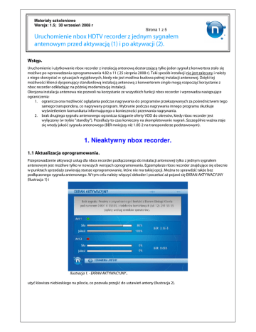 Materiały szkoleniowe Wersja: 1.5; 30 wrzesień 2008 r Strona 1 z 5 Uruchomienie nbox HDTV recorder z jednym sygnałem antenowym przed aktywacją (1) i po aktywacji (2). Wstęp. Uruchomienie i użytkowanie nbox recorder z instalacją antenową dostarczającą tylko jeden sygnał z konwertera stało się możliwe po wprowadzaniu oprogramowania 4.82 a 11 ( 25 sierpnia 2008 r). Taki sposób instalacji nie jest zalecany i należy z niego skorzystać w sytuacjach wyjątkowych, kiedy nie jest możliwa budowa pełnej instalacji antenowej. Dzięki tej możliwości klienci dysponujący standardową instalacją antenową z konwerterem single mogą rozpocząć korzystanie z nboc recorder odkładając na później modernizację instalacji. Okrojona instalacja antenowa nie pozwoli na korzystanie ze wszystkich funkcji nbox recorder i wprowadza następujące ograniczenia: 1. ogranicza ona możliwość oglądania podczas nagrywania do programów przekazywanych za pośrednictwem tego samego transpondera, co nagrywany program. Wybranie podczas nagrywania innego programu skutkuje wyświetleniem komunikatu informującego o konieczności przerwania nagrywania. 2. brak drugiego sygnału antenowego ogranicza ściąganie oferty VOD do okresów, kiedy nbox recorder jest wyłączony (w trybie "standby"). Przedłuży to czas konieczny na skompletowanie nagrań. Szczególnie ważna staje się wtedy jakość sygnału antenowego (BER mniejszy niż 1.0E-2 na transponderze podstawowym). 1. Nieaktywny nbox recorder. 1.1 Aktualizacja oprogramowania. Przeprowadzenie aktywacji usług dla nbox recorder podłączonego do instalacji antenowej tylko z jednym sygnałem antenowym jest możliwe tylko w nowszych wersjach oprogramowania. Egzemplarze nbox recorder znajdujące się obecnie w punktach sprzedaży zawierają starsze oprogramowanie, które nie ma takiej opcji. Można to sprawdzić także bez podłączonego sygnału antenowego. W tym celu należy włączyć dekoder i poczekać aż pojawi się EKRAN AKTYWACYJNY (Ilustracja 1) i Ilustracja 1. - EKRAN AKTYWACYJNY.. użyć klawisza niebieskiego na pilocie, co pozwala przejść do ustawień anteny (Ilustracja 2). Materiały szkoleniowe Wersja: 1.5; 30 wrzesień 2008 r Strona 2 z 5 Uruchomienie nbox HDTV recorder z jednym sygnałem antenowym przed aktywacją (1) i po aktywacji (2). Ilustracja 2. - USTAWIENIA ANTENY Brak opisu związanego z żółtym klawiszem (WYŁĄCZ) na pasku informacyjnym, który pokazany jest na ilustracji 2 oznacza, że przed aktywacją konieczna jest aktualizacja oprogramowania. Przyprowadzenie aktualizacji oprogramowania przed aktywacją jest możliwe i wymaga prawidłowego sygnału antenowego z satelity Hot Bird. Sposób przeprowadzenia aktywacji oprogramowania zależy od rodzaju programowania wgranego do nbox recorder. • W starszych wersjach należy podłączyć kabel antenowy do wejścia ANT 2 lub ANT1 tak, aby komunikat „BRAK SYGNAŁU” zmienił się na komunikat „KANAŁ NIEDOSTĘPNY”, a następnie nacisnąć klawisz SETUP na pilocie i wybrać opcję AKTUALIZACJA OPROGRAMOWANIA (PIN 1234). Jeśli nbox nie znajdzie nowego oprogramowania, należy podłączyć sygnał antenowy do innego wejścia antenowego (ANT1 lub ANT2) i ponownie spróbować ponownie uruchomić aktualizację. • W drugiej wersji oprogramowania aktualizacja oprogramowania odbywa się automatycznie podczas startu po włączeniu zasilania. Konieczne jest wtedy podłączenie sygnału antenowego do wejścia ANT 2. 1.2 Konfiguracja. Skorzystanie z instalacji z jednym przewodem wymaga podłączenia sygnału antenowego do wejścia o znaczonego na płycie tylnej dekoder "ANT 1" oraz wyłączenia obsługi drugiej anteny. Ilustracja 3. - Wejścia antenowe nbox recorder Materiały szkoleniowe Wersja: 1.5; 30 wrzesień 2008 r Strona 3 z 5 Uruchomienie nbox HDTV recorder z jednym sygnałem antenowym przed aktywacją (1) i po aktywacji (2). Jej wyłączenie umożliwia opcja WYŁĄCZ z ekranu USTAWIENIA ANTENY (sposób jego otwarcia opisano wcześniej) uruchamiana klawiszem żółty na pilocie, zgodnie z opisem na pasku informacyjnym. Po wyłączeniu zmieni się treść ekranu. Pojawi się informacja potwierdzająca zmianę konfiguracji dekodera, ostrzeżenie o ograniczeniach z tym związanych oraz o informacja sposobie ponownego włączenia anteny drugiej (Ilustracja 3). Ilustracja 4. - USTAWIENIA ANTENY po użyciu opcji "WYŁĄCZ" Naciśnięcie klawisza OK uruchamia test konfiguracji. Wynik taki jak na ilustracji 5 oznacza, że możliwa będzie aktywacja nbox recorder. Ilustracja 5. - TEST ANTENY. Po akceptacji ustawień klawiszem OK, następuje pobranie listy kanałów i otwarty zostaje EKRAN AKTYWACYJNY (Ilustracja 6). Materiały szkoleniowe Wersja: 1.5; 30 wrzesień 2008 r Strona 4 z 5 Uruchomienie nbox HDTV recorder z jednym sygnałem antenowym przed aktywacją (1) i po aktywacji (2). Ilustracja 6. - EKRAN AKTYWACYJNY - po teście anteny ( ilustracje 1 i 6 różnią się kilkoma szczegółami!) Można przystąpić do aktywacji usług mimo komunikatu o braku sygnału oznaczonego jako "Ant 2". 2. Aktywny nbox recorder. 2.1 Wyłączenie obsługi anteny drugiej (po aktywacji). Włączenie i wyłączenie obsługi anteny drugiej jest możliwe w aktywowanym nbox recorder. Do ustawień drugiej wchodzimy włączając menu (klawisz SETUP na pilocie), wybierając USTAWIENIA, a po wprowadzeniu PIN (domyślnie 1234) wybierając opcję ANTENA oraz na koniec korzystając z klawisza OK., który powoduje przejście z ekranu ANTENA 1 do ekranu ANTENA 2 (Ilustracja 6). Ilustracja 7. - ANTENA 2. Materiały szkoleniowe Wersja: 1.5; 30 wrzesień 2008 r Strona 5 z 5 Uruchomienie nbox HDTV recorder z jednym sygnałem antenowym przed aktywacją (1) i po aktywacji (2). Po skorzystaniu z opcji "WYŁĄCZ" (żółty klawisz) pojawia się informacja o ograniczeniach w funkcjonowaniu nbox recorder i możliwości ponownego włączenia obsługi drugiej anteny. Ilustracja 8. - ANTENA 2 - informacje po wyłączeniu.
