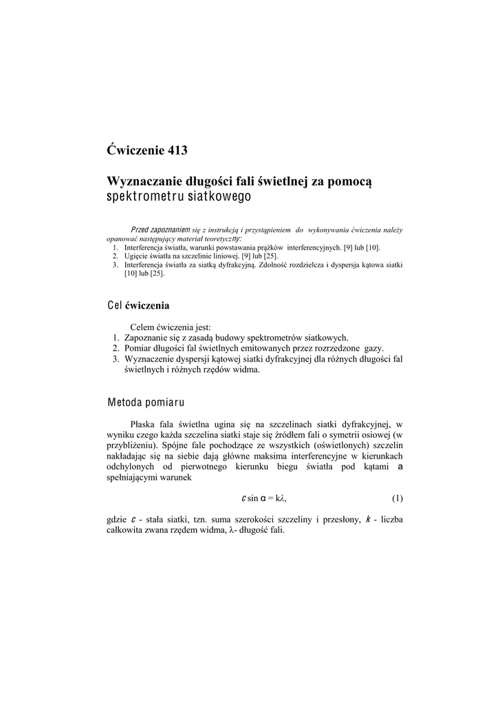 ûZLF]HQLH :\]QDF]DQLHGáXJRĞFLIDOLĞZLHWOQHM]DSRPRFą spektrometru siatkowego Przed zapoznaniem VLĊ ]LQVWUXNFMąLSU]\VWąSLHQLHPGRZ\NRQ\ZDQLDüZLF]HQLDQDOHĪ\ RSDQRZDüQDVWĊSXMąF\PDWHULDáWHRUHW\F]ny: 1. ,QWHUIHUHQFMDĞZLDWáDZDUXQNLSRZVWDZDQLDSUąĪNyZLQWHUIHUHQF\MQ\FK>@OXE>@ 2. 8JLĊFLHĞZLDWáDQDV]F]HOLQLHOLQLRZHM>@OXE>@ 3. ,QWHUIHUHQFMDĞZLDWáD]DVLDWNąG\IUDNF\MQą=GROQRĞüUR]G]LHOF]DLG\VSHUVMDNąWRZDVLDWNL [10] lub [25]. C el üZLF]HQLD &HOHPüZLF]HQLDMHVW 1. =DSR]QDQLHVLĊ]]DVDGąEXGRZ\VSHNWURPHWUyZVLDWNRZ\FK 2. 3RPLDUGáXJRĞFLIDOĞZLHWOQ\FKHPLWRZDQ\FKSU]H]UR]U]HG]RQHJD]\ 3. :\]QDF]HQLHG\VSHUVMLNąWRZHMVLDWNLG\IUDNF\MQHMGODUyĪQ\FKGáXJRĞFLIDO ĞZLHWOQ\FKLUyĪQ\FKU]ĊGyZZLGPD M etoda pomiaru 3áDVND IDOD ĞZLHWOQD XJLQD VLĊ QD V]F]HOLQDFK VLDWNL G\IUDNF\MQHM Z Z\QLNXF]HJRNDĪGDV]F]HOLQDVLDWNLVWDMHVLĊĨUyGáHPIDOLRV\PHWULLRVLRZHMZ SU]\EOLĪHQLX 6SyMQH IDOH SRFKRG]ąFH ]H ZV]\VWNLFK RĞZLHWORQ\FK V]Fzelin QDNáDGDMąF VLĊ QD VLHELH GDMą JáyZQH PDNVLPD LQWHUIHUHQF\MQH Z NLHUXQNDFK RGFK\ORQ\FK RG SLHUZRWQHJR NLHUXQNX ELHJX ĞZLDWáD SRG NąWDPL a VSHáQLDMąF\PLZDUXQHN c sin Į = kȜ, (1) gdzie c - VWDáD VLDWNL W]Q VXPD V]HURNRĞFL V]F]HOLQ\ L SU]HVáRQ\ k - liczba FDáNRZLWD]ZDQDU]ĊGHPZLGPDȜ- GáXJRĞüIDOL :\]QDF]DQLHGáXJRĞFLIDOLĞZLHWOQHM]DSRPRFąVSHNWURPHWUXVLDWNRZHJR '\VSHUVMD NąWRZD VLDWNL D jest zdefiniowana wzorem D XĪ\FLXZ]RUXPRĪH]RVWDüZ\UDĪRQDMDNR k . D c cosD 327 dD . Przy dO (2) Przebieg pomiaru 6SHNWURPHWU VLDWNRZ\ U\V VNáDGD VLĊ ] NROLPDWRUD VLDWNL G\IUDNF\MQHM XPLHV]F]RQHM QD VWROLNX ]DRSDWU]RQ\P Z VNDOĊ NąWRZą RUD] OXQHWNLNWyUąPRĪQDREUDFDüZ]JOĊGHPSLRQRZHMRVLOHĪąFHMZSáDV]F]\ĨQLH VLDWNLG\IUDNF\MQHM3RáRĪHQLHOXQHWNLRGF]\WXMHVLĊQDVNDOLNąWRZHMVWROLND Rys. 1. Schemat spektrometru siatkowego. :\FKRG]ąFD ] NROLPDWRUD SáDVND IDOD ĞZLHWOQD SDGD SURVWRSDGOH na VLDWNĊ L XJLQD VLĊ QD MHM V]F]HOLQDFK )DOH XJLĊWH SRG NąWHP a ]RVWDMą ]HEUDQH SU]H] RELHNW\Z OXQHWNL GDMąF REUD] V]F]HOLQ\ NROLPDWRUD Z SáDV]F]\ĨQLH 0 MHJRRJQLVNRZHM2EUD]WHQMHVWMDVQ\ZyZF]DVJG\NąWa VSHáQLDZDUXQHN Obrazy szczeliny moĪQD REVHUZRZDü SU]H] RNXODU OXQHWNL D QD VNDOL NąWRZHM VWROLND RGF]\WDü LFK SRáRĪHQLH NąWRZH 0LHU]ąF NąW XJLĊFLD a dla SUąĪNyZRUyĪQ\FKEDUZDFKPRĪQDZ\]QDF]\üRGSRZLDGDMąFHLPGáXJRĞFLIDO c sin D O . (3) k ħUyGáDPL EDGDQHJR ĞZLDWáD Vą UXUNL 3Ockera zasilane z odpowiedniego ]DVLODF]DZ\VRNLHJRQDSLĊFLD .ROHMQRĞüF]\QQRĞFL ûZLF]HQLH 328 1. 8PRFRZDQą Z VWDW\ZLH UXUNĊ 3OFNHUD XVWDZLü QDSU]HFLZ V]F]HOLQ\ NROLPDWRUD Z RGOHJáRĞFL RNRáR FP /XQHWNĊ XVWDZLü WDN DE\ MHM RĞ RSW\F]QDSRNU\ZDáDVLĊ]RVLąRSW\F]QąNROLPDWRUD 2. 3RáąF]\ü UXUNĊ ] JQLD]GDPL Z\MĞFLRZ\PL ]DVLODF]D Z\VRNLHJR QDSLĊFLD :áąF]\ü]DVLODF] 8ZDJD3RZáąF]HQLX]DVLODF]DQLHGRW\NDüUXUNLDQLSU]HZRGyZ 3. 2EVHUZXMąFZLGPR]HURZHJRU]ĊGXSUąĪHN FHQWUDOQ\WDNXVWDZLüRNXODU OXQHWNL DE\ ZLGDü E\áR RVWUR V]F]HOLQĊ NROLPDWRUD 6]F]HOLQD NROLPDWRUD PXVL E\ü XVWDZLRQD SLRQRZR D RJOąGDQ\ SUąĪHN SRZLQLHQ E\ü EDUG]R ZąVNL 4. 2EUyFLü OXQHWNĊ DE\ ZLGRF]QH Z QLHM VNU]\ĪRZDQLH QLFL SDMĊF]\FK SRNU\áRVLĊ] GRZROQLHZ\EUDQ\PSUąĪNLHPZLGPDSLHUZV]HJRU]ĊGX1D VNDOLNąWRZHMRGF]\WDüSRáRĪHQLHOXQHWNLf1. 5. 3RVWĊSXMąF MDN SRSU]HGQLR RGF]\WDü NąW f2 RGSRZLDGDMąF\ SUąĪNRZL WHM VDPHM EDUZ\ Z ZLGPLH SLHUZV]HJR U]ĊGX SR SU]HFLZQHM VWURQLH SUąĪND FHQWUDOQHJR5yĪQLFDW\FKNąWyZMHVWUyZQDSRGZRMRQHMZDUWRĞFLNąWD XJLĊFLD (4) I1 I2 2D . 6. 3RVWĊSXMąF ]JRGQLH ]H ZVND]DQLDPL SXQNWyZ L ]PLHU]\ü NąW\ f1 i f2, RGSRZLDGDMąFHSUąĪNRPUyĪQ\FKEDUZZZLGPLe pierwszego i drugiego U]ĊGX 8ZDJD1DW\FKPLDVWSRGRNRQDQLXSRPLDUyZZ\áąF]\ü]DVLODF] 7. :\QLNLSRPLDUyZf1 i f2 ]HEUDüZWDEHOL barwa ĞZLDWáD U]ąG widma f1 [q] f2 [q] rodzaj gazu a l [nm] [q] ǻO [nm] D [mm]-1 ǻD [mm]-1 O pracowanie sprawozdania 6SUDZR]GDQLHSRZLQQR]DZLHUDü 1. .UyWNL RSLV PHWRG\ SRPLDUXZ W\P V]NLF VSHNWURPHWUX VLDWNRZHJR EH] Z\PLHQLDQLDNROHMQ\FKF]\QQRĞFL 2. 7DEHOH]ZDUWRĞFLDPLZLHONRĞFLPLHU]RQ\FKLREOLF]DQ\FK 3. 2EOLF]HQLD QD SRGVWDZLH Z]RUX GáXJRĞFL IDO RGSRZLDGDMąF\FK REVHUZRZDQ\PSUąĪNRP6WDáDVLDWNLc zostanie podana w pracowni. :\]QDF]DQLHGáXJRĞFLIDOLĞZLHWOQHM]DSRPRFąVSHNWURPHWUXVLDWNRZHJR 329 4. 2EOLF]HQLD QD SRGVWDZLH Z]RUX G\VSHUVML NąWRZHM VLDWNL GOD ]PLHU]RQ\FKNąWyZa. 5. :\NUHV\]DOHĪQRĞFL D (aGODZLGPDSLHUZV]HJRLGUXJLHJRU]ĊGX 6. 2EOLF]HQLDPDNV\PDOQ\FKEáĊGyZEH]Z]JOĊGQ\FK 'O OctgD 'I , (5) 'D DtgD 'I . (6) :SRZ\ĪV]\FKZ]RUDFKRV]DFRZDQąZDUWRĞüEáĊGXǻISRPLDUXNąWDQDOHĪ\ SRGVWDZLüZPLHU]HáXNRZHM:\QLNLREOLF]HĔQDOHĪ\XPLHĞFLüZWDEHOL Pytania 1. &RWRMHVWG\IUDNFMDĞZLDWáDLZMDNLFKZDUXQNDFKPRĪHE\üREVHUZRZDQD" 2. &R WR MHVW VLDWND G\IUDNF\MQD" =GHILQLRZDü ]GROQRĞü UR]G]LHOF]ą VLDWNL dyfrakcyjnej. 3. Co to jest interferencja fal? 4. Jakie fale na]\ZDVLĊVSyMQ\PL" 5. &RQD]\ZDVLĊID]ąIDOL" 6. -DNL ZDUXQHN PXV]ą VSHáQLDü GURJL RSW\F]QH ĞZLDWáD D WDNĪH ID]\ IDO ĞZLHWOQ\FKDE\ZZ\QLNXLFKQDáRĪHQLDSRZVWDáMDVQ\OXEFLHPQ\SUąĪHN interferencyjny? 7. :\SURZDG]LüZ]yU 8. 'ODF]HJRJG\GáXJRĞFLGZXIDO ]E\WPDáRVLĊUyĪQLąREVHUZXMHP\MHGHQ SUąĪHNLQWHUIHUHQF\MQ\"