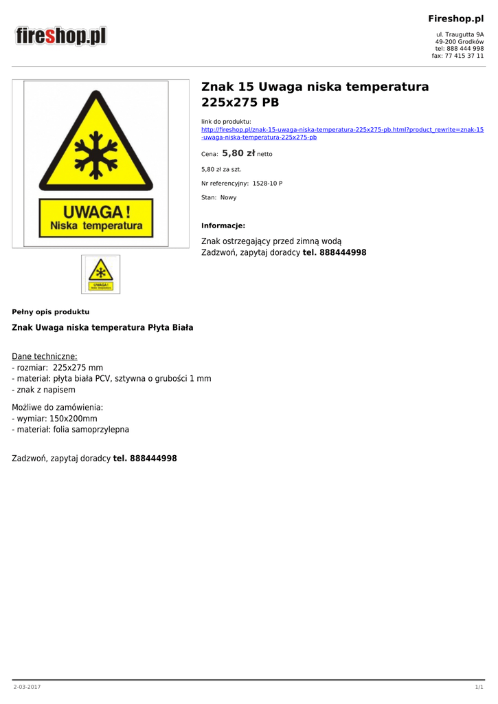 Fireshop.pl ul. Traugutta 9A 49-200 Grodków tel: 888 444 998 fax: 77 415 37 11 Znak 15 Uwaga niska temperatura 225x275 PB link do produktu: http://fireshop.pl/znak-15-uwaga-niska-temperatura-225x275-pb.html?product_rewrite=znak-15 -uwaga-niska-temperatura-225x275-pb Cena: 5,80 zł netto 5,80 zł za szt. Nr referencyjny: 1528-10 P Stan: Nowy Informacje: Znak ostrzegający przed zimną wodą Zadzwoń, zapytaj doradcy tel. 888444998 Pełny opis produktu Znak Uwaga niska temperatura Płyta Biała Dane techniczne: - rozmiar: 225x275 mm - materiał: płyta biała PCV, sztywna o grubości 1 mm - znak z napisem Możliwe do zamówienia: - wymiar: 150x200mm - materiał: folia samoprzylepna Zadzwoń, zapytaj doradcy tel. 888444998 2-03-2017 1/1
