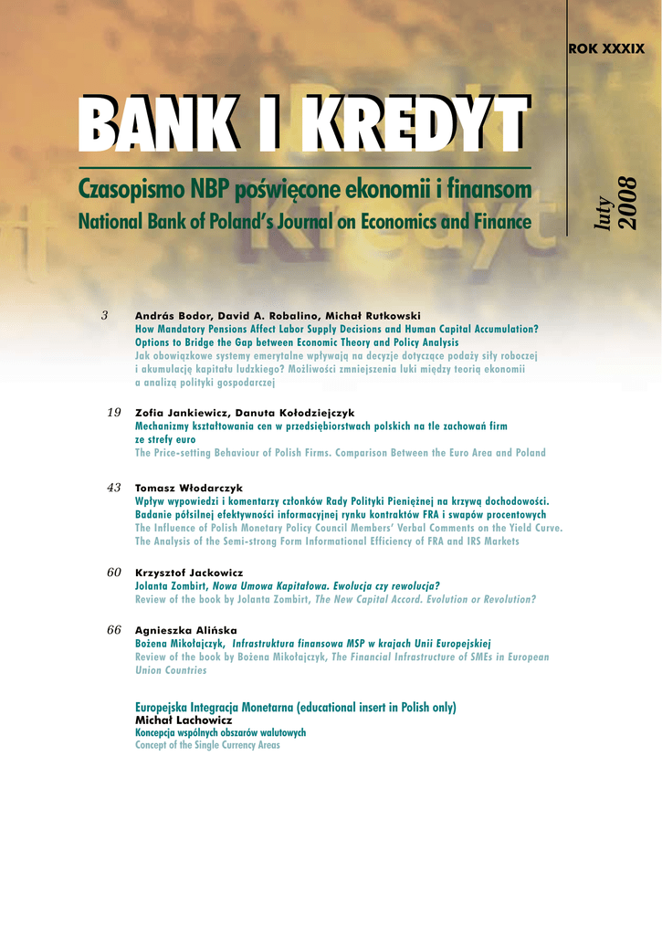 ROK XXXIX National Bank of Poland’s Journal on Economics and Finance 3 András Bodor, David A. Robalino, Michał Rutkowski How Mandatory Pensions Affect Labor Supply Decisions and Human Capital Accumulation? Options to Bridge the Gap between Economic Theory and Policy Analysis Jak obowiązkowe systemy emerytalne wpływają na decyzje dotyczące podaży siły roboczej i akumulację kapitału ludzkiego? Możliwości zmniejszenia luki między teorią ekonomii a analizą polityki gospodarczej 19 Zofia Jankiewicz, Danuta Kołodziejczyk 43 Tomasz Włodarczyk 60 Krzysztof Jackowicz 66 Agnieszka Aliƒska Mechanizmy kształtowania cen w przedsiębiorstwach polskich na tle zachowań firm ze strefy euro The Price-setting Behaviour of Polish Firms. Comparison Between the Euro Area and Poland Wpływ wypowiedzi i komentarzy członków Rady Polityki Pieniężnej na krzywą dochodowości. Badanie półsilnej efektywności informacyjnej rynku kontraktów FRA i swapów procentowych The Influence of Polish Monetary Policy Council Members’ Verbal Comments on the Yield Curve. The Analysis of the Semi-strong Form Informational Efficiency of FRA and IRS Markets Jolanta Zombirt, Nowa Umowa Kapitałowa. Ewolucja czy rewolucja? Review of the book by Jolanta Zombirt, The New Capital Accord. Evolution or Revolution? Bożena Mikołajczyk, Infrastruktura finansowa MSP w krajach Unii Europejskiej Review of the book by Bożena Mikołajczyk , The Financial Infrastructure of SMEs in European Union Countries Europejska Integracja Monetarna (educational insert in Polish only) Micha∏ Lachowicz Koncepcja wspólnych obszarów walutowych Concept of the Single Currency Areas luty Czasopismo NBP poświęcone ekonomii i finansom 2008 Bank i Kredyt Rada Naukowa/Scientific Council Peter Backé (Oesterreichische Nationalbank), Wojciech Charemza (University of Leicester), Stanisław Gomułka (London School of Economics and Political Science), Marek Góra (Szkoła Główna Handlowa), Marek Gruszczyński (Szkoła Główna Handlowa), Urszula Grzelońska (Szkoła Główna Handlowa), Danuta Hübner (European Commission), Krzysztof Jajuga (Akademia Ekonomiczna we Wrocławiu), Bartłomiej Kamiński (University of Maryland; The World Bank), Jerzy Konieczny (Wilfrid Laurier University), Wojciech Maciejewski (Uniwersytet Warszawski), Krzysztof Marczewski (Szkoła Główna Handlowa; Instytut Badań Rynku, Konsumpcji i Koniunktur), Ewa Miklaszewska (Uniwersytet Ekonomiczny w Krakowie), Timothy P. Opiela (DePaul University, Chicago), Witold Orłowski (Niezależny Ośrodek Badań Ekonomicznych; Szkoła Biznesu Politechniki Warszawskiej), Zbigniew Polański (zastępca przewodniczącego/Deputy Chairman, Narodowy Bank Polski; Szkoła Główna Handlowa), Bogusław Pietrzak (Szkoła Główna Handlowa; Narodowy Bank Polski), Wiesława Przybylska-Kapuścińska (Akademia Ekonomiczna w Poznaniu), Zbynek Revenda (Vysoká skola ekonomická v Praze), Michel A. Robe (American University; U.S. Commodity Futures Trading Commission), Michał Rutkowski (The World Bank), Sławomir Stanisław Skrzypek (przewodniczący/Chairman, prezes/President, Narodowy Bank Polski), Adalbert Winkler (European Central Bank), Charles Wyplosz (Graduate Institute of International Studies, Geneva) ^ ^ Kolegium Redakcyjne/Editorial Board Piotr Boguszewski, Tomasz Chmielewski, Elżbieta Czarny, Krzysztof Gajewski (sekretarz kolegium redakcyjnego/Assistant Editor), Małgorzata Iwanicz-Drozdowska, Ryszard Kokoszczyński, Adam Koronowski, Wojciech Pacho, Bogusław Pietrzak (zastępca redaktora naczelnego/Deputy Managing Editor), Zbigniew Polański (redaktor naczelny/Managing Editor), Andrzej Rzońca, Cezary Wójcik, Zbigniew Żółkiewski Zgodnie z wykazem sporządzonym przez Ministerstwo Nauki i Szkolnictwa Wyższego dla potrzeb przyszłej oceny parametrycznej jednostek naukowych, publikacjom naukowym w „Banku i Kredycie" przyznawane jest 6 punktów. Wersje elektroniczne artykułów publikowanych w „Banku i Kredycie" są dostępne za pośrednictwem serwisu Social Science Research Network (http://www.ssrn.com) Electronic versions of the articles published in "Bank i Kredyt" are available at the Social Science Research Network (http://www.ssrn.com) Wydawca/Publisher Narodowy Bank Polski Kontakt/Contact ulica Świętokrzyska 11/21, 00-919 Warszawa, Poland tel.: +48 22 585 43 26 fax: +48 22 826 99 35 e-mail: [email protected] http://www.nbp.pl/bankikredyt Projekt/Project DOCTORAD Skład i Druk/Typesetting and printing Drukarnia NBP/Printing House of the NBP Korekta/Editing Departament Komunikacji Społecznej NBP/Department of Information and Public Relations NBP Prenumerata/Subscription „RUCH” SA - wpłaty na prenumeratę przyjmują: jednostki kolportażowe właściwe dla miejsca zamieszkania lub siedziby prenumeratora (dostawa w sposób uzgodniony). Wpłaty przyjmuje Oddział Krajowej Dystrybucji Prasy „RUCH“ SA na konto: Pekao SA IV O/Warszawa 12401053-40060347-2700-401112-001 lub kasa Oddziału. Cena prenumeraty ze zleceniem dostawy za granicę jest o 100% wyższa od krajowej. Zlecenia na prenumeratę dewizową, przyjmowane od osób zamieszkałych za granicą, realizowane są od dowolnego numeru w danym roku kalendarzowym. Wpłaty są przyjmowane na okresy kwartalne w terminie: do 5.12 - na I kw. następnego roku, do 5.03 - na II kw.br., do 5.06 na III kw. br., do 5.09 na IV kw. br. Informacje o warunkach prenumeraty w „RUCH” SA OKDP, ul. Jana Kazimierza 31/33 00-958 Warszawa, można uzyskać pod tel. 532-87-31, 532-88-20. www.ruch.pol.pl Prenumerata własna i zamawianie pojedynczych egzemplarzy: Narodowy Bank Polski - Departament Komunikacji Społecznej, ulica Świętokrzyska 11/21, 00-919 Warszawa, nakład: 1100 konto: Centrala NBP - Departament Operacyjno-Rachunkowy nr konta: NBP DOR 871010-0000-0000-1323-9600-0000 2008 r. - 204,00 zł, 1 egz. - 17,00 zł Macroeconomics B a n k i K r e dy t l u t y 2 0 0 8 How Mandatory Pensions Affect Labor Supply Decisions and Hum