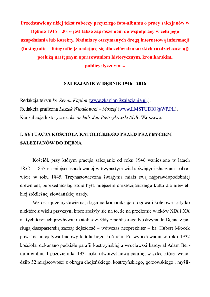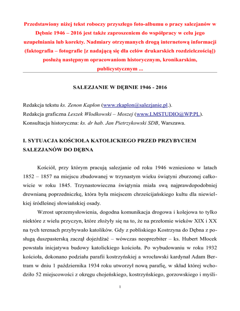 Przedstawiony niżej tekst roboczy przyszłego foto-albumu o pracy salezjanów w Dębnie 1946 – 2016 jest także zaproszeniem do współpracy w celu jego uzupełniania lub korekty. Nadmiary otrzymanych drogą internetową informacji (faktografia – fotografie [z nadającą się dla celów drukarskich rozdzielczością]) posłużą następnym opracowaniom historycznym, kronikarskim, publicystycznym ... SALEZJANIE W DĘBNIE 1946 - 2016 Redakcja tekstu ks. Zenon Kapłon ([email protected].). Redakcja graficzna Leszek Włodkowski – Moszej ([email protected]). Konsultacja historyczna: ks. dr hab. Jan Pietrzykowski SDB, Warszawa. I. SYTUACJA KOŚCIOŁA KATOLICKIEGO PRZED PRZYBYCIEM SALEZJANÓW DO DĘBNA Kościół, przy którym pracują salezjanie od roku 1946 wzniesiono w latach 1852 – 1857 na miejscu zbudowanej w trzynastym wieku świątyni zburzonej całkowicie w roku 1845. Trzynastowieczna świątynia miała swą najprawdopodobniej drewnianą poprzedniczkę, która była miejscem chrześcijańskiego kultu dla niewielkiej śródleśnej słowiańskiej osady. Wzrost uprzemysłowienia, dogodna komunikacja drogowa i kolejowa to tylko niektóre z wielu przyczyn, które złożyły się na to, że na przełomie wieków XIX i XX na tych terenach przybywało katolików. Gdy z pobliskiego Kostrzyna do Dębna z posługą duszpasterską zaczął dojeżdżać – wówczas neoprezbiter – ks. Hubert Młocek powstała inicjatywa budowy katolickiego kościoła. Po wybudowaniu w roku 1932 kościoła, dokonano podziału parafii kostrzyńskiej a wrocławski kardynał Adam Bertram w dniu 1 października 1934 roku utworzył nową parafię, w skład której wchodziło 52 miejscowości z okręgu chojeńskiego, kostrzyńskiego, gorzowskiego i myśli1 borskiego. Taki rozległy teren objął swą troską duszpasterską ks. Hubert, którego wśród wielu życzliwych mieszkańców w nowo utworzonej katolickiej parafii w Neudamm wspierali duchowo również rodzice wybierający się w podróż koleją ze Śląska. Jeszcze w latach pięćdziesiątych ojciec ks. Huberta przyjeżdżał do Dębna na grób swego jedynego syna, który zmarł w dniu 12 listopada 1945 roku. W czasie działań wojennych mający aktualnie wezwanie św. Apostołów Piotra i Pawła kościół nie doznał większych uszkodzeń ale kilkakrotnie miał pełnić funkcję domu kultury dla żołnierzy sowieckich. Po zakończeniu działań wojennych już w lutym 1945 roku do miasta przybywali pierwsi osadnicy, którzy na spotkania liturgiczne gromadzili się w Kościele pod wezwaniem św. Antoniego Padewskiego. W dniu 7 lipca 1945 przeniosły się do Dębna władze powiatu chojeńskiego. Dla coraz większej liczby mieszkańców miasta, które 1 sierpnia 1945 roku otrzymało nazwę Dąb Nowy, w dniu 24 grudnia tegoż roku ks. Wiktor Markiewicz dokonał poświęcenia opuszczonego przez protestantów zboru, z przeznaczeniem dla celów kultu katolickiego. II. OKOLICZNOŚCI PRZYBYCIA SALEZJANÓW DO DĘBNA I POSŁUGA DUSZPASTERSKA KS. ANTONIEGO KOLODZIEJCZAKA SDB Przebywający w Rzymie (14 IV – 11 VII 1945 r.) prymas August Hlond przygotował propozycje odnowy życia kościelnego i religijnego w Polsce i 28 czerwca 1945 r. przedstawił je pisemnie mons. Domenico Tardiniemu, sekretarzowi Kongregacji do Spraw Nadzwyczajnych Kościoła. Projekty te zostały zreferowane papieżowi Piusowi XII, który 8 lipca udzielił kardynałowi Hlondowi nadzwyczajnych pełnomocnictw (facolta specjalissime), z których mógł korzystać na całym terytorium polskim. Odpowiadając na apel prymasa salezjanie oddelegowali kilku księży do dyspozycji administratora apostolskiego w Gorzowie Wielkopolskim, prosząc, aby przydzielono im parafie blisko siebie. Od lutego do września 1946 roku na Pomorzu Za2 chodnim salezjanie objęli opieką duszpasterską placówki duszpasterskie: Banie, Dębno, Stare Czarnowo, Swobnicę, Szczecin-Gumieńce, Widuchową. Pierwsza nazwa miasta Dąb Nowy od 1 stycznia 1946 została zmieniona na Dębno Lubuskie, która następnie została skrócona, i od dnia 7 maja 1946 została zmieniona na Dębno. Nazwa Dębno Lubuskie utrzymała jako nazwa stacji PKP, a przez pewien czas tak adresowano korespondencję. Od 7 lipca 1945 do 31 maja 1975 Dębno było siedzibą powiatu. W będącym dalekim zapleczem ekonomicznym atomowego imperium sowieckiego Dębnie stopniowo rozwijał się przemysł spożywczy oparty na lokalnym rolnictwie, przemysł metalowy i obuwniczy. Ludność miasta, która w roku 1948 nie przekraczała 4 tysięcy, w 1997 roku liczyła 14,5 tysiąca. Przynależące wcześniej do województwa szczecińskiego, od 1 czerwca 1975 roku do 31 grudnia 1998 Dębno przejściowo wchodziło w skład utworzonego wtedy między innymi województwa gorzowskiego, ażeby znaleźć się w nowo utworzonym województwie zachodniopomorskim.. W okresie tak zwanej transformacji ustrojowej 1989 – 1990 miasto stopniowo zapominało o swych aspiracjach do średniej wielkości uprzemysłowienia i o sprzężonym zwrotnie z takim uprzemysłowieniem sprawnym połączeniu kolejowym towarowym i osobowym. Aktualnie na szczególne uznanie zasługuje to wszystko, co jest budowaniem fundamentów pod przyszłe uprzemysłowienie Dębna, a w szczególności jest to troska o rozwój komunikacji drogowej, zaplecze logistyczne, szeroko pojętą kulturę, zwłaszcza kulturę fizyczną, i o estetykę miasta. III. KSIĘŻA PEŁNIĄCY OBOWIĄZKI PROBOSZCZÓW I DYREKTORÓW DOMU ZAKONNEGO Po przejęciu na początku marca już poświęconego kościoła i parafii pierwszy salezjanin – ks. Antoni Kołodziejczak rozpoczął poszukiwanie niezbędnego sprzętu liturgicznego i zajął się spontaniczną organizacją życia parafialnego. Po odwołaniu 3 ks. Antoniego do Łodzi, przybył tu na czas dłuższy pełniący obowiązki proboszcza ks. Stefan Blezień (1946-1952). Po przyjeździe do Dębna ks. Michał Smętek pomagał w posłudze duszpasterskiej ks proboszczowi do roku 1948, w którym