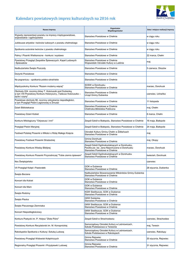 Kalendarz powiatowych imprez kulturalnych na 2016 rok Nazwa imprezy Organizator Współorganizator Data i miejsce realizacji imprezy Wyjazdy reprezentacji powiatu na imprezy międzypowiatowe, wojewódzkie i ogólnopolskie Starostwo Powiatowe w Chełmie w ciągu roku Jubileusze artystów i twórców ludowych z powiatu chełmskiego Starostwo Powiatowe w Chełmie w ciągu roku Spotkania autorskie twórców z powiatu chełmskiego Starostwo Powiatowe w Chełmie w ciągu roku Palmy i Pisanki Wielkanocne - konkurs i wystawa Starostwo Powiatowe w Chełmie 22 marca, Chełm Powiatowy Przegląd Zespołów Śpiewaczych, Kapel Ludowych i Śpiewaków Starostwo Powiatowe w Chełmie Wojewódzki Ośrodek Kultury w Lublinie maj Nadbużańskie Święto Pszczoły Starostwo Powiatowe w Chełmie 5 czerwca, Okszów Dożynki Powiatowe Starostwo Powiatowe w Chełmie Na pograniczu - spotkania polsko-ukraińskie Starostwo Powiatowe w Chełmie Międzyszkolny Konkurs "Razem możemy więcej" SOSW w Dorohusku Starostwo Powiatowe w Chełmie marzec, Dorohusk Obchody 224. rocznicy bitwy T. Kościuszki pod Dubienką, w tym VIII Powiatowy Konkurs Historyczny „Tadeusz Kościuszko – życie i czyny” Starostwo Powiatowe w Chełmie Urząd Gminy Dubienka czerwiec, Uchańka Powiatowe obchody 98. rocznicy odzyskania niepodległości, w tym Przegląd Pieśni Legionowej w Żmudzi Starostwo Powiatowe w Chełmie 11 listopada Dzień Bibliotekarza Starostwo Powiatowe w Chełmie Chełmska Biblioteka Publiczna maj, Chełm Powiatowy Dzień Kobiet Starostwo Powiatowe w Chełmie 8 marca, Chełm Konkurs Mitologiczny "Odyseusz i inni" Zespół Szkół w Białopolu, Starostwo Powiatowe w Chełmie 16 maja, Białopole Przegląd Pieśni Maryjnej Zespół Szkół w Białopolu, Starostwo Powiatowe w Chełmie 24 maja, Białopole Festiwal Polskiej Piosenki o Miłości o Różę Małego Księcia Ośrodek Kultury Gminy Chełm w Żółtańcach Starostwo Powiatowe w Chełmie maj Powiatowy Festiwal Piosenki Strażackiej Gmina Dorohusk Starostwo Powiatowe w Chełmie maj, Okopy Powiatowy Konkurs Wiedzy Biblijnej Zespół Szkół Ogólnokształcących w Dorohusku, Parafia pw. św. Jana Nepomucena w Dorohusku Starostwo Powiatowe w Chełmie marzec, Dorohusk Powiatowy Konkurs Piosenki Przyrodniczej "Tobie ziemio śpiewam" Zespół Szkół Ogólnokształcących w Dorohusku Starostwo Powiatowe w Chełmie kwiecień, Dorohusk Noc Świętojańska czerwiec VII Przegląd Kolęd i Pastorałek GOK w Dubience Starostwo Powiatowe w Chełmie Święto Bociana Nadbużańskie Stowarzyszenie Miłośników Gminy Dubienka Starostwo Powiatowe w Chełmie Koncert dla Kobiet GOK w Dubience Starostwo Powiatowe w Chełmie Koncert dla Mam GOK w Dubience Starostwo Powiatowe w Chełmie Święto Rodziny KGW Siedliszcze, GOK w Dubience Starostwo Powiatowe w Chełmie Święto Placka GKW Dubienka Starostwo Powiatowe w Chełmie Święto Pieczonego Ziemniaka GKW Siedliszcze, GOK w Dubience Starostwo Powiatowe w Chełmie Koncert Niepodległościowy GKW Siedliszcze, GOK w Dubience Starostwo Powiatowe w Chełmie Konkurs Poetycki im. P. Hołysz "Złote Pióro" Zespół Szkół w Strachosławiu czerwiec, Strachosław Powiatowy Konkurs Recytatorski im. M. Konopnickiej Samorządowy Ośrodek Kultury w Leśniowicach, Szkoła Podstawowa w Teresinie maj, Teresin Rakołupskie Spotkania z Kulturą i Sztuką Ludową Samorządowy Ośrodek Kultury w Leśniowicach, Szkoła Podstawowa w Rakołupach czerwiec, Rakołupy Powiatowy Przegląd Widowisk Kolędniczych Gmina Rejowiec Starostwo Powiatowe w Chełmie 20 stycznia, Rejowiec Regionalny Przegląd Piosenki i Przyśpiewki Ludowej Gmina Rejowiec Starostwo Powiatowe w Chełmie 31 stycznia, Rejowiec 28 stycznia, Dubienka Przegląd Piosenki Dziecięcej „Śpiewający słowik” Gmina Rejowiec Starostwo Powiatowe w Chełmie kwiecień, Rejowiec Jesienny Konkurs Recytatorski Gmina Rejowiec Starostwo Powiatowe w Chełmie Rejowiec Powiatowy Przegląd Widowisk Obrzędowych Gmina Rejowiec Starostwo Powiatowe w Chełmie Rejowiec Jarmark Pawłowski – Ginące Zawody Gmina Rejowiec Fabryczny, GOK w Pawłowie Starostwo Powiatowe w Chełmie sierpień, Pawłów Nadbużańska Akademia Smaku Starostwo Powiatowe w Chełmie, Gminny Ośrodek Kultury w Rudzie-Hucie sierpień, Hniszów II Powiatowy Przegląd Poezji Śpiewanej "Wyśpiewać poezję" Gminny Ośrodek Kultury w Sawinie, Zespół Szkół w Sawinie październik, Sawin Starostwo Powiatowe w Chełmie Powiatowy Konkurs „Jan Paweł II" Zespół Szkół w Siedliszczu Starostwo Powiatowe w Chełmie grudzień, Siedliszcze Konkurs Poetycki im. Wacława Iwaniuka GOK w Siedliszczu Starostwo Powiatowe w Chełmie Siedliszcze Powiatowy Przegląd Piosenki Dziecięcej Stowarzyszenie na Rzecz Dziedzictwa, Rozwoju i Integracji Społecznej Wojsławic "Szansa" Starostwo Powiatowe w Chełmie czerwiec, Wojsławice XV Przegląd Pieśni Religijnej "Na zawsze chcę Tobie grać i śpiewać Panie" Parafia pw. św. Michała Archanioła w Wojsławicach Starostwo Powiatowe w Chełmie czerwiec, Wojsławice Powiatowy Przegląd Pieśni Poezji Powstańczej i Patriotycznej Zespół Szkół Publicznych w Wojsławicach Starostwo Powiatowe w Chełmie 22 marca, Wojsławice Dni Jakuba Wędrowycza Gminne Centrum Kultury w Wojsławicach Starostwo Powiatowe w Chełmie Wojsławice Festiwal Piosenki Angielskiej Szkoła Podstawowa w Żmudzi Starostwo Powiatowe w Chełmie Żmudź II Jarmark Aktywności Kobiet Gminne Centrum Kultury w Żmudzi, Stowarzyszenie Wspierania Aktywności Społecznej Stella Starostwo Powiatowe w Chełmie Żmudź Ogólnopolski Turniej Wiedzy Pożarniczej Związek Ochotniczych Straży Pożarnych Starostwo Powiatowe w Chełmie marzec, Chełm Gala i Bal Sołtysów Redakcja Super Tydzień Chełmski Starostwo Powiatowe w Chełmie 5.02.2016 Plebiscyt Super Baby Redakcja Super Tydzień Chełmski Starostwo Powiatowe w Chełmie grudzień, Chełm Ogólnopolski Konkurs Plastyczny „W trosce o nasze bezpieczeństwo” Komenda Główna PSP Starostwo 